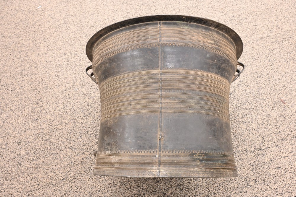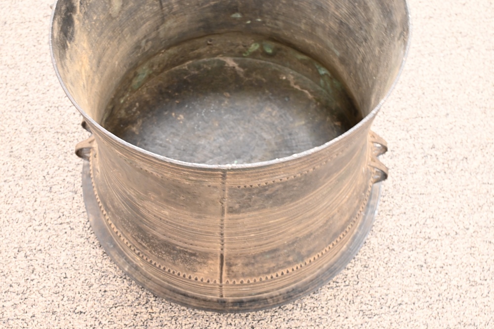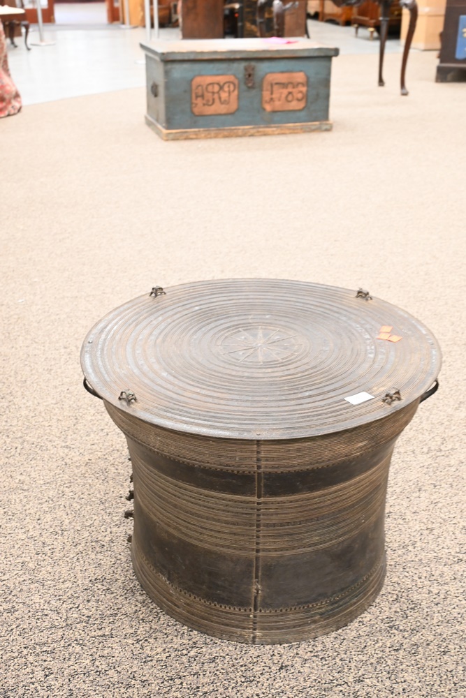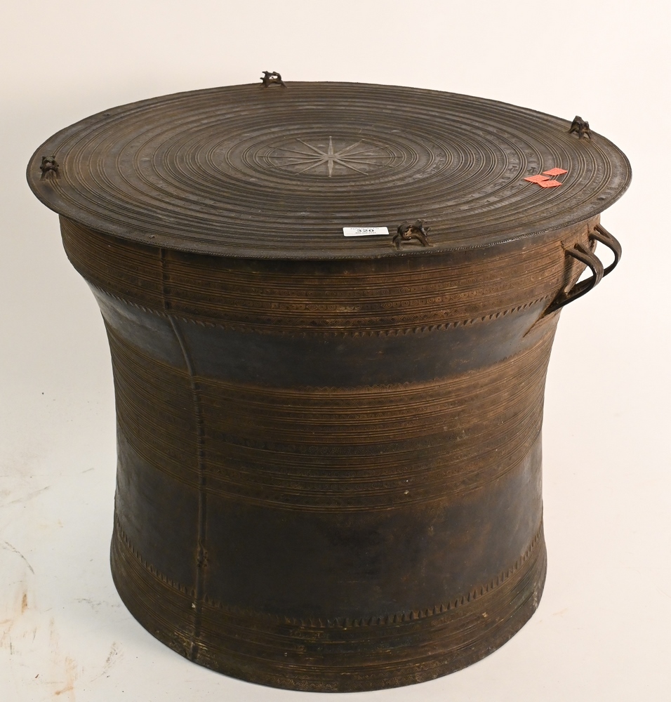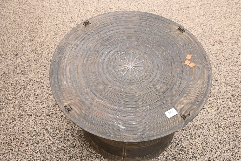 Lot 320: Southeast Asian Bronze Rain Drum Table having four frog finial top height 18 inches,top diameter 24 1/4 inches