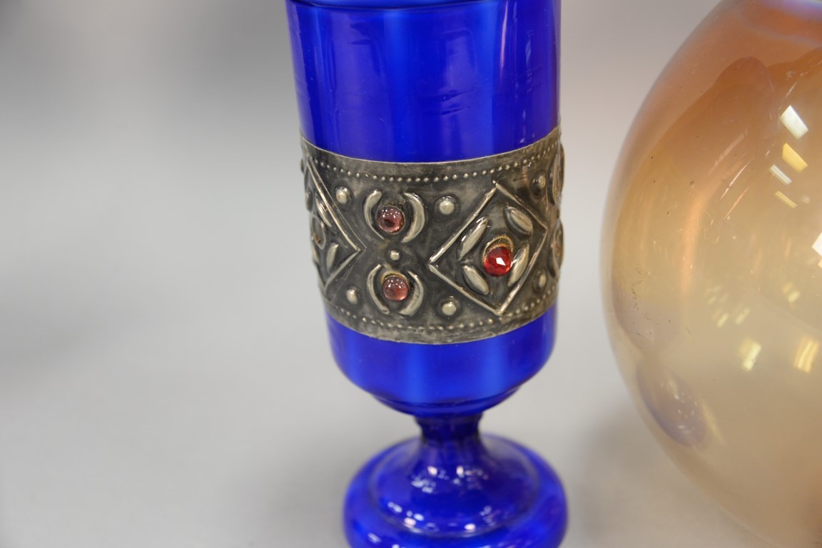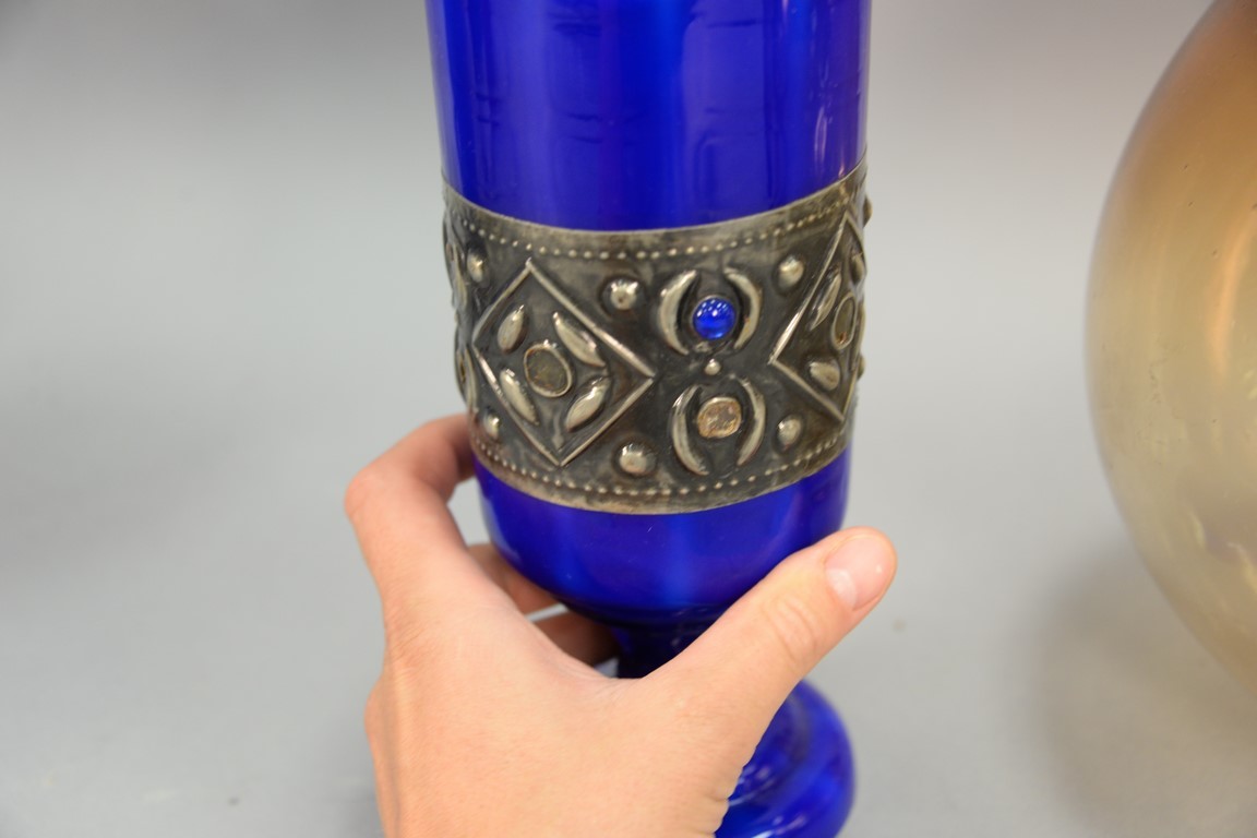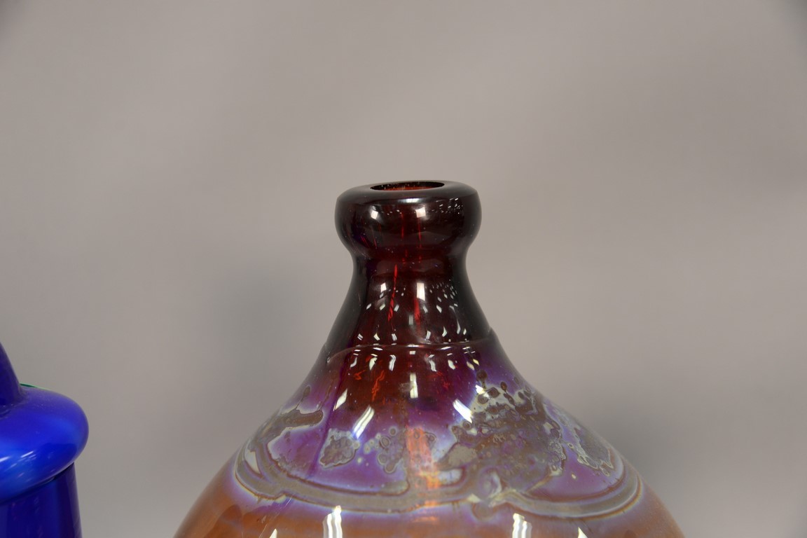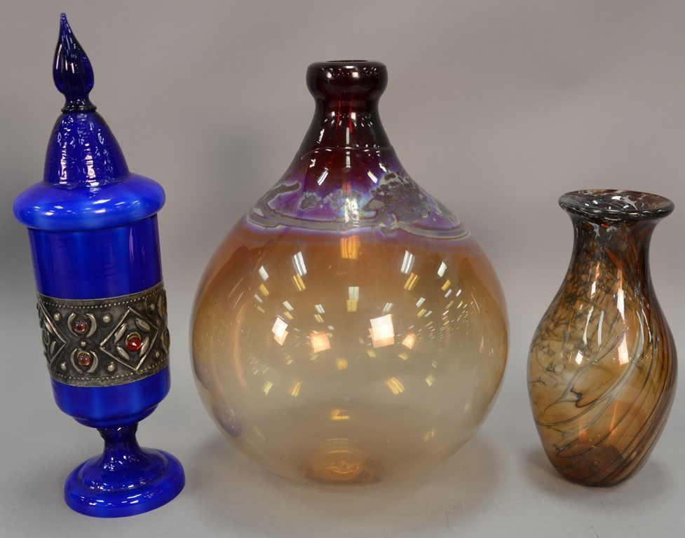 Three art glass pieces to include James Clarke art glass brown/white vase signed James Clarke Studio 1979 on bottom, J. Prem Studios art glass vase signed J Prem 1977 on bottom and a blue art glass covered urn with jeweled silver band. ht. 9 1/2in., 13 1/2in., 15 1/2in.
