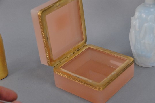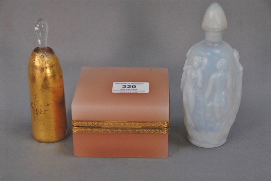 Three piece group to include French pink opaline ormolu mounted box ht. 2 1/2 in., Sabino opalescent artglass perfume ht. 5 in., and a gilt perfume signed on bottom ht. 6 in.
