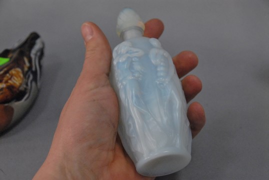 Lot 320: Three piece group to include French pink opaline ormolu mounted box ht. 2 1/2 in., Sabino opalescent artglass perfume ht. 5 in., and…