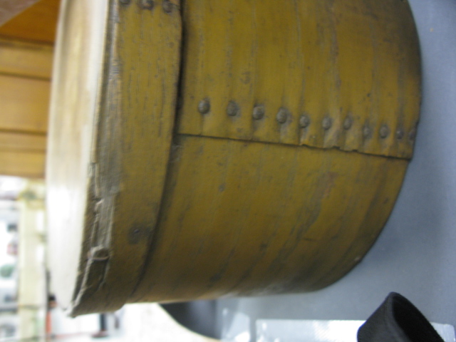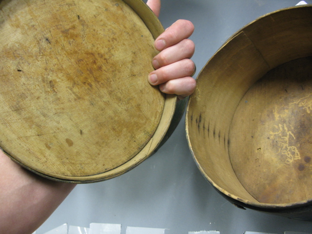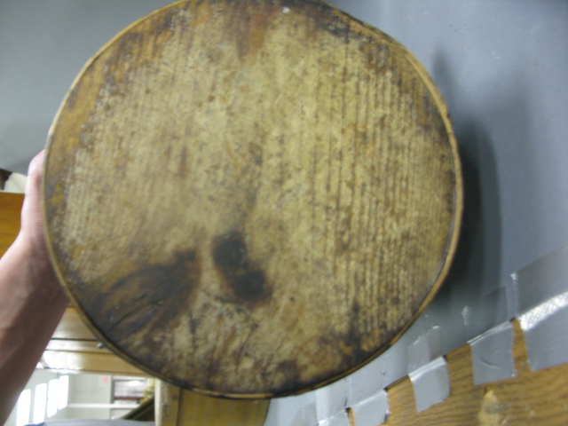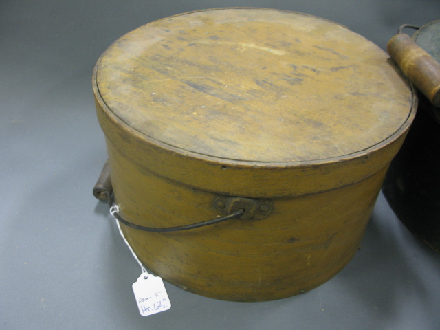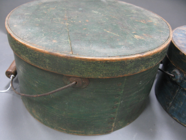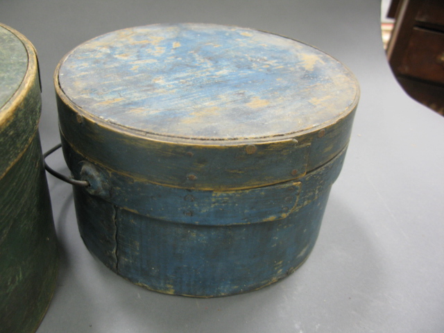 Three primitive round wooden covered boxes with handles, one blue, one green, one brown paint.