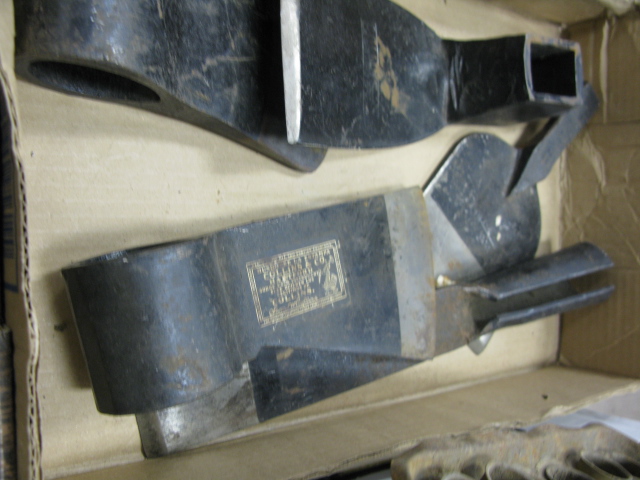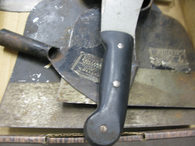 Two box lots of various Collins Company tools axe heads, knives, scrapers mostly with Collins Company paper labels on tools and some are stamped.