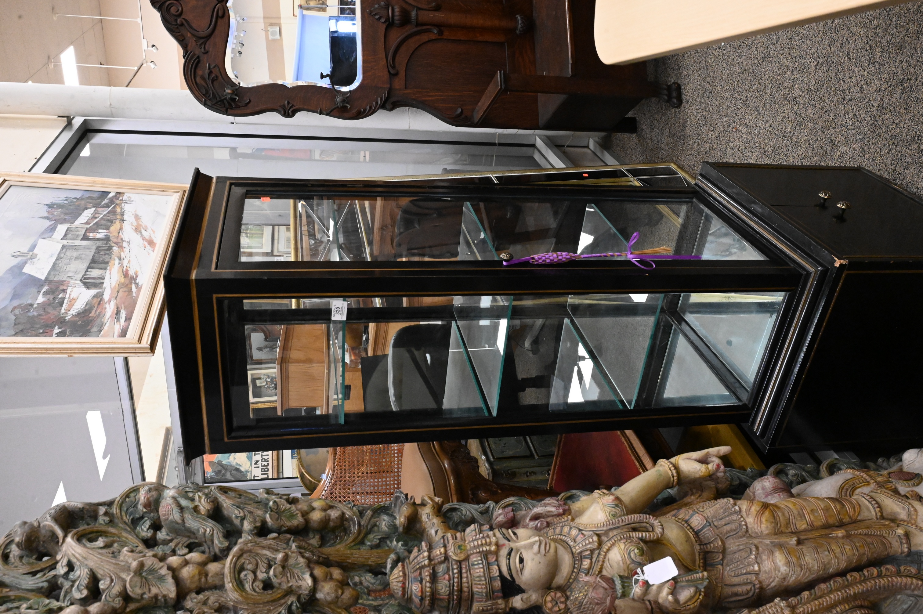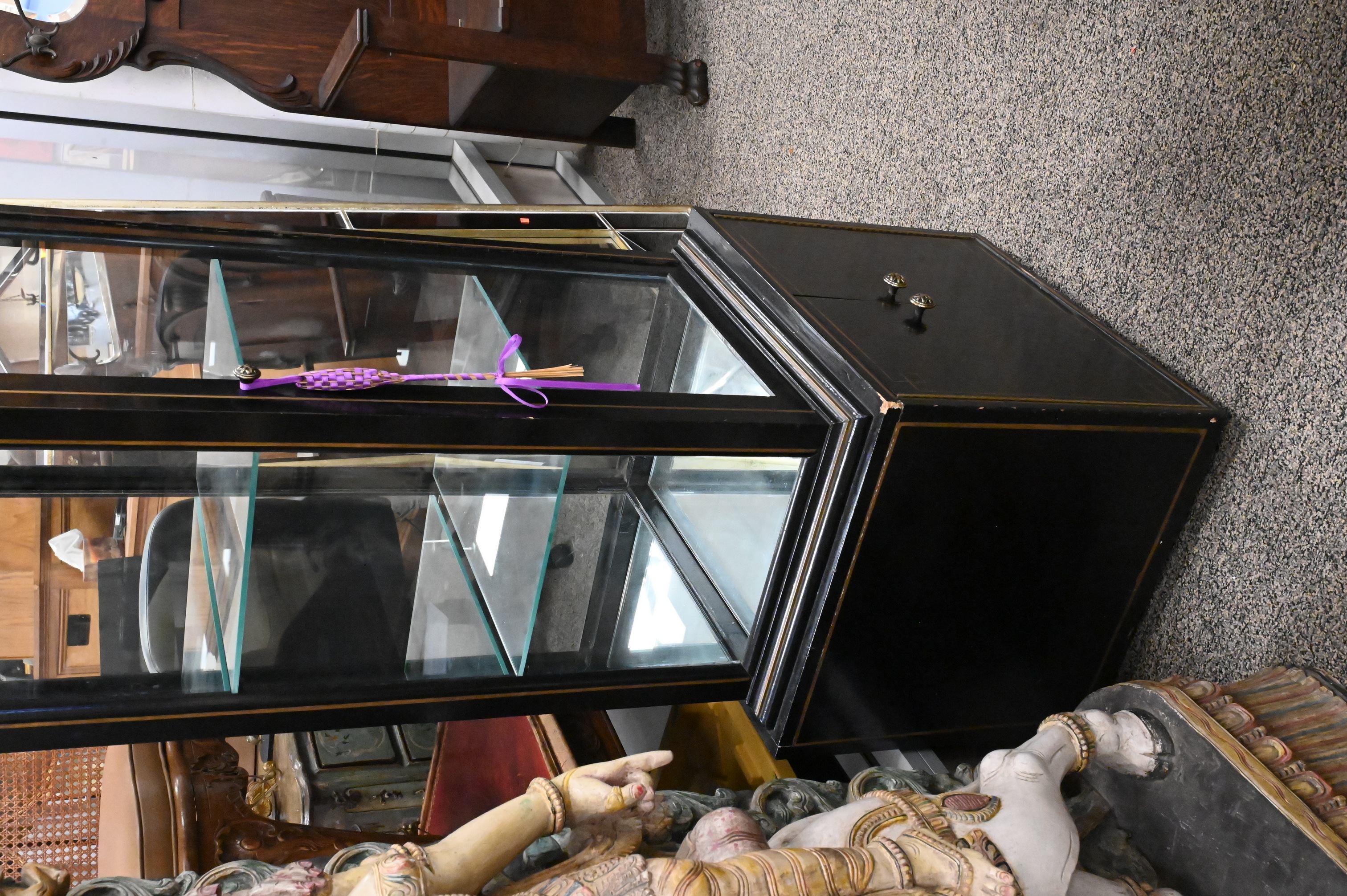 to include contemporary Chinoiserie style display cabinet having three glass shelves and mirrored interior, black painted exterior with button doors and gilt accents