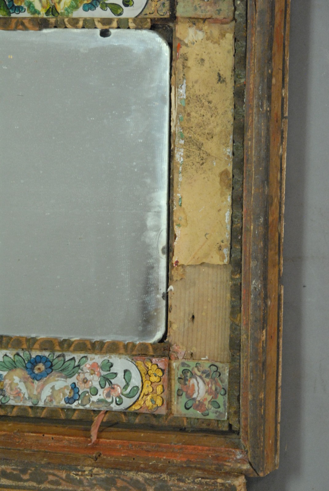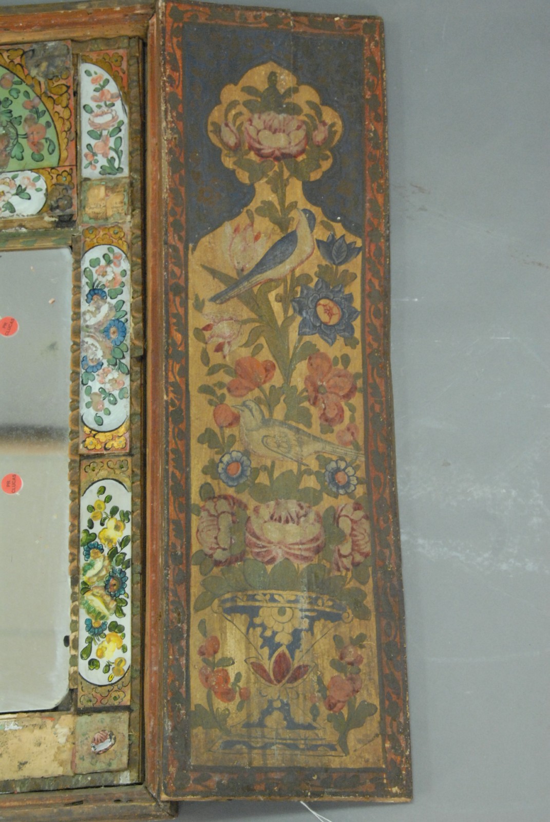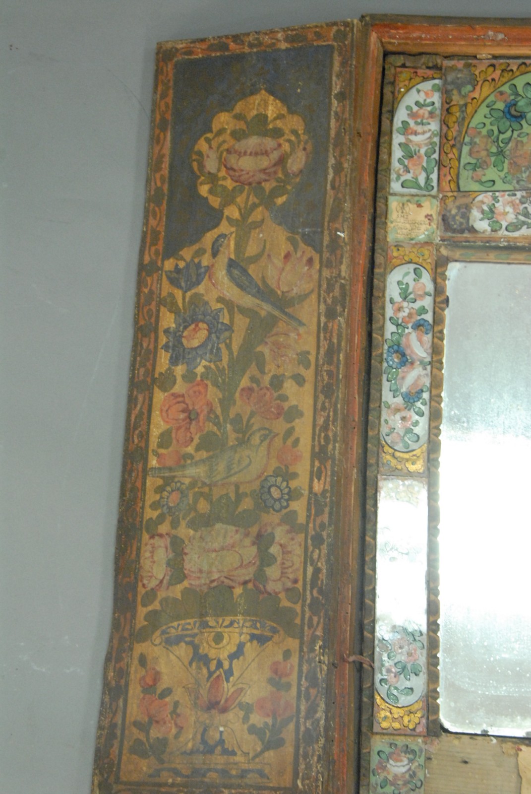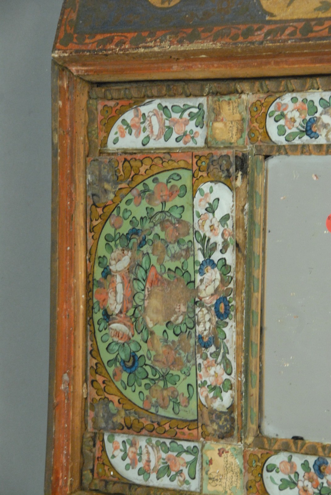 18th century courting mirror with two doors having original paint with flowers and birds inside, reverse painted frame on mirror backed by newspaper with Arabic writing, partially as is.
