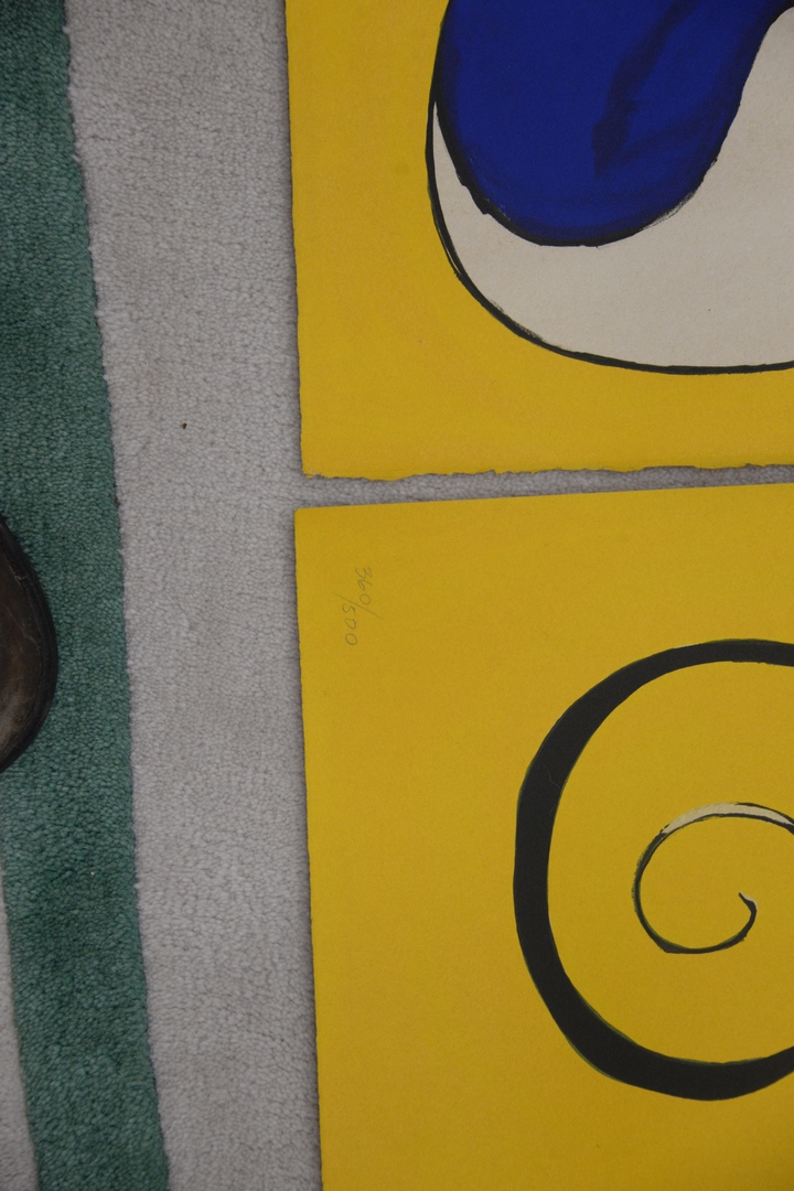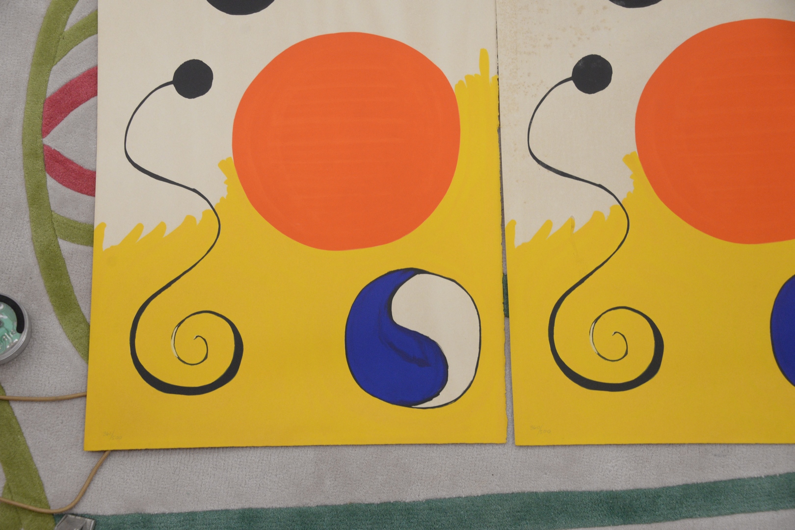 Lot 321: After Alexander Calder (American, 1898 – 1976), Pair of Red Sphere on Yellow Ground, lithograph on colors on paper (each), circa 1970’s, heavily toned, both editioned in pencil out of 300, lower right, height 29 3/4″ x 22″ (sheet, each).