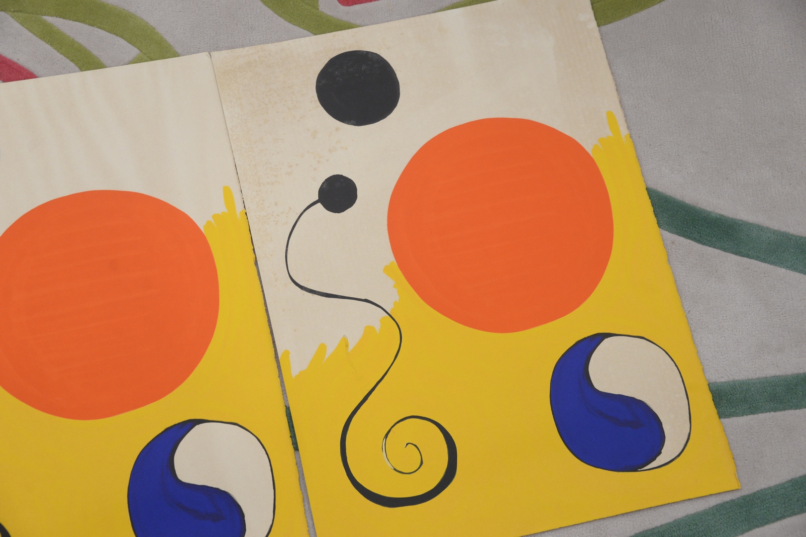 After Alexander Calder (American, 1898 – 1976), Pair of Red Sphere on Yellow Ground, lithograph on colors on paper (each), circa 1970’s, heavily toned, both editioned in pencil out of 300, lower right, height 29 3/4″ x 22″ (sheet, each).