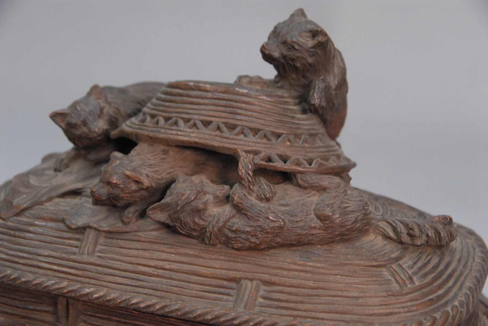 Black forest jewel box with hinged top mounted with four kittens under basket all set of scrolled feet. ht. 8 1/2in., lg. 14 1/4in.