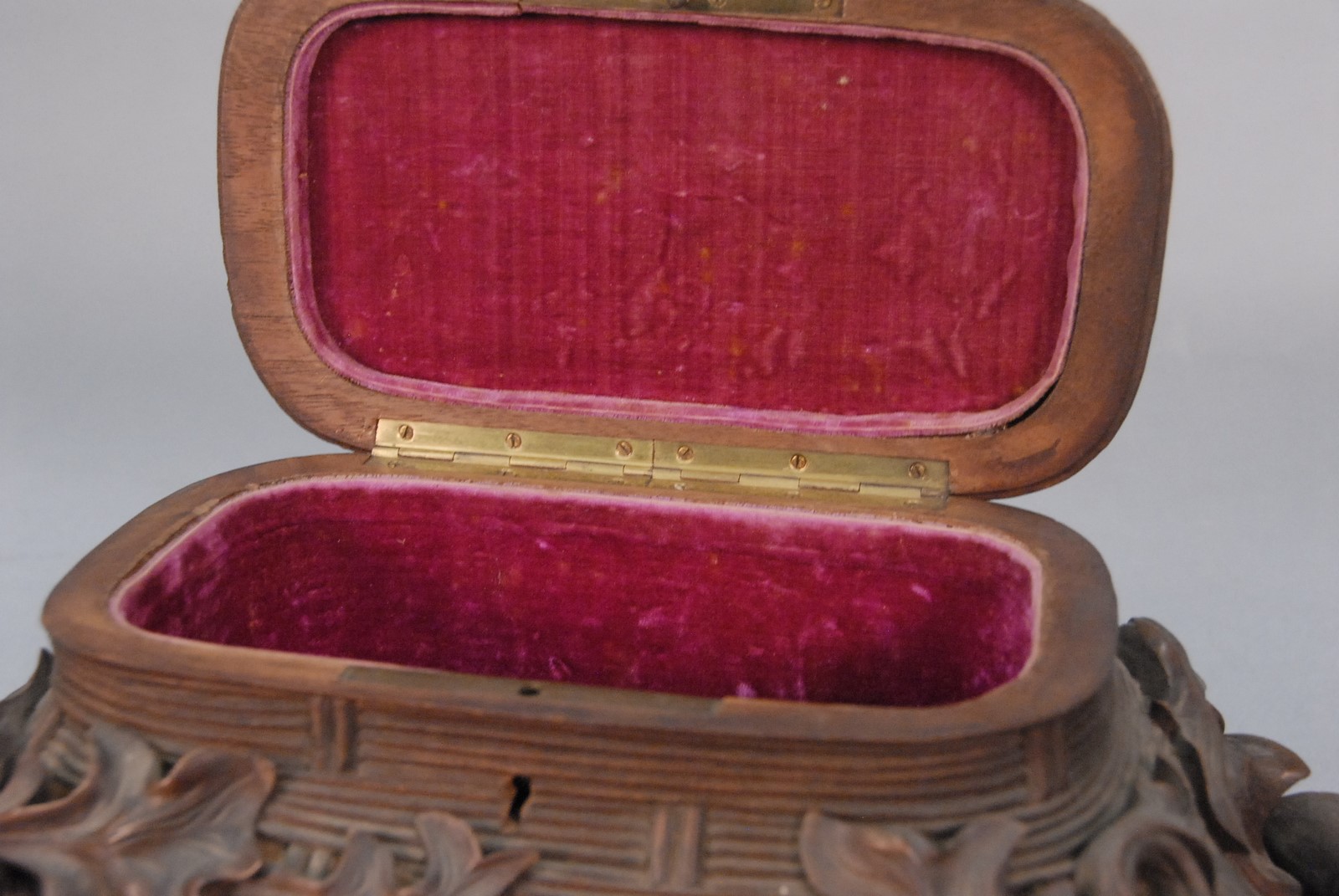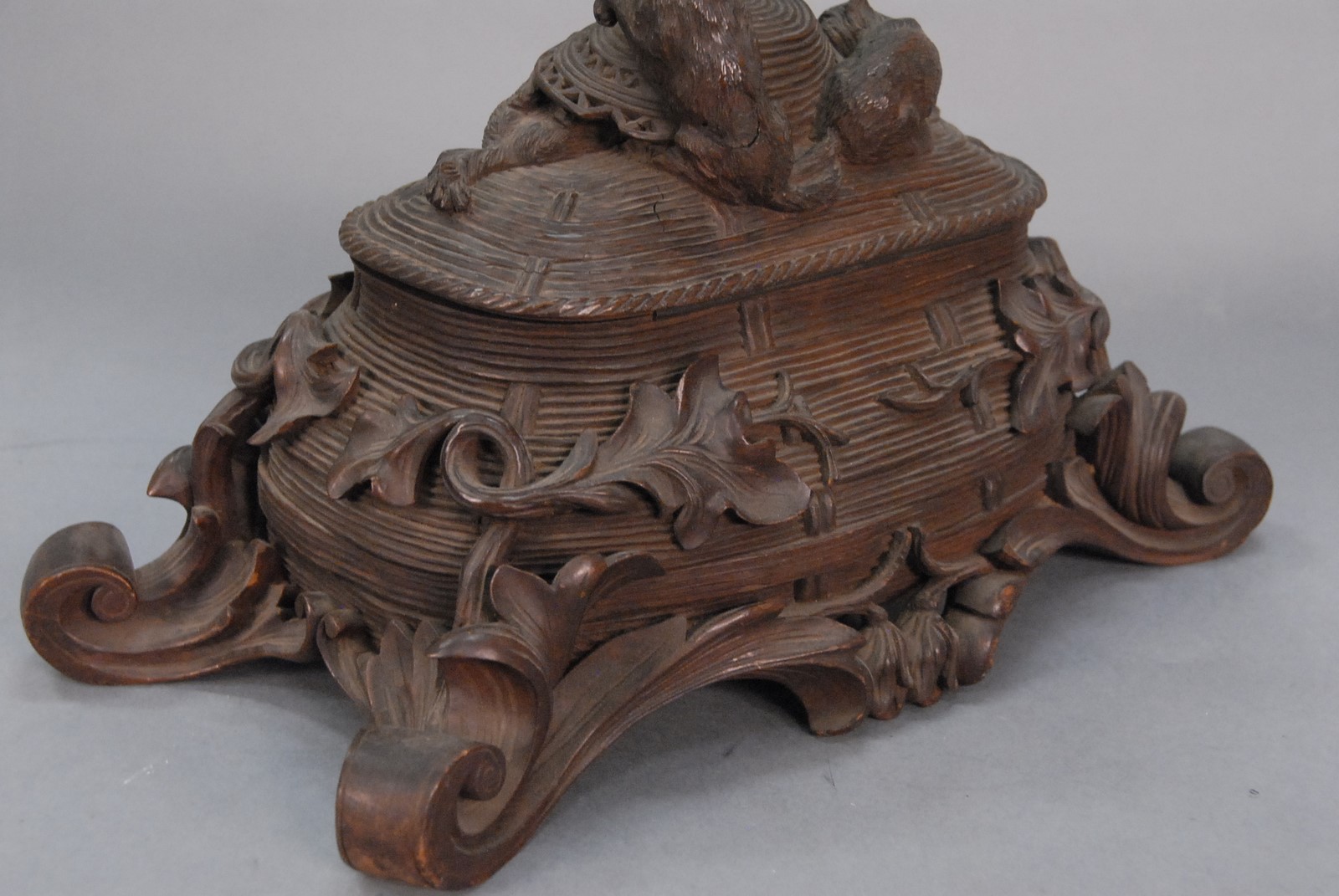 Lot 321: Black forest jewel box with hinged top mounted with four kittens under basket all set of scrolled feet. ht. 8 1/2in., lg. 14 1/4in.