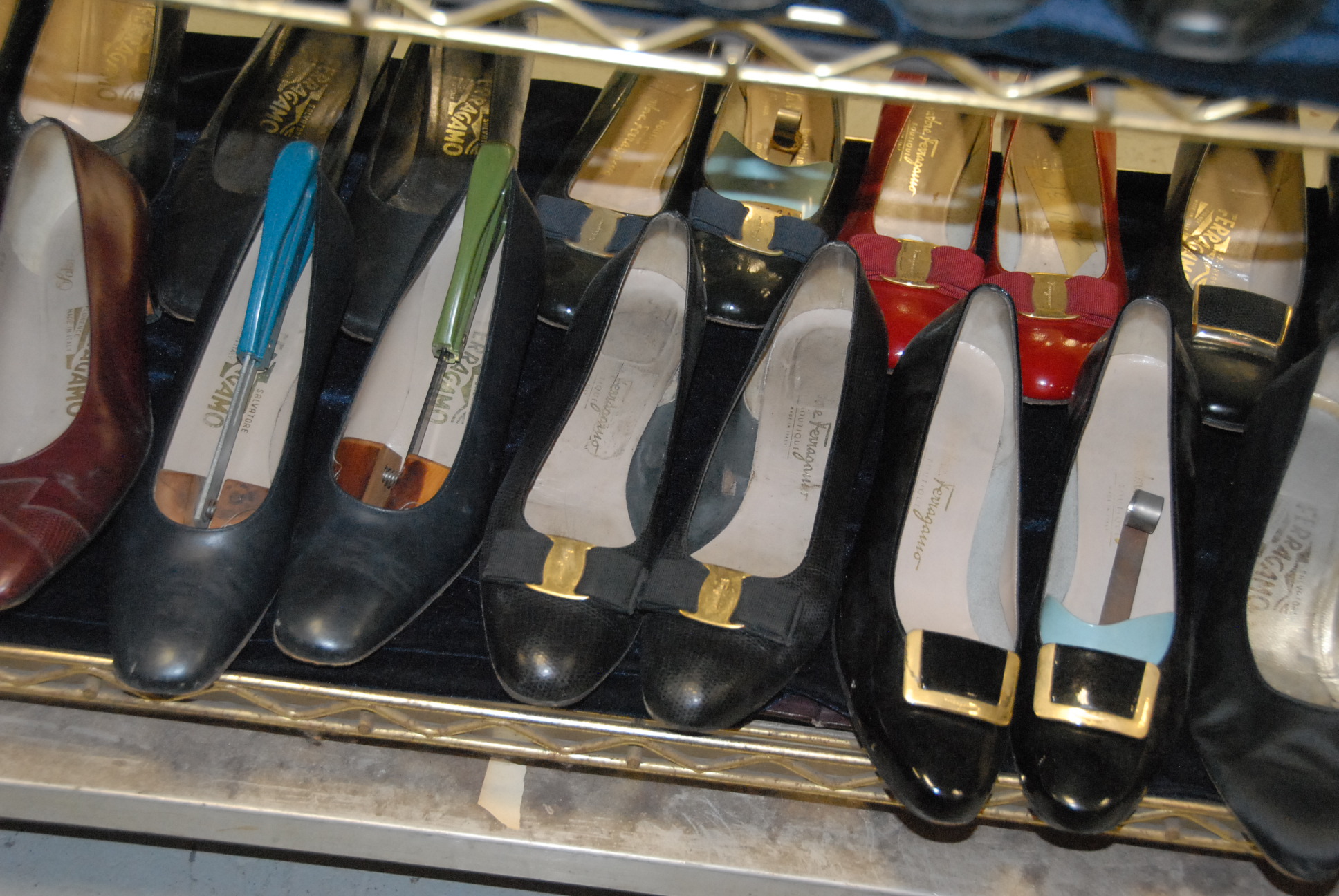 Eighteen pairs of woman’s shoes, mostly Ferragamos worn.