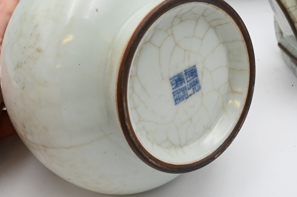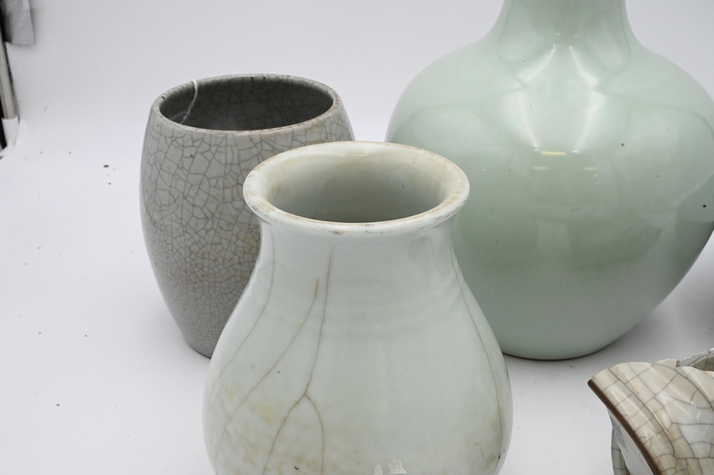 Five Piece Chinese Celadon Glazed Vases, globular vase, crackle glazed vase (as is), along with a bowl with incised lotus flower side, vase heights 14, 7 and 6 3/4 inches; bowl diameter 9 1/2 inches.