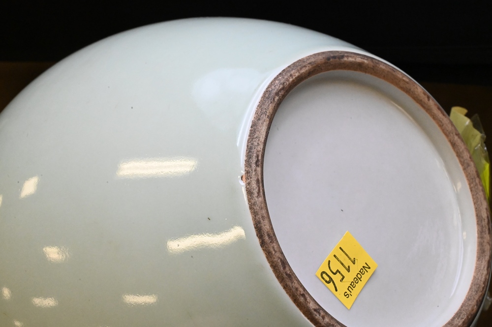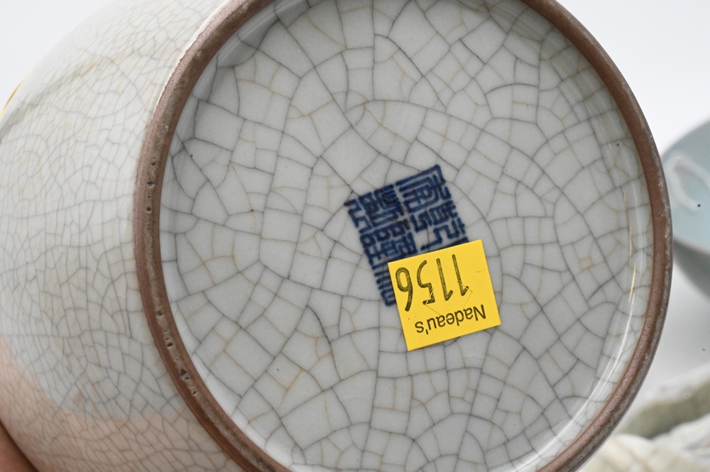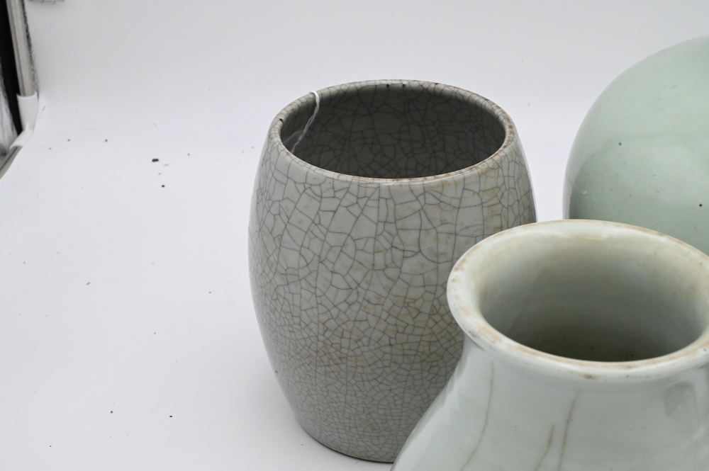 Lot 321: Five Piece Chinese Celadon Glazed Vases, globular vase, crackle glazed vase (as is), along with a bowl with incised lotus flower side, vase heights 14, 7 and 6 3/4 inches; bowl diameter 9 1/2 inches.