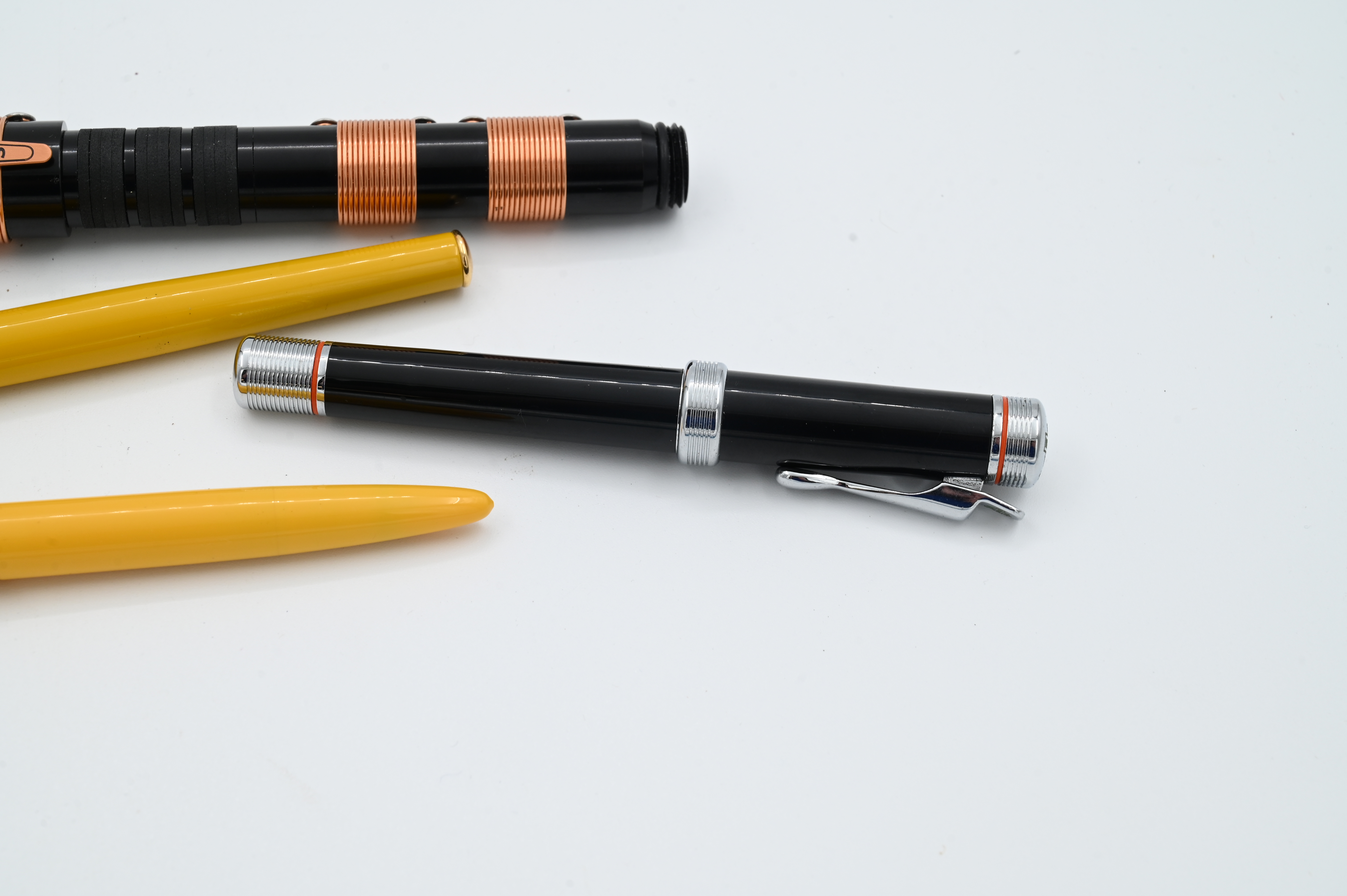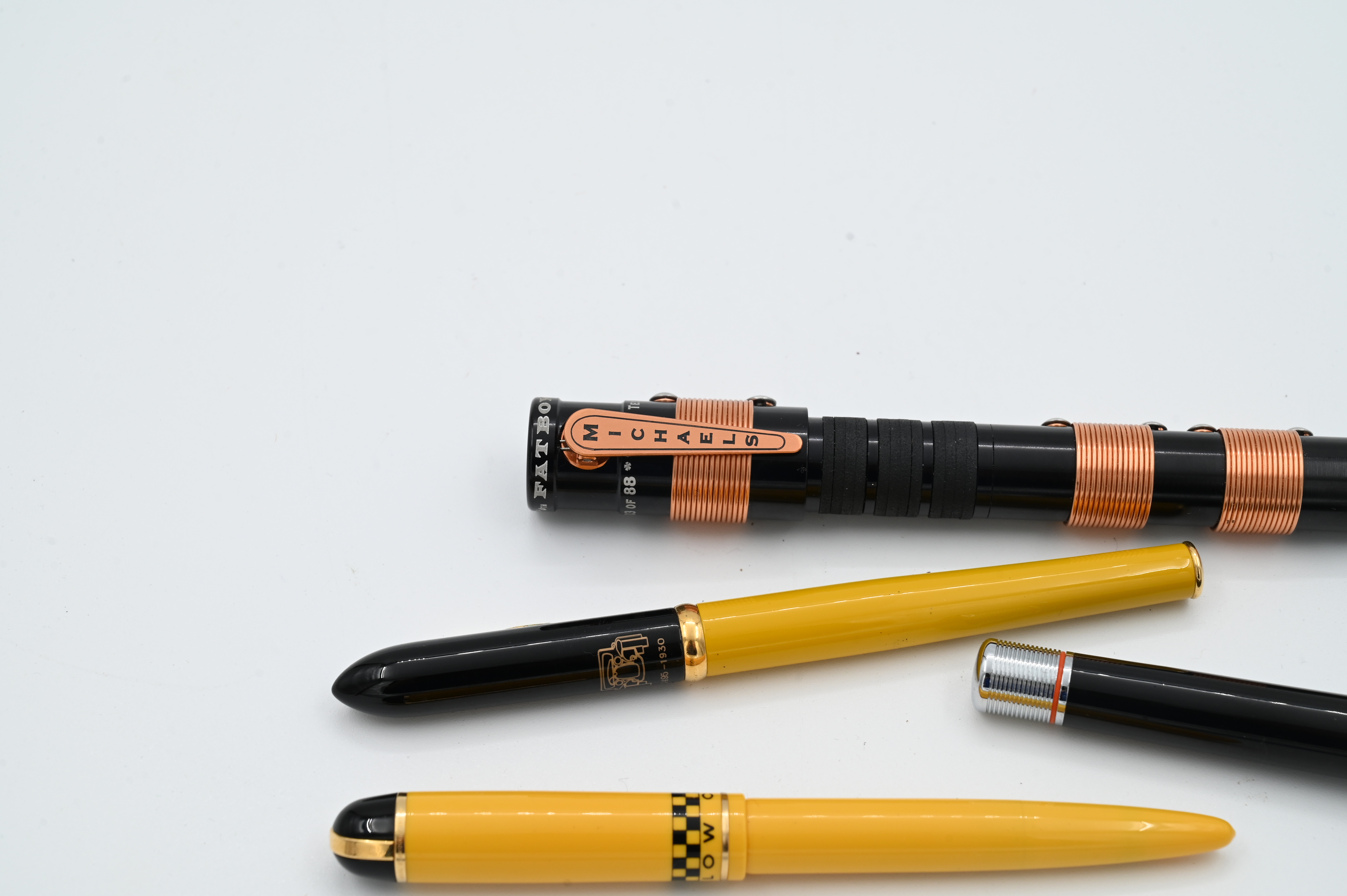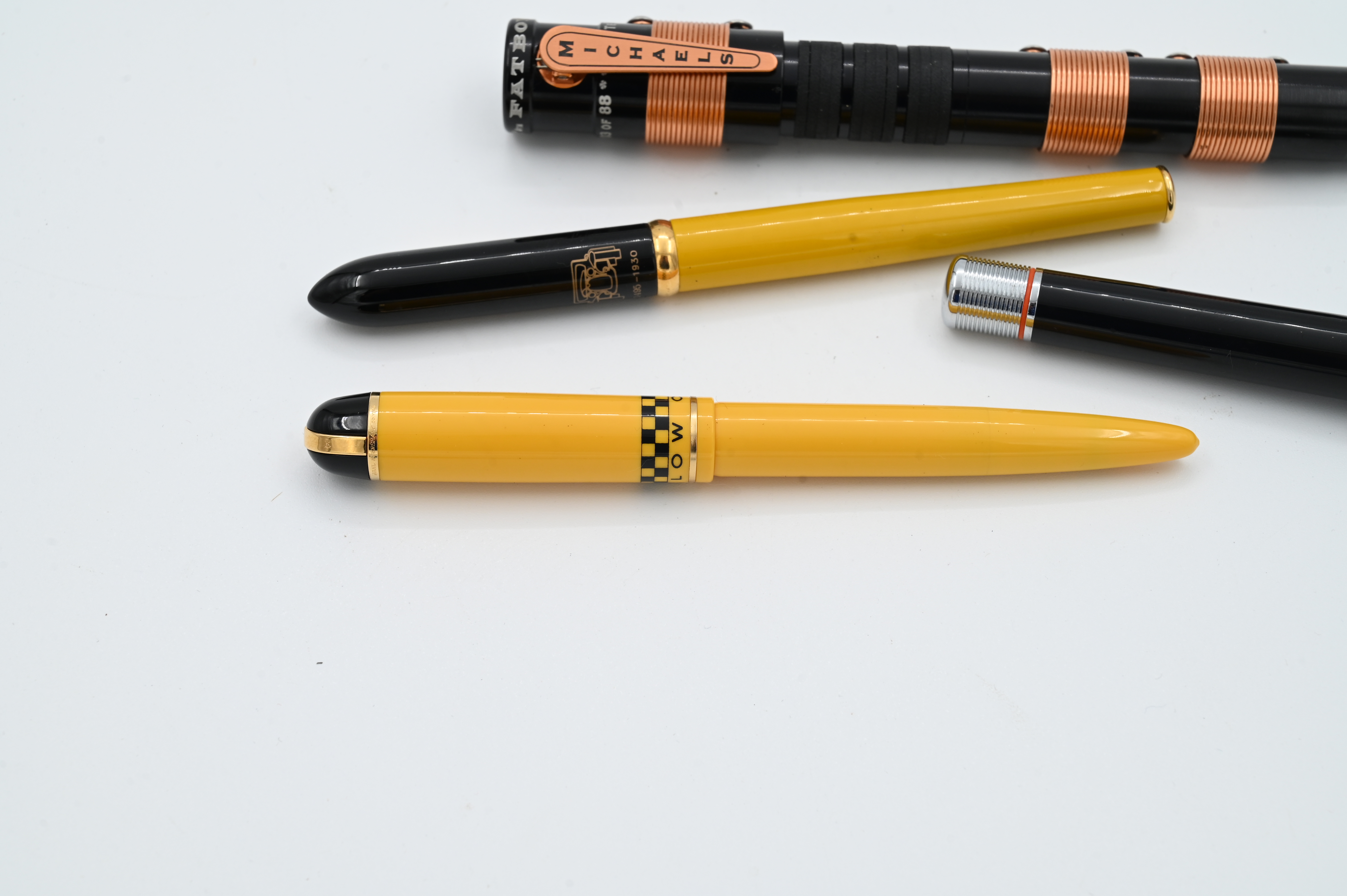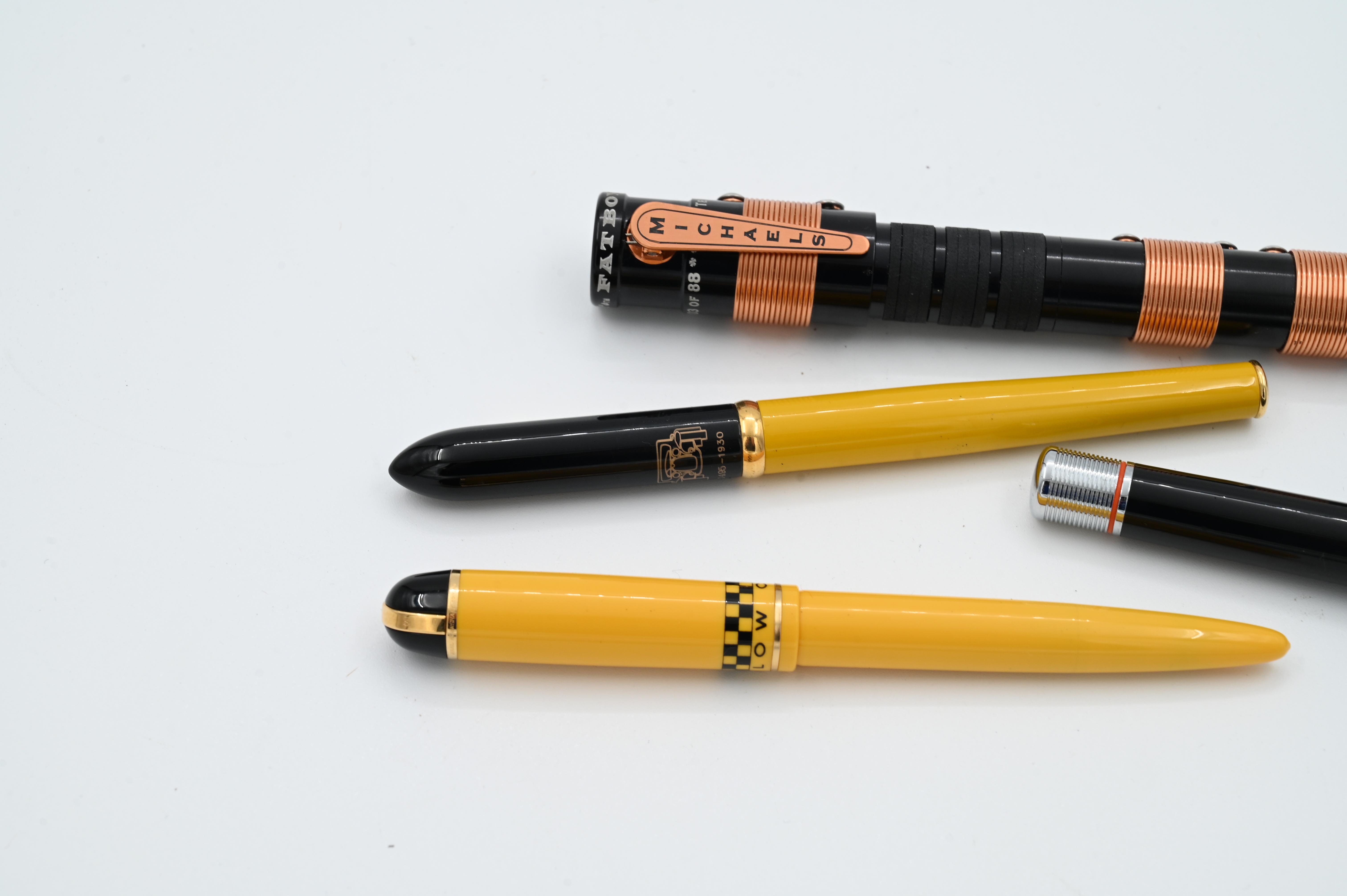 to include Michael’s Fatboy High Voltage Tesla Coil ball point pen limited edition number 3/88, Harley Davidson fountain pen, Wahl Eversharp skyline yellow cab taxi fountain pen having 14k gold nib