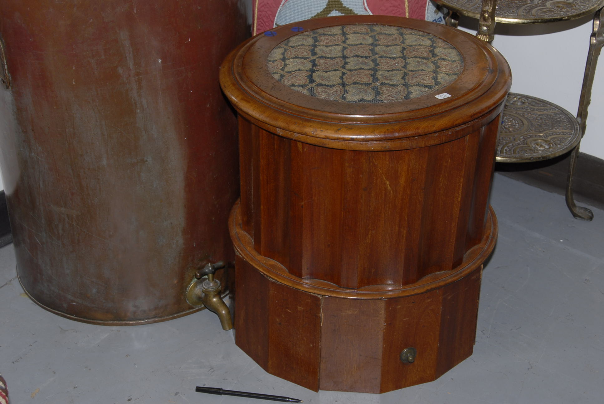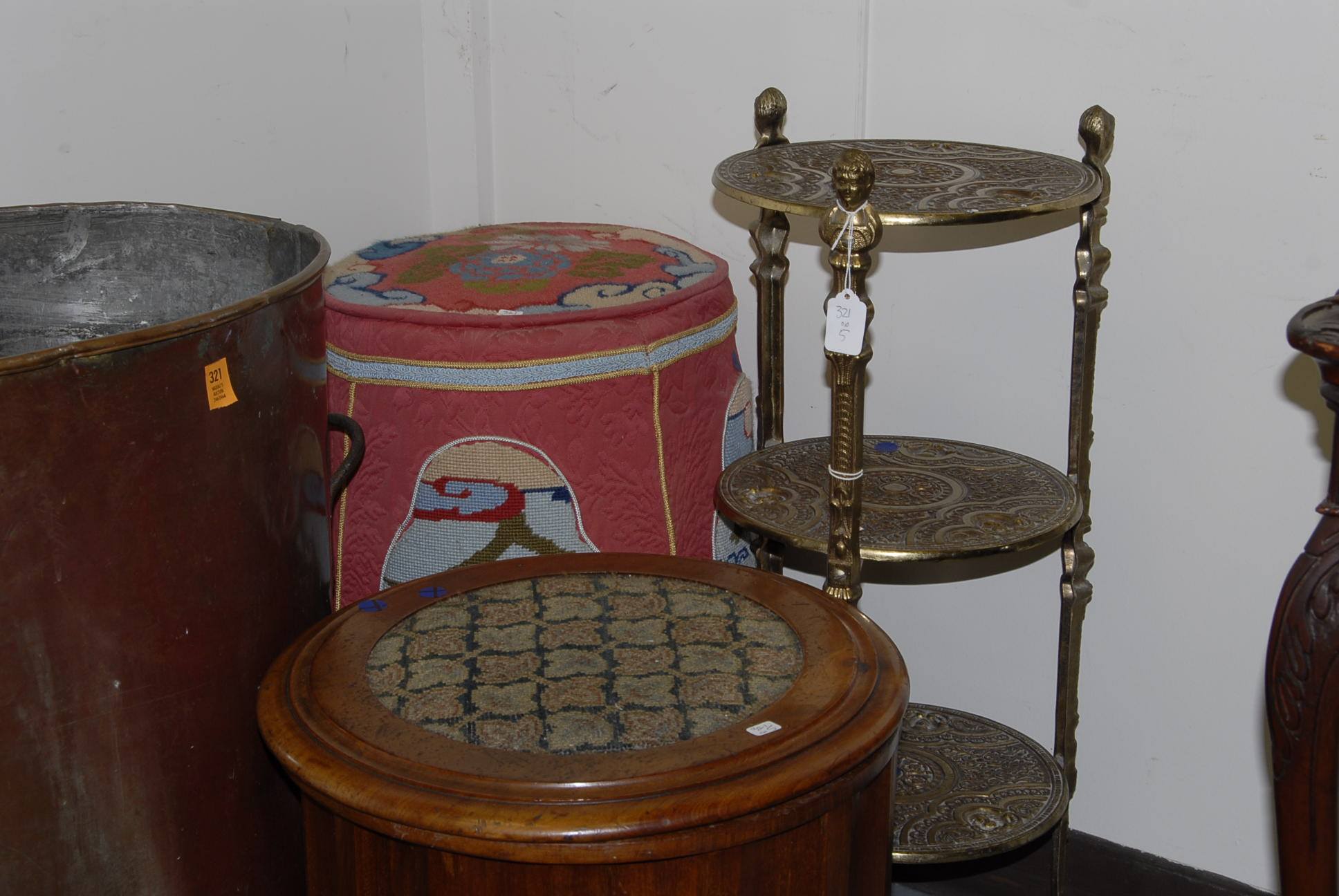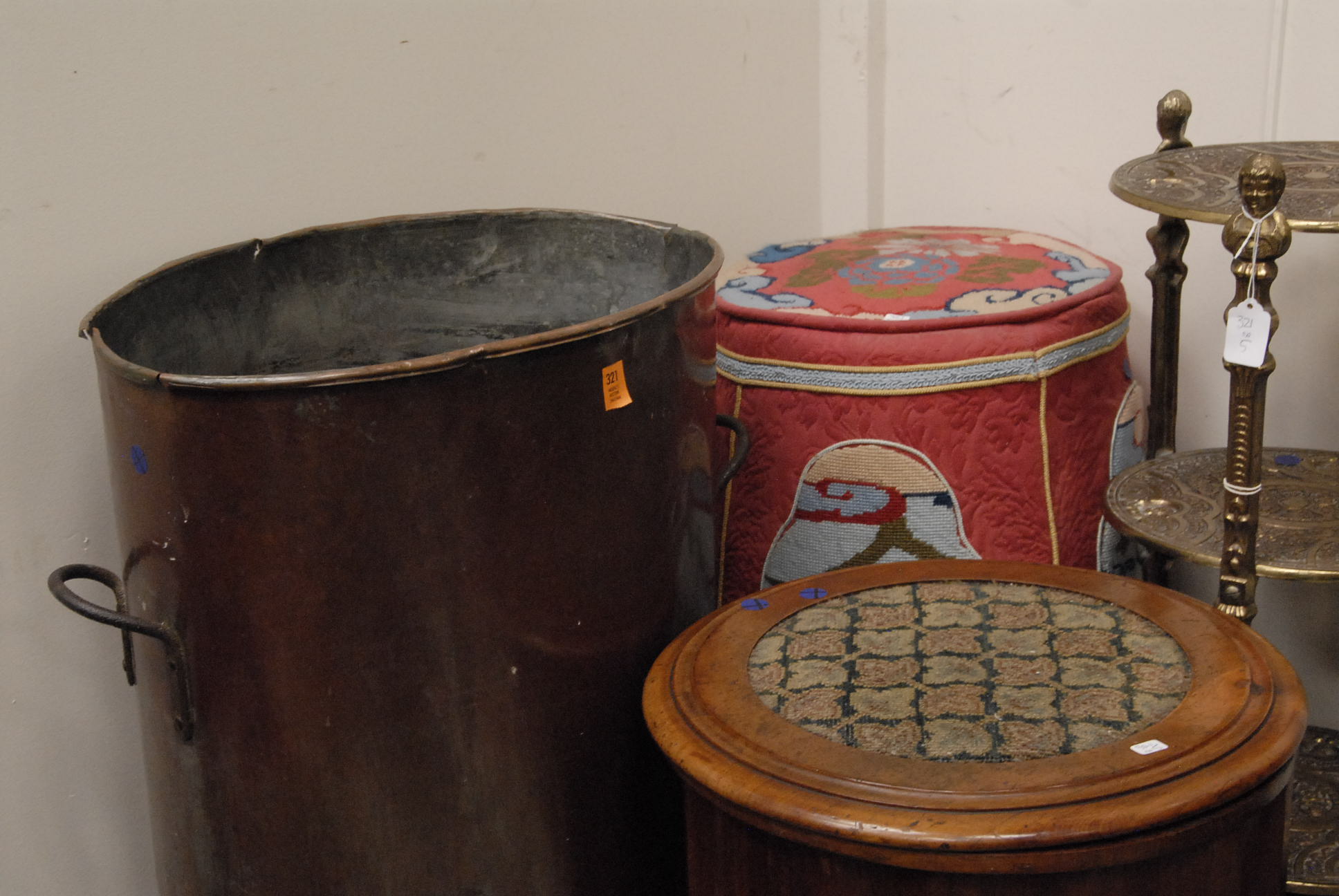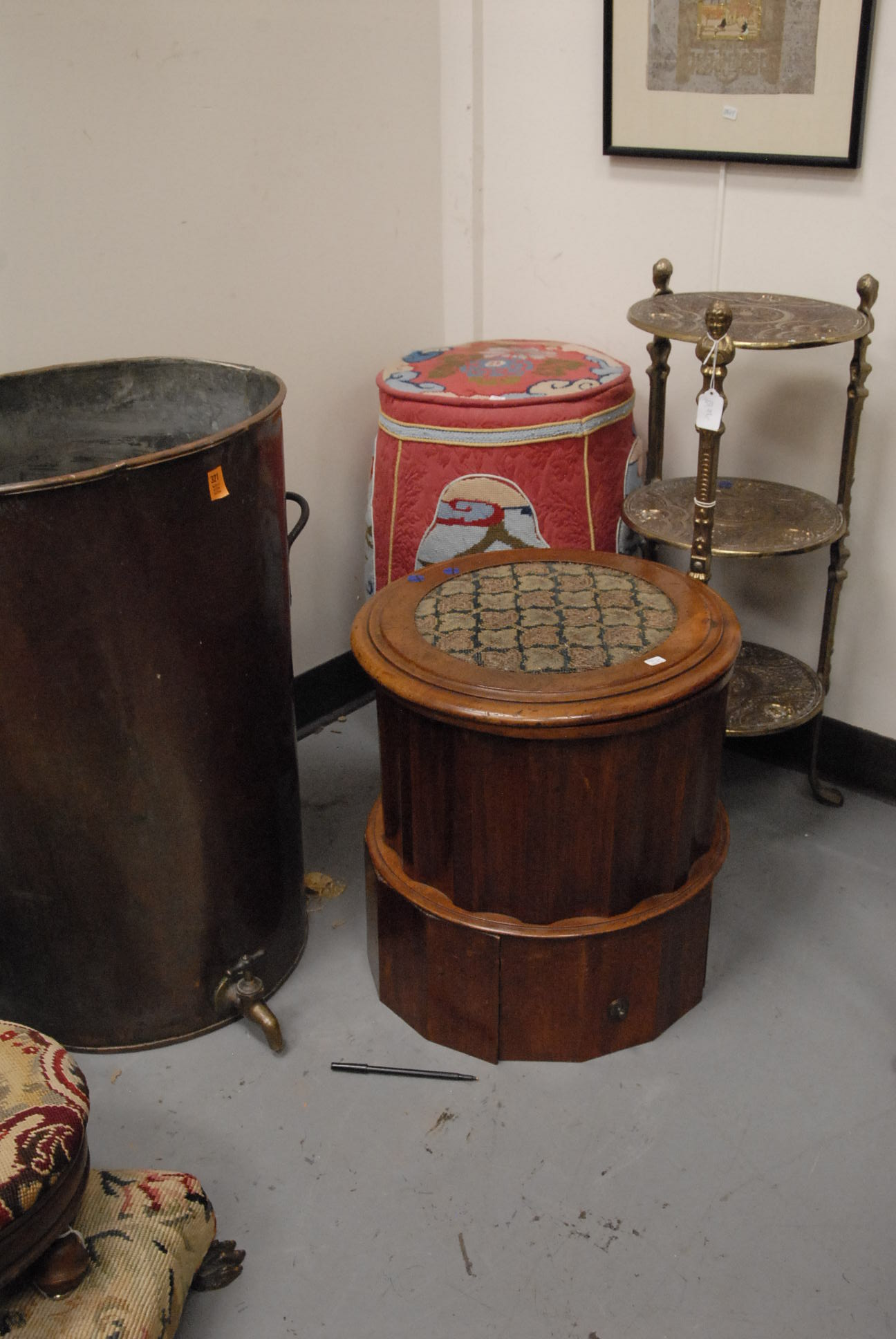 Four piece group lot to include a large copper bucket with a spigot, an early potty, a three tiered chair shelf and a cloth covered seat