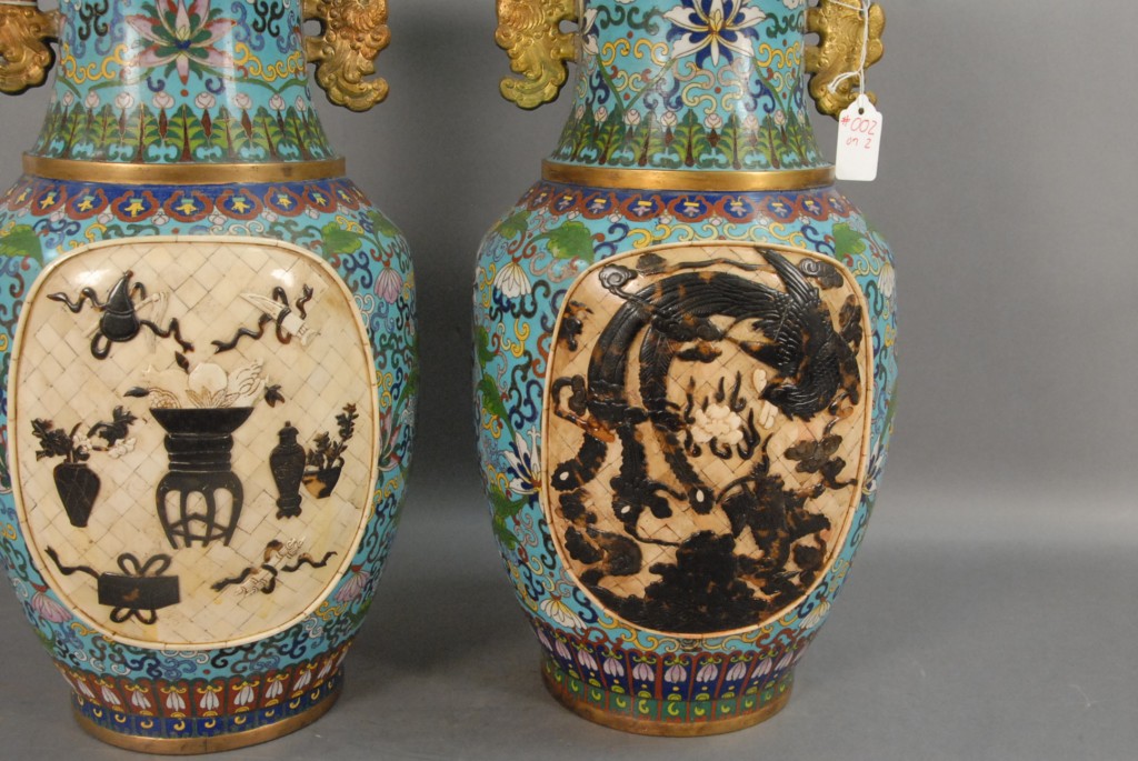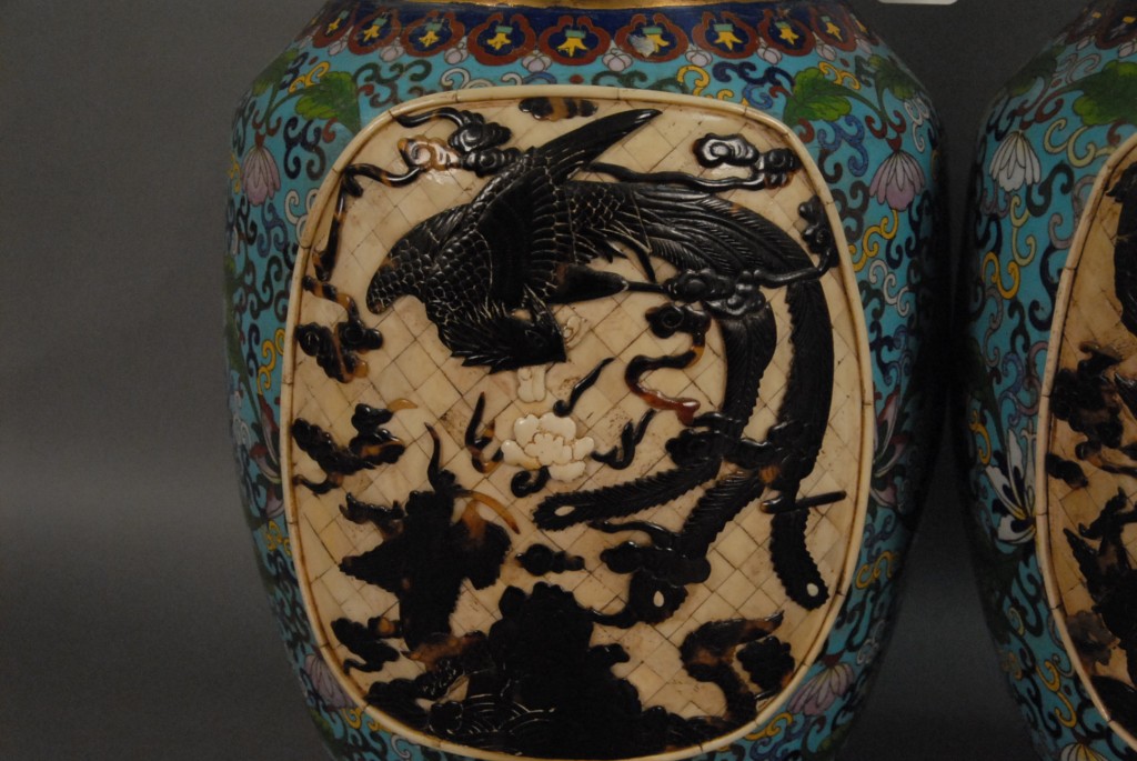Large pair of cloisonn vases having tortoise and bone panels mounted on the front and back, ht. 17 3/4.