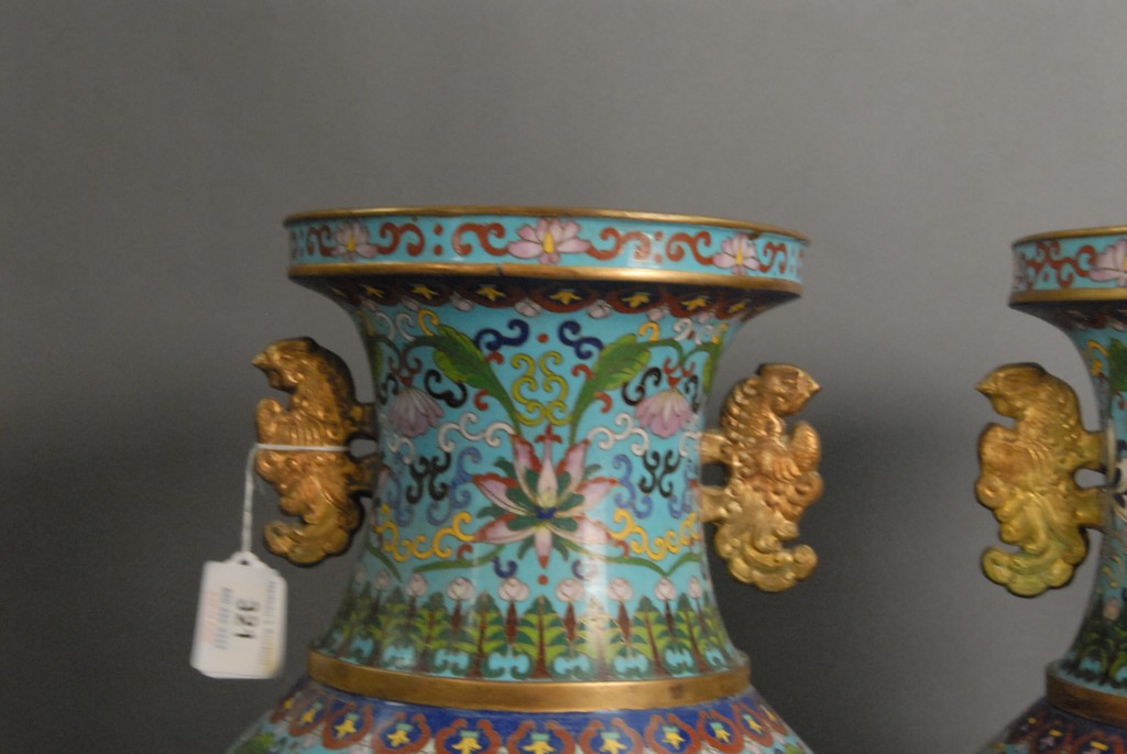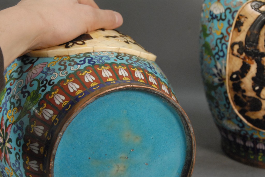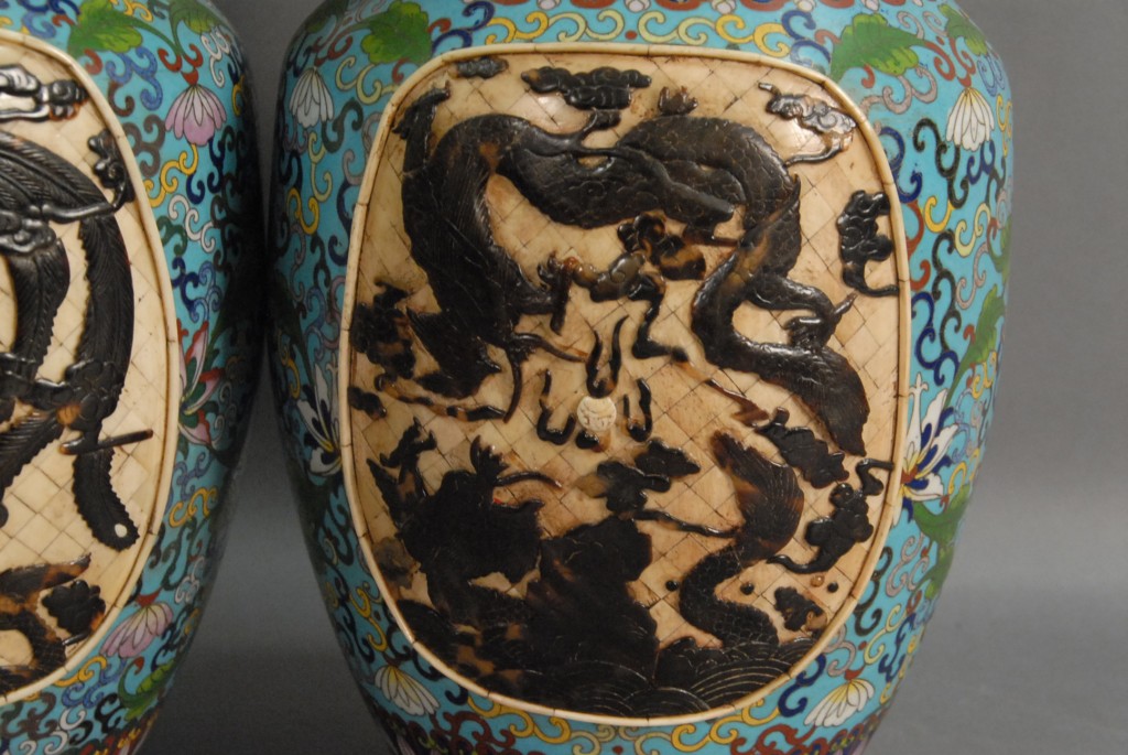 Lot 321: Large pair of cloisonn vases having tortoise and bone panels mounted on the front and back, ht. 17 3/4.