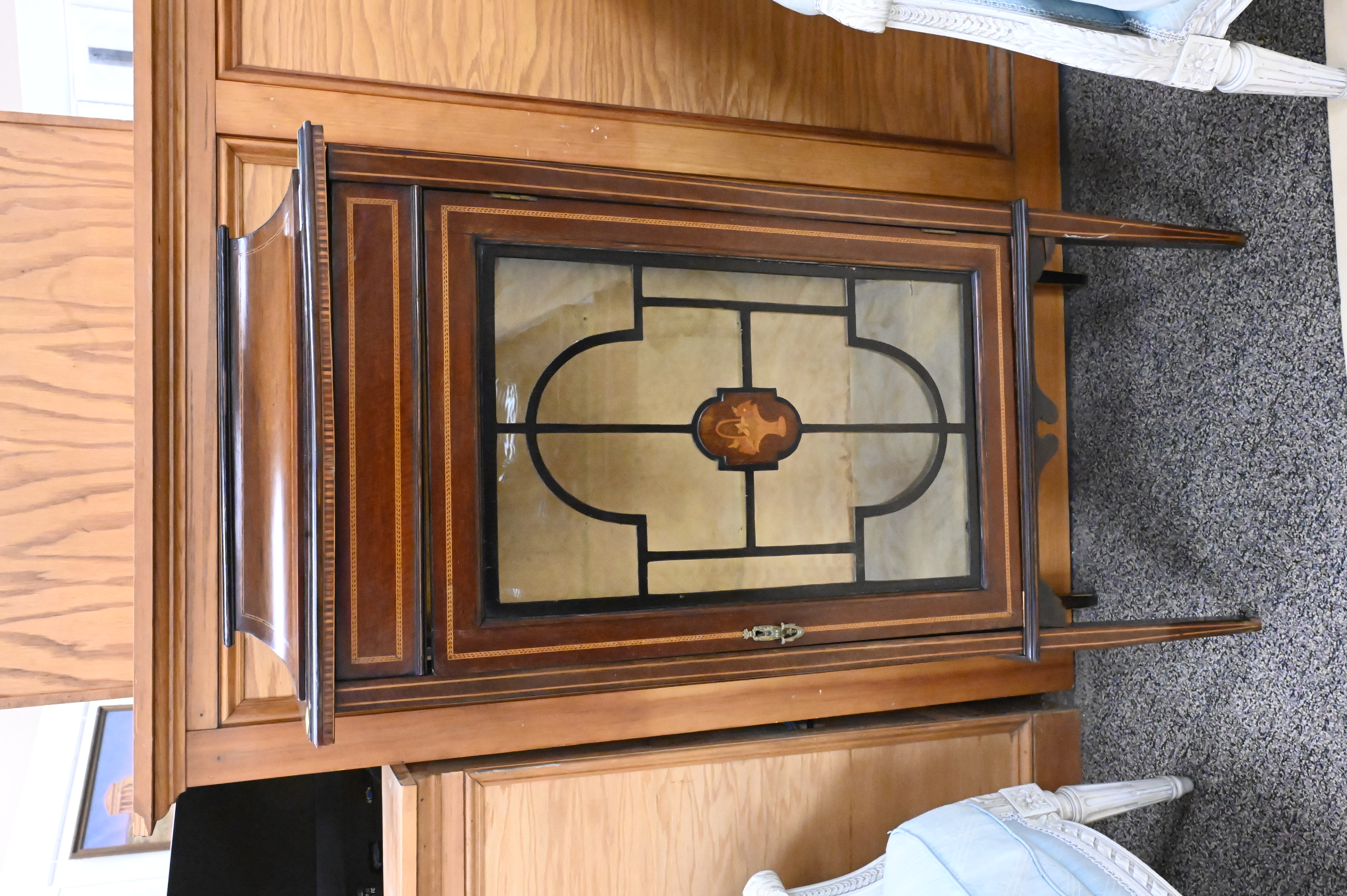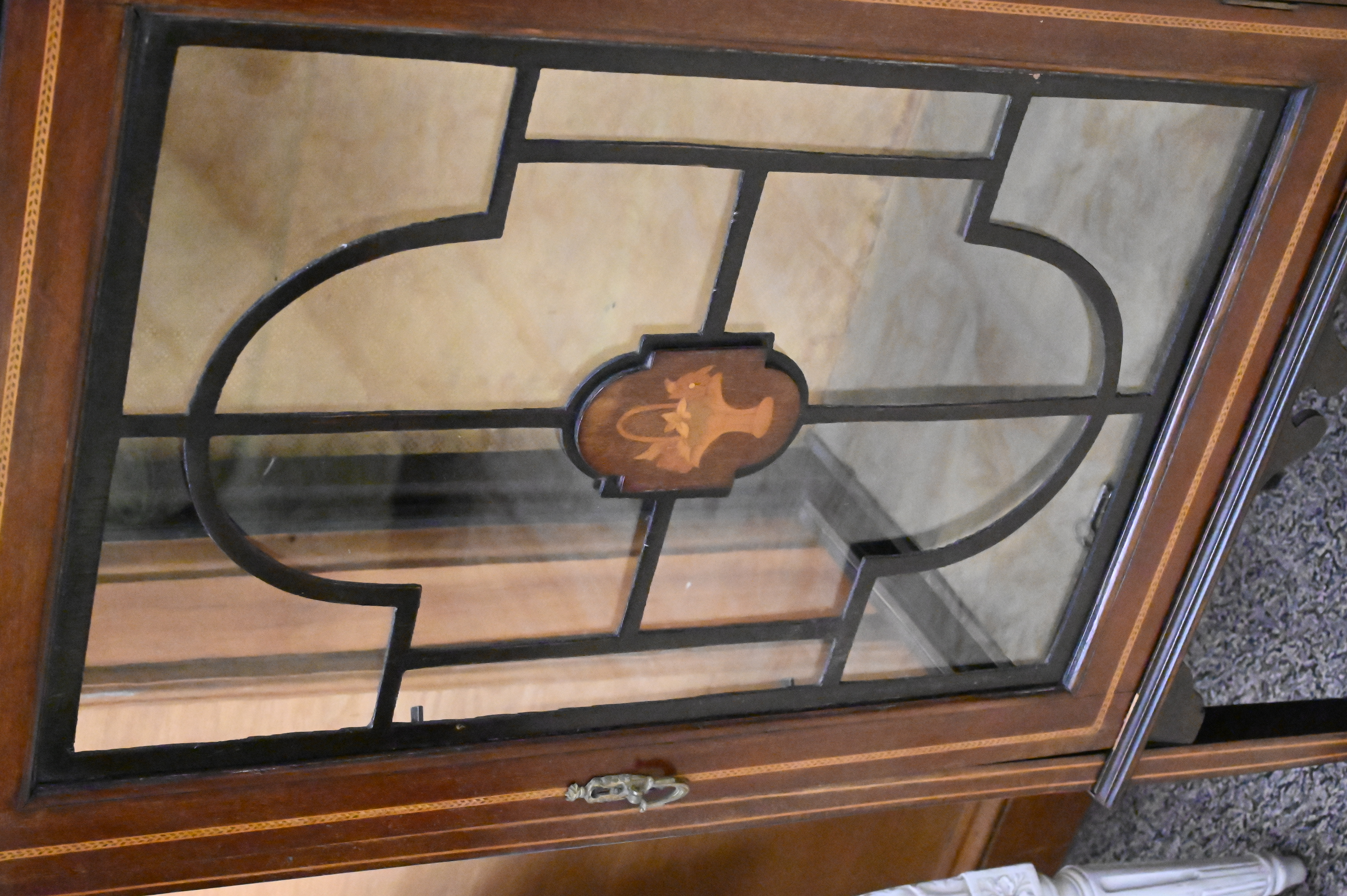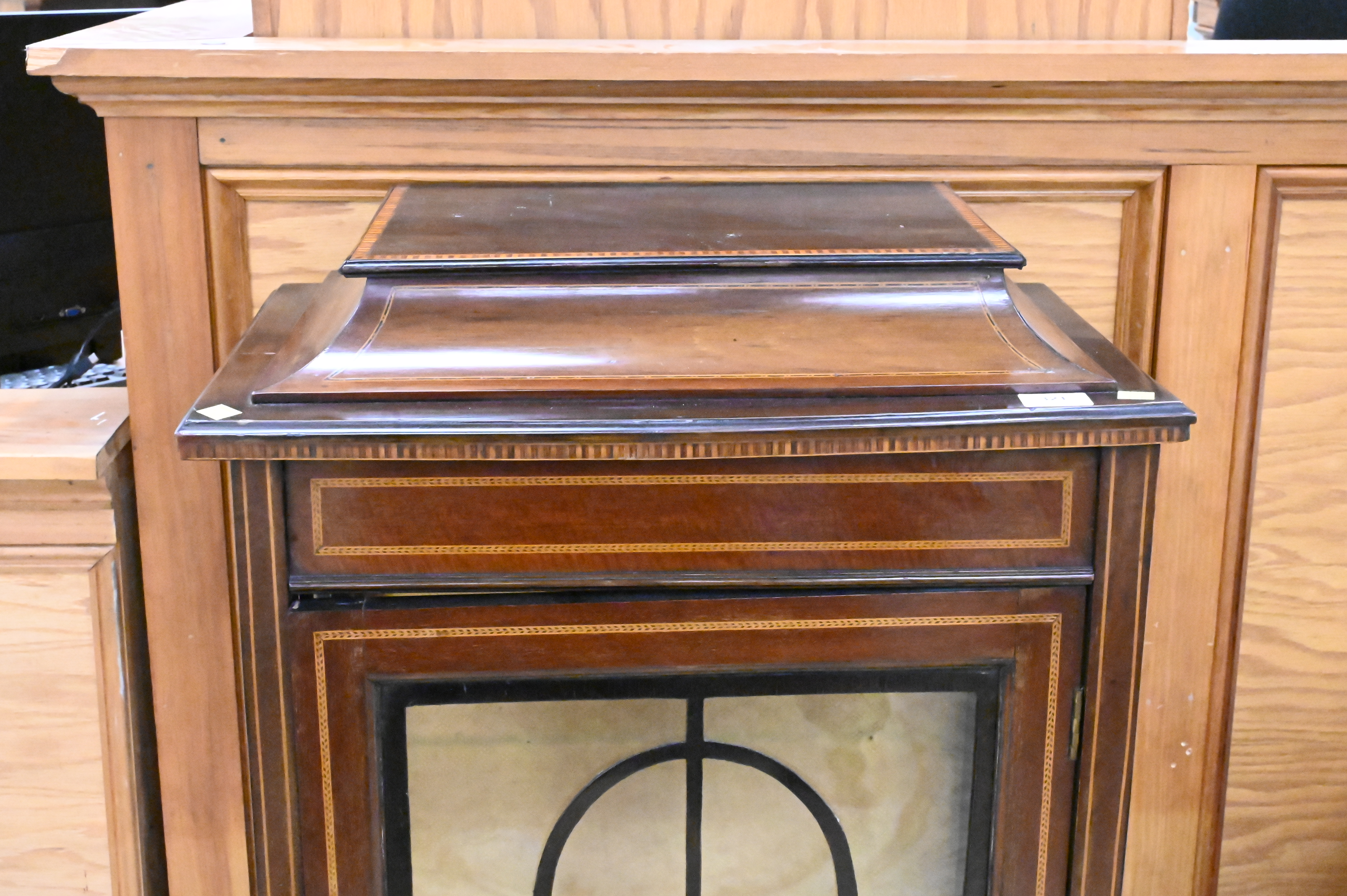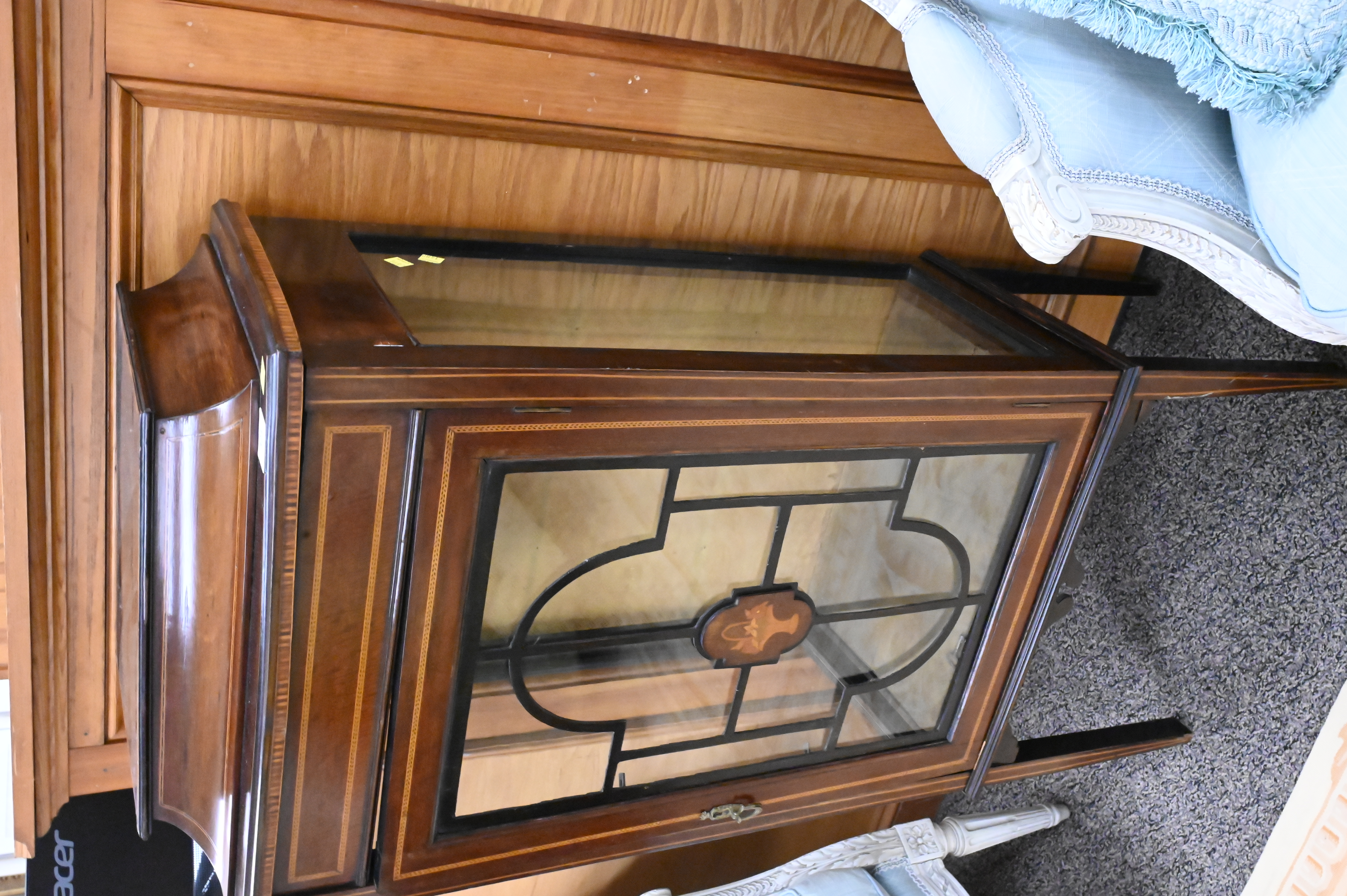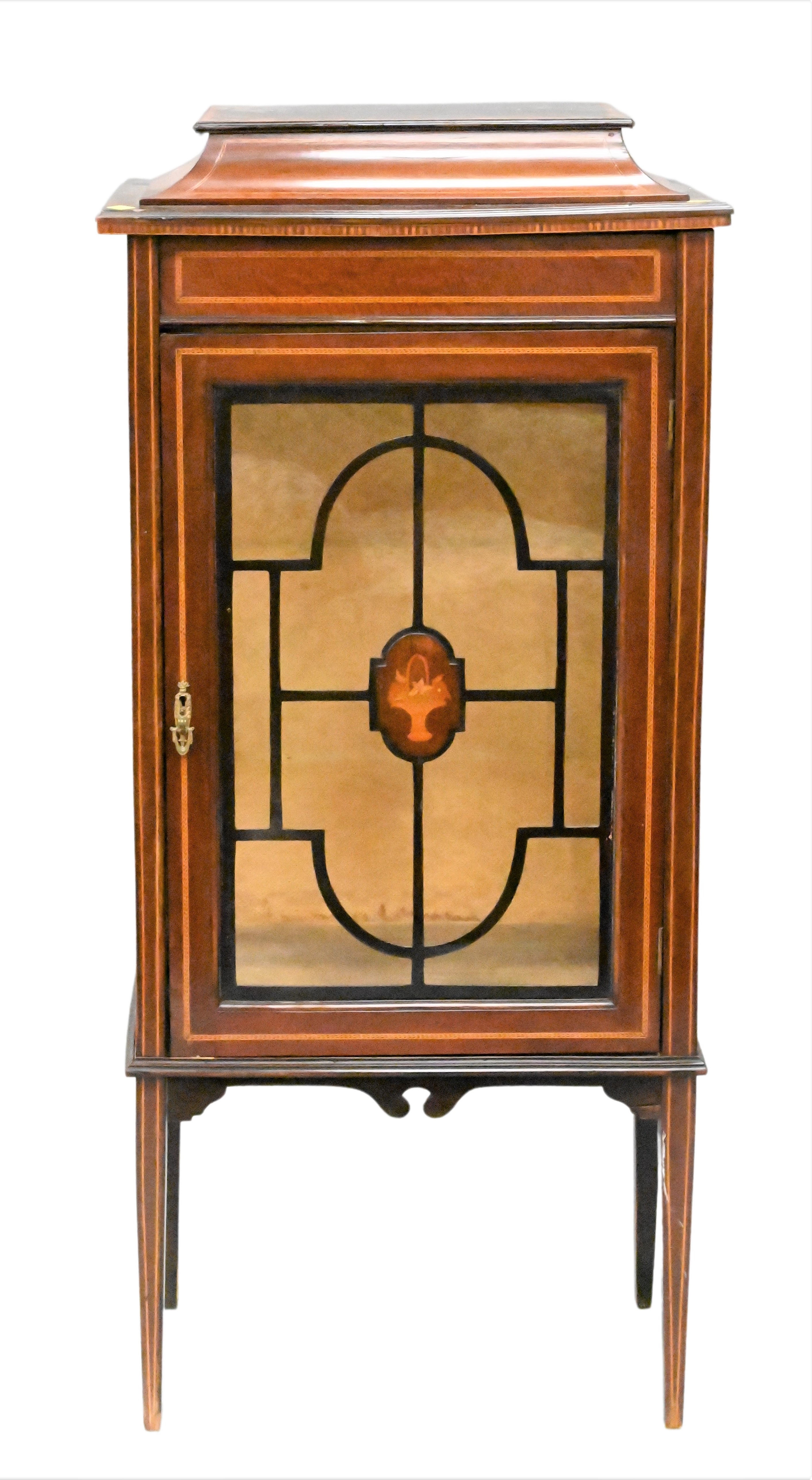 Mahogany Inlaid Vitrine, having one door with marquetry inlaid center panel, set on tapered legs, height 48 inches, width 22 inches, depth 13 1/4 inches.