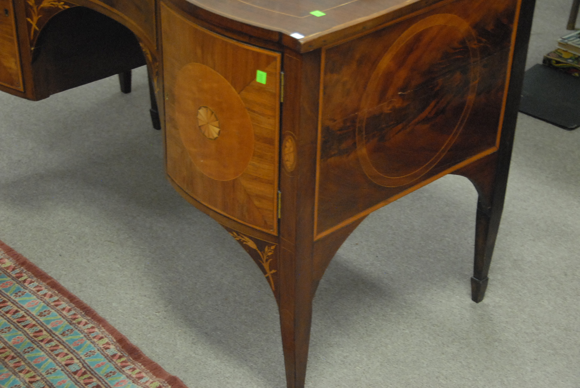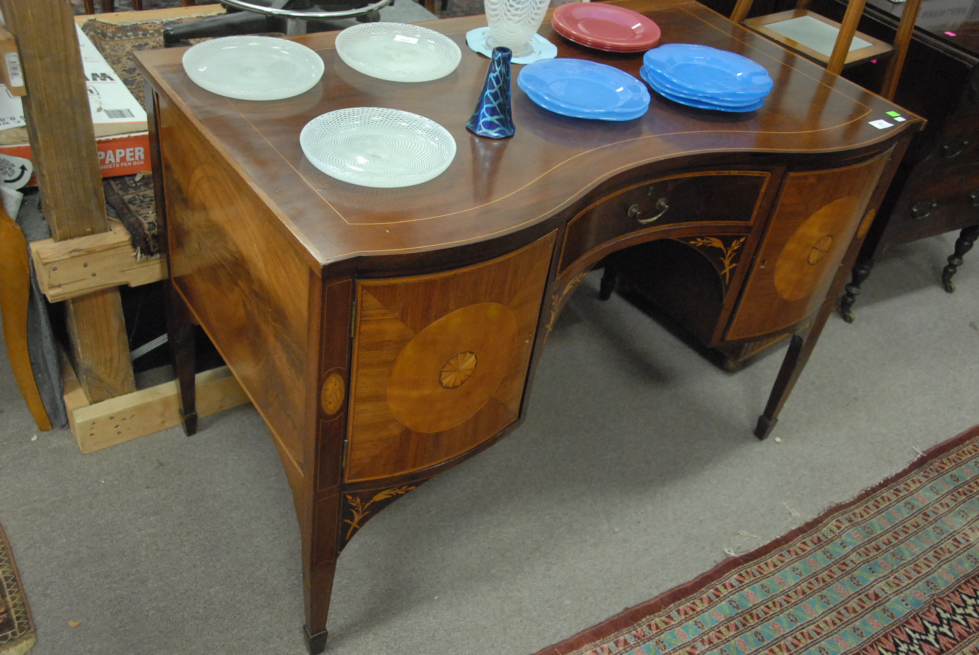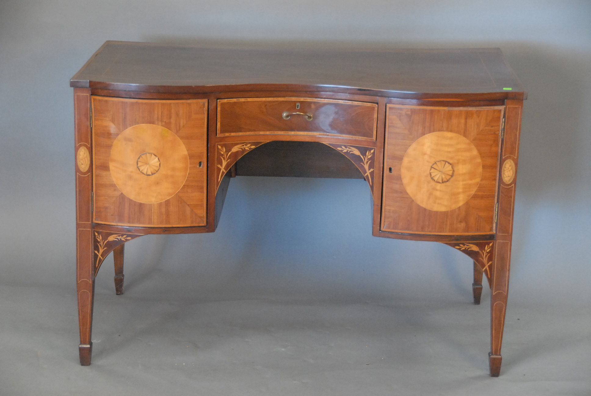 Lot 321: Pair of custom mahogany inlaid servers with drawer and two doors and serpentine fronts.ht. 31 in. wd. 46 1/2 in. dp. 26 1/2 in.