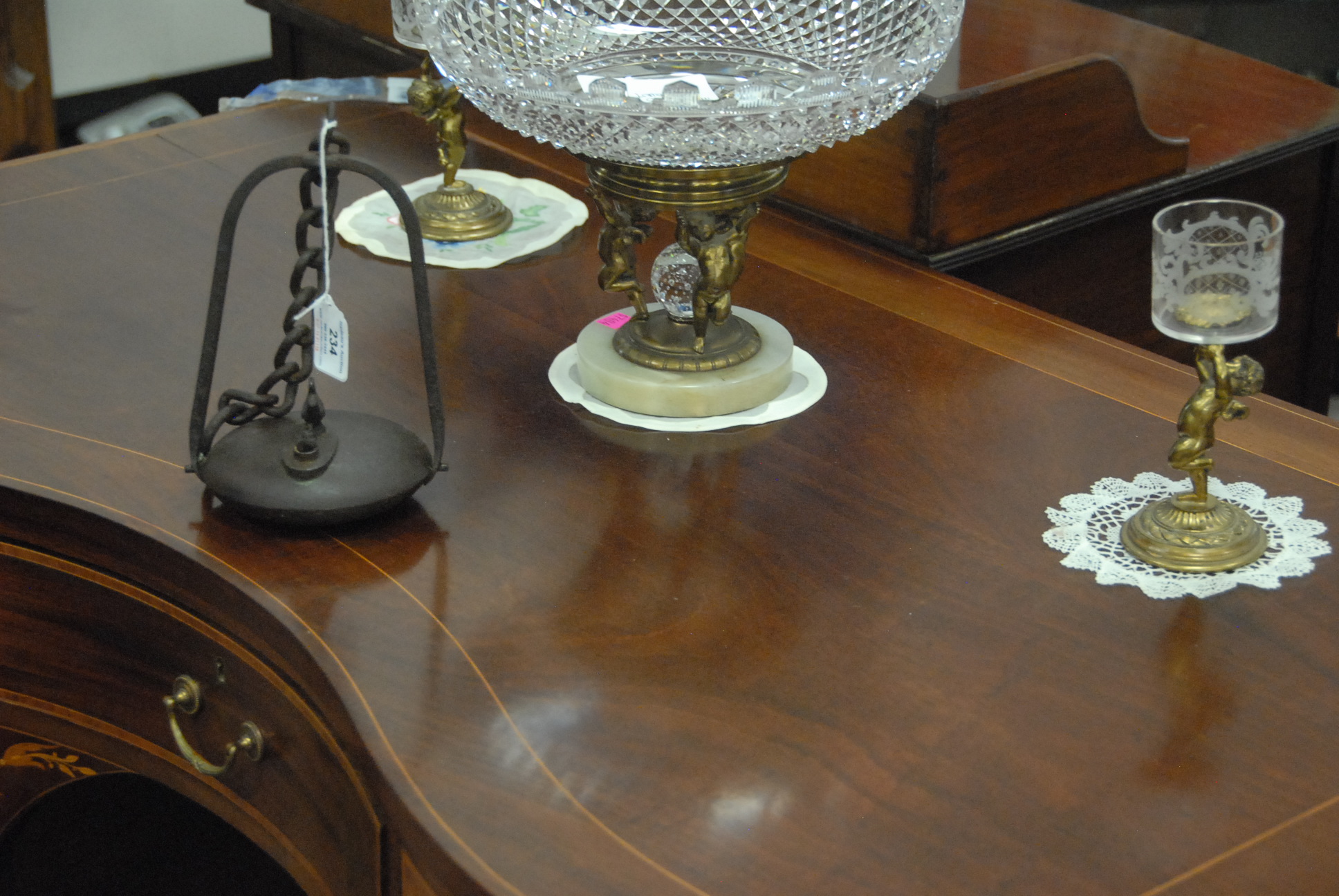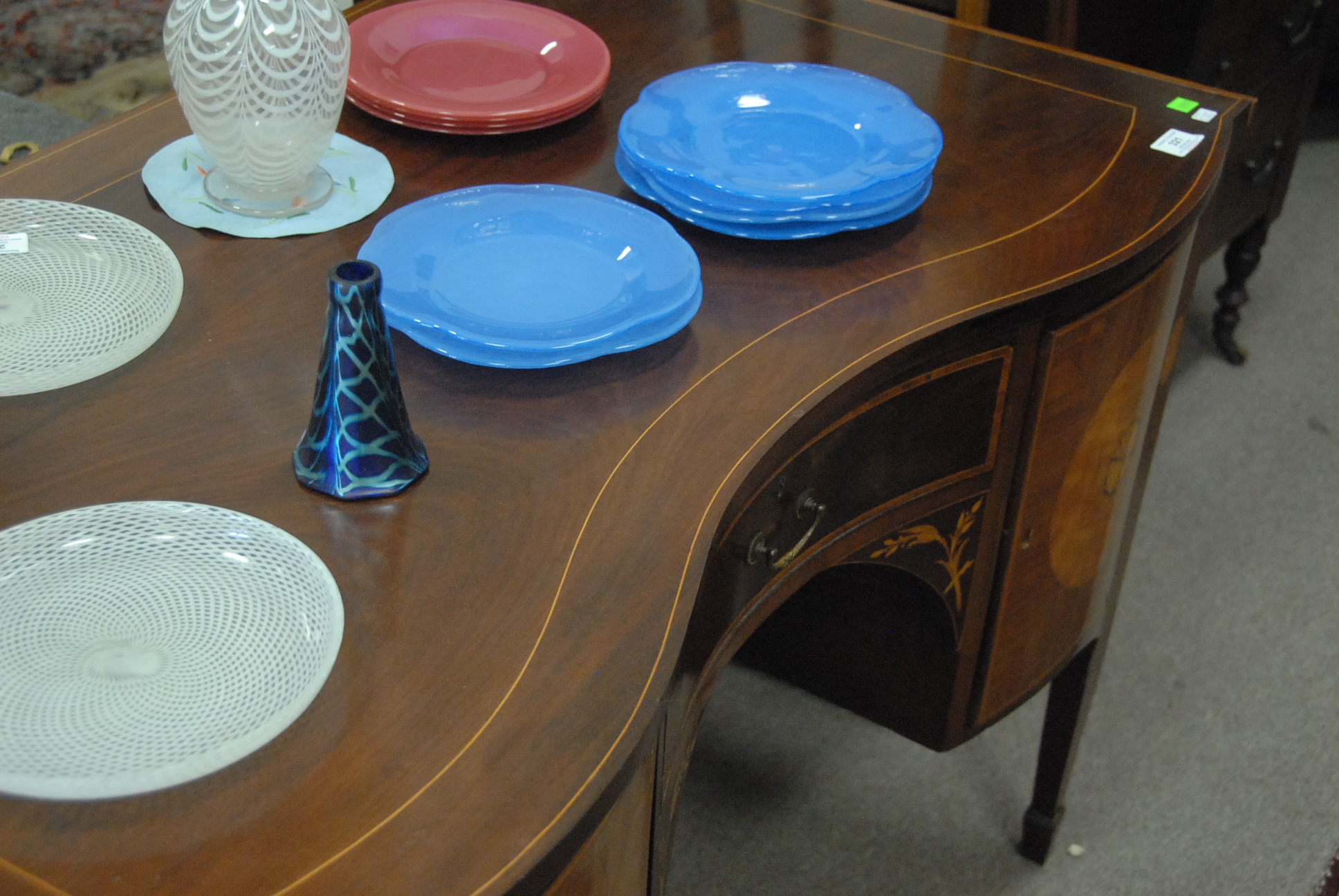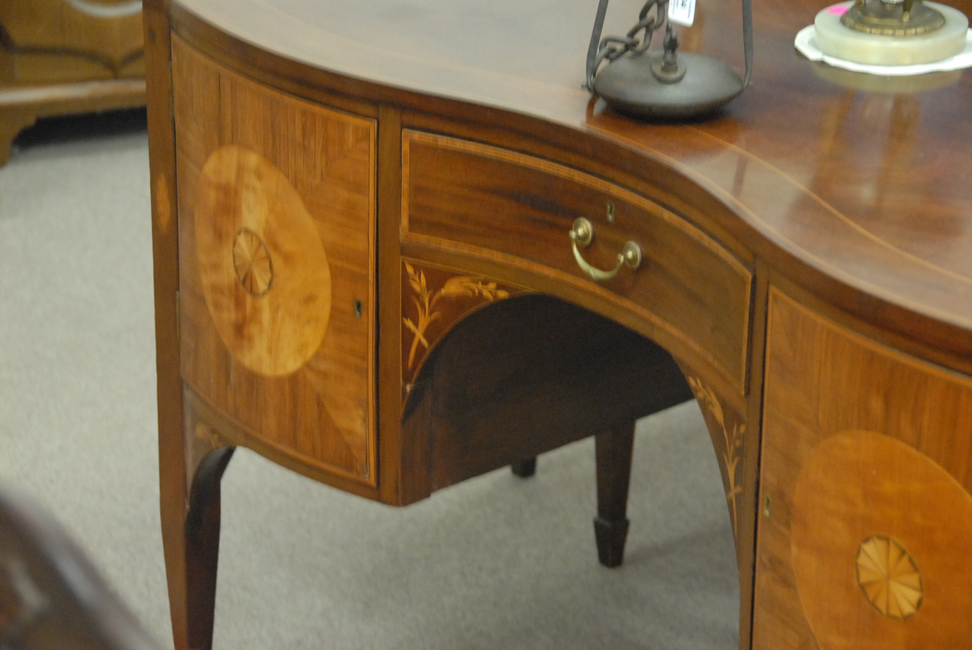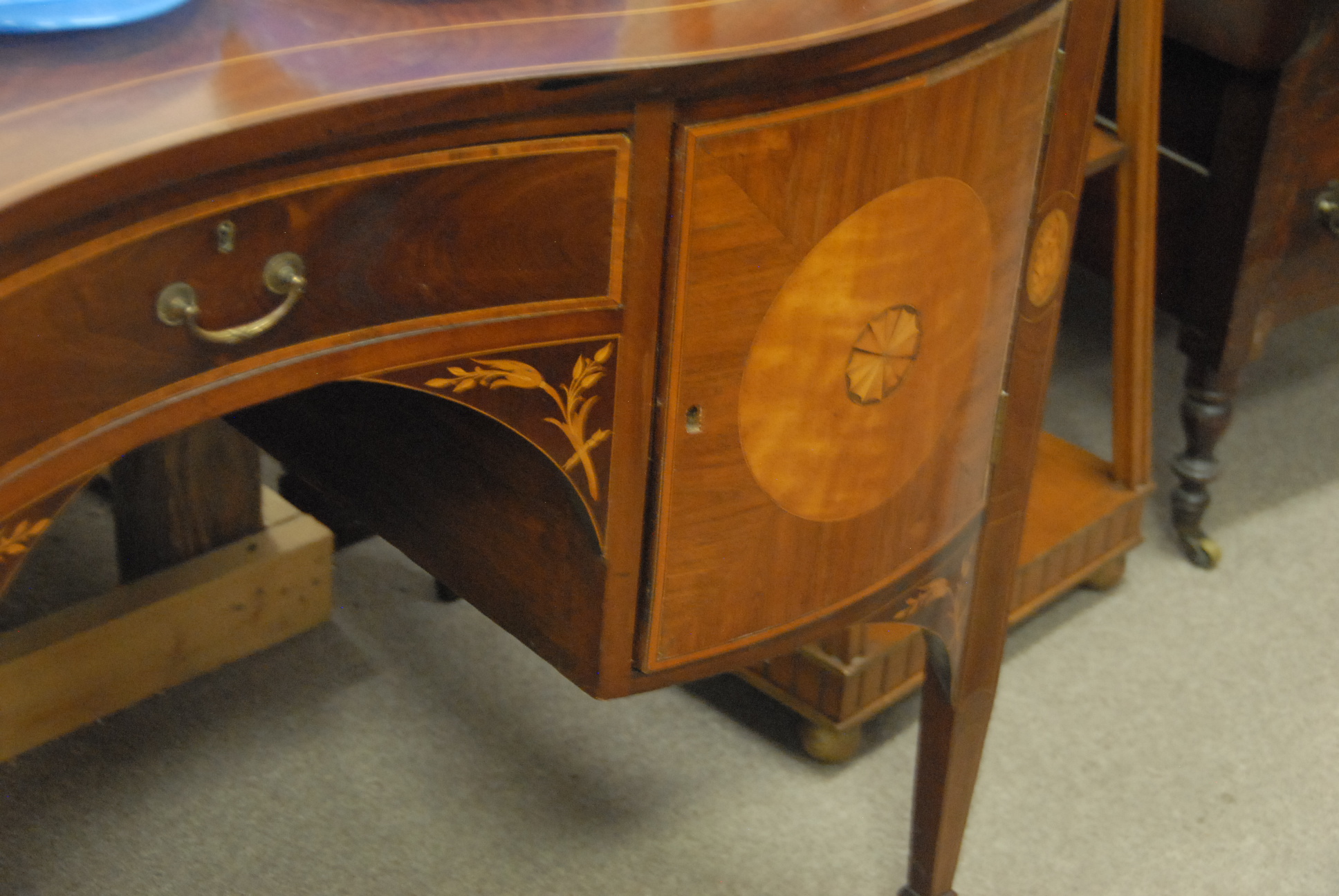 Lot 321: Pair of custom mahogany inlaid servers with drawer and two doors and serpentine fronts.ht. 31 in. wd. 46 1/2 in. dp. 26 1/2 in.