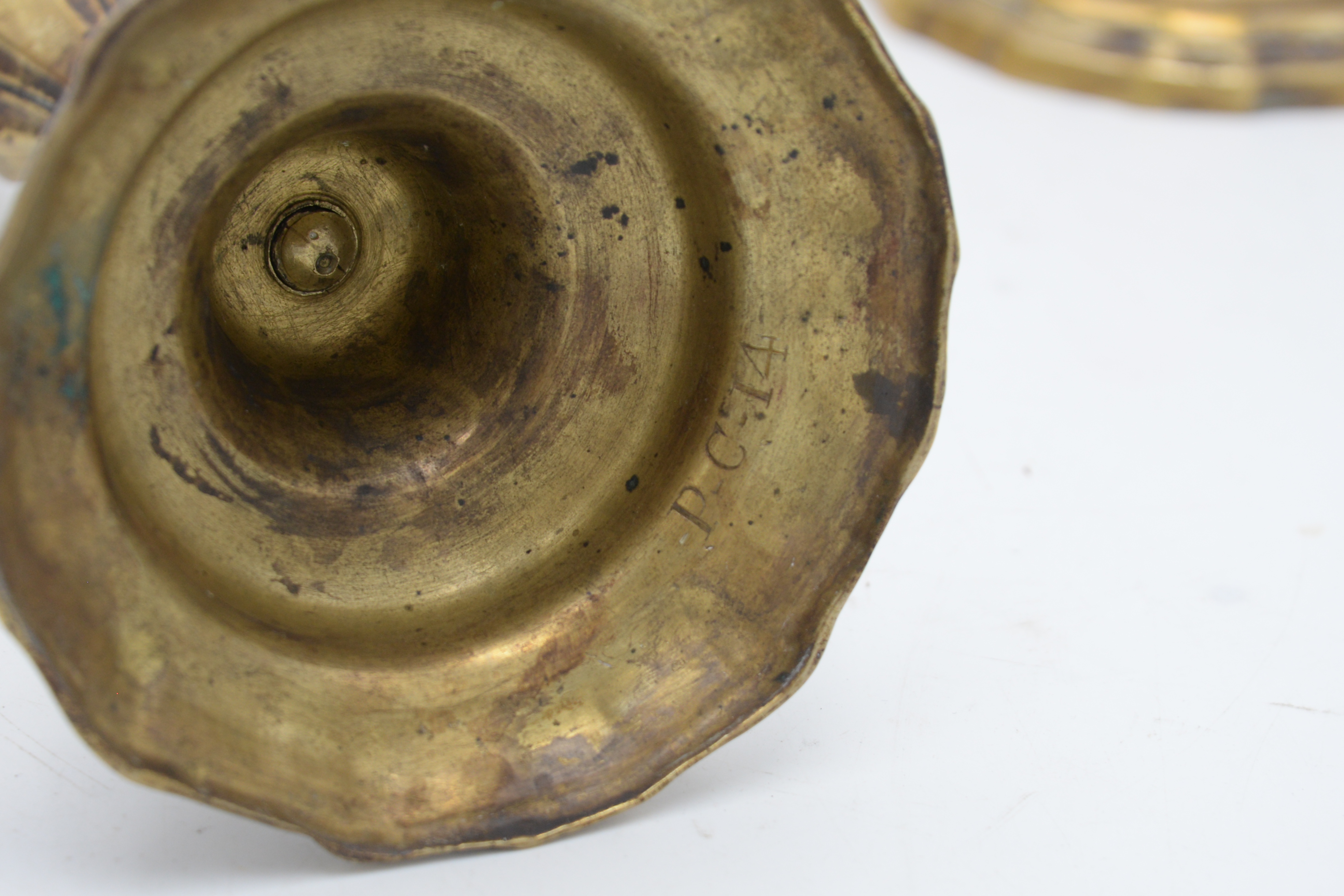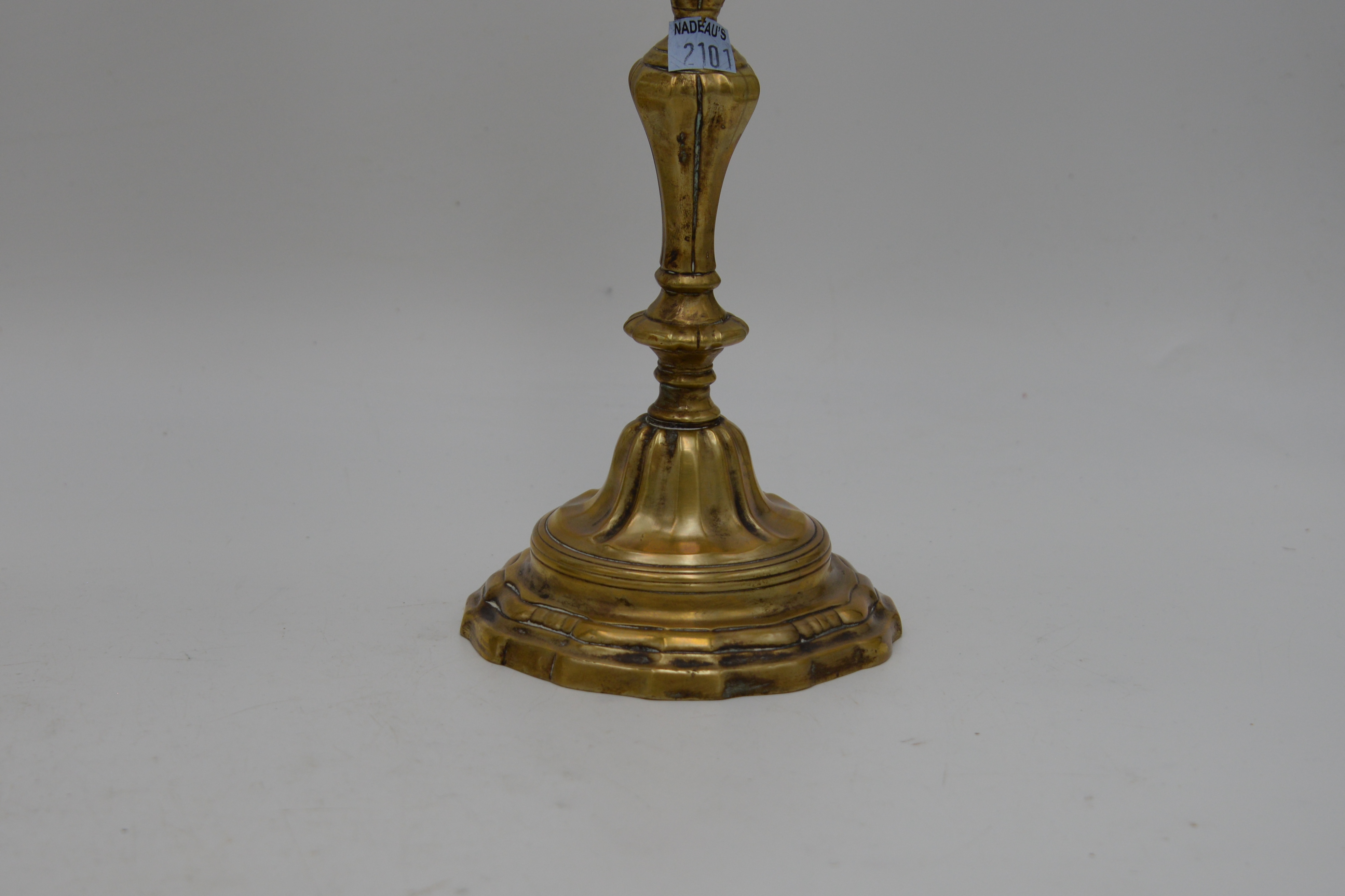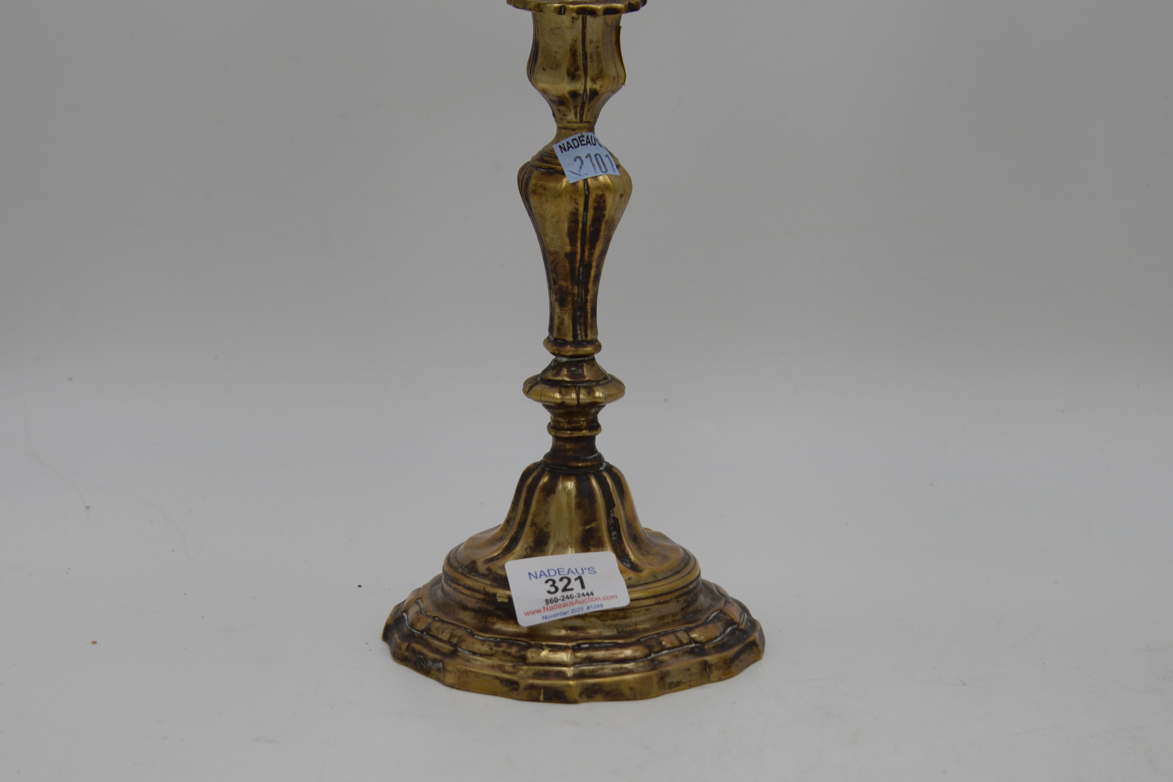 Pair of French Brass Candlesticks, 18th century, having leaf finial, Provenance: Jackson-Mitchell, 4/7/00 $9,900, tallest 18 inches in height
