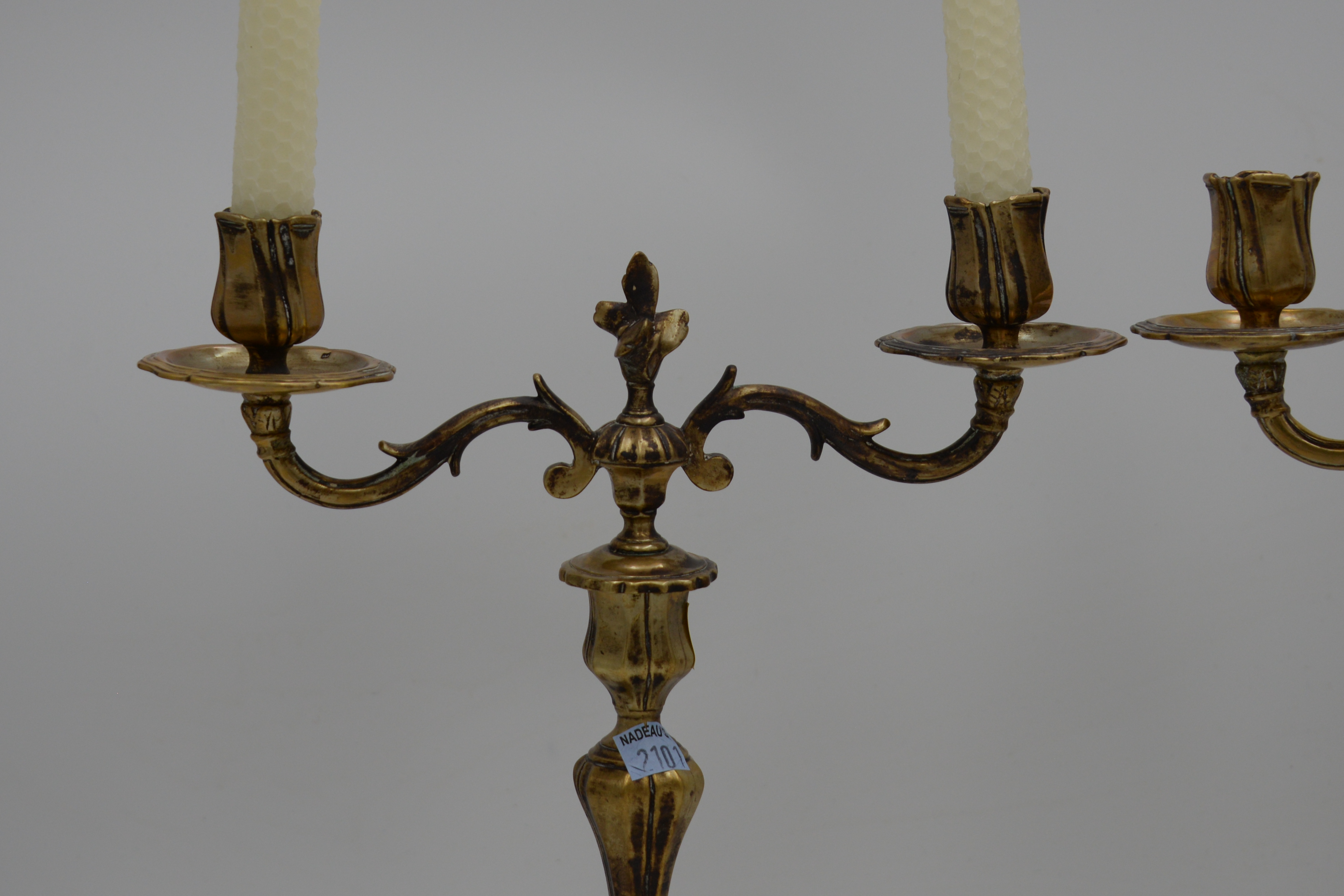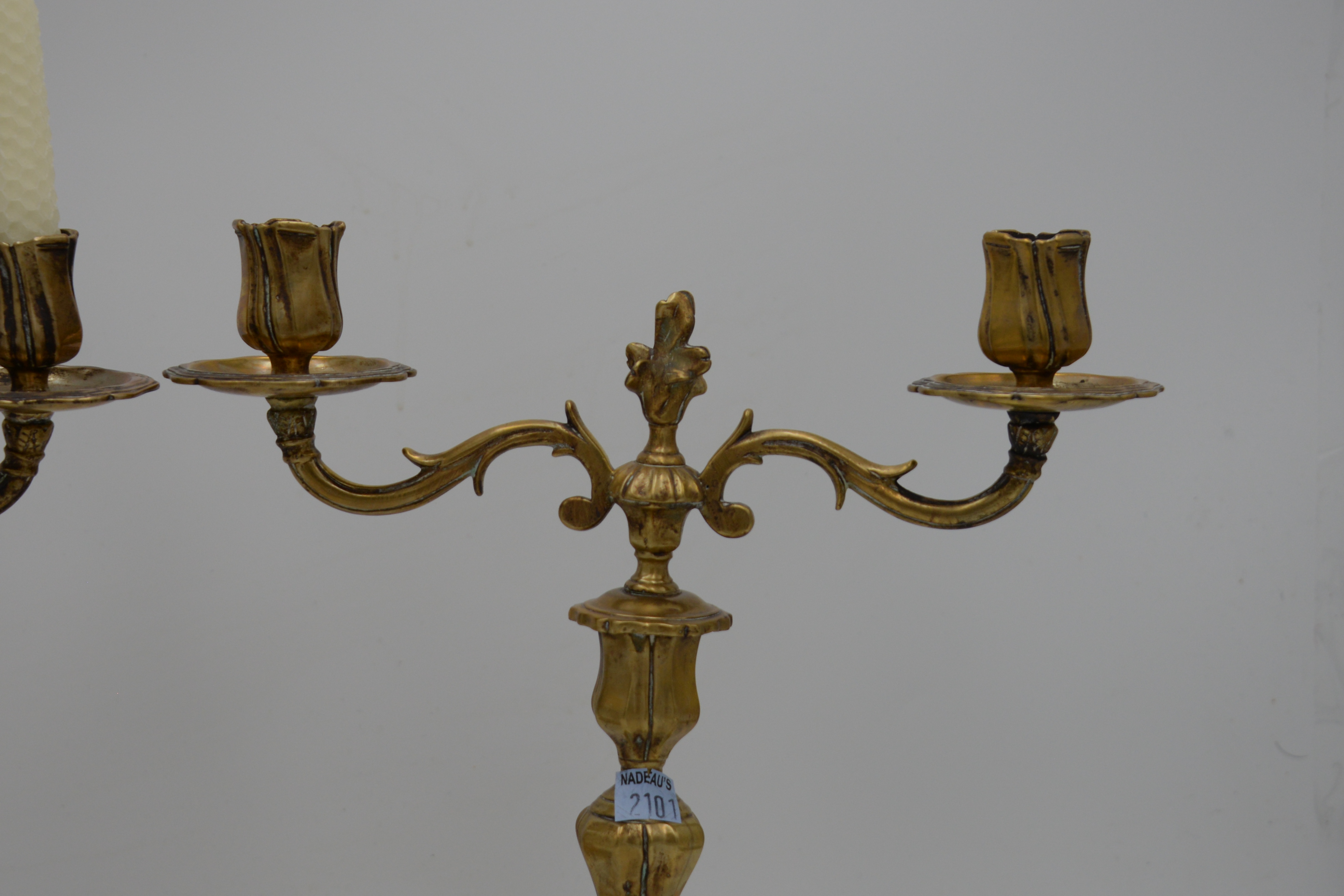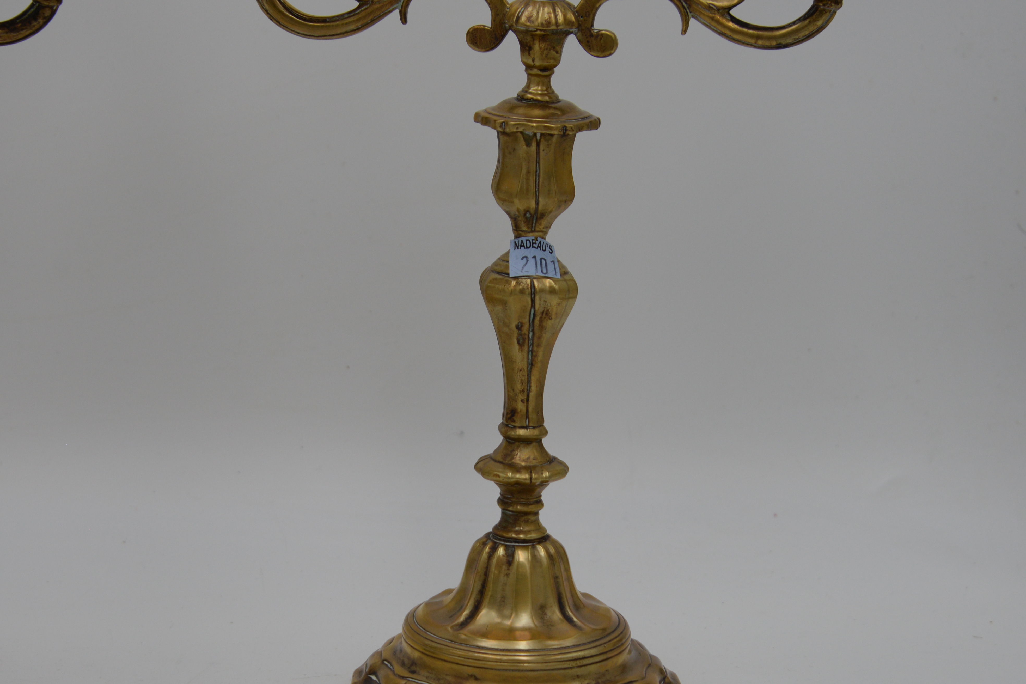 Pair of French Brass Candlesticks, 18th century, having leaf finial, Provenance: Jackson-Mitchell, 4/7/00 $9,900, tallest 18 inches in height