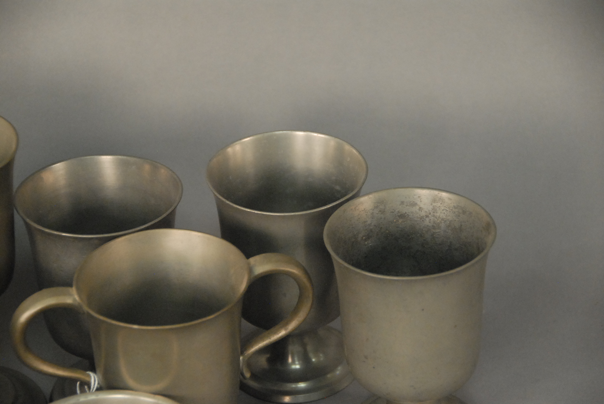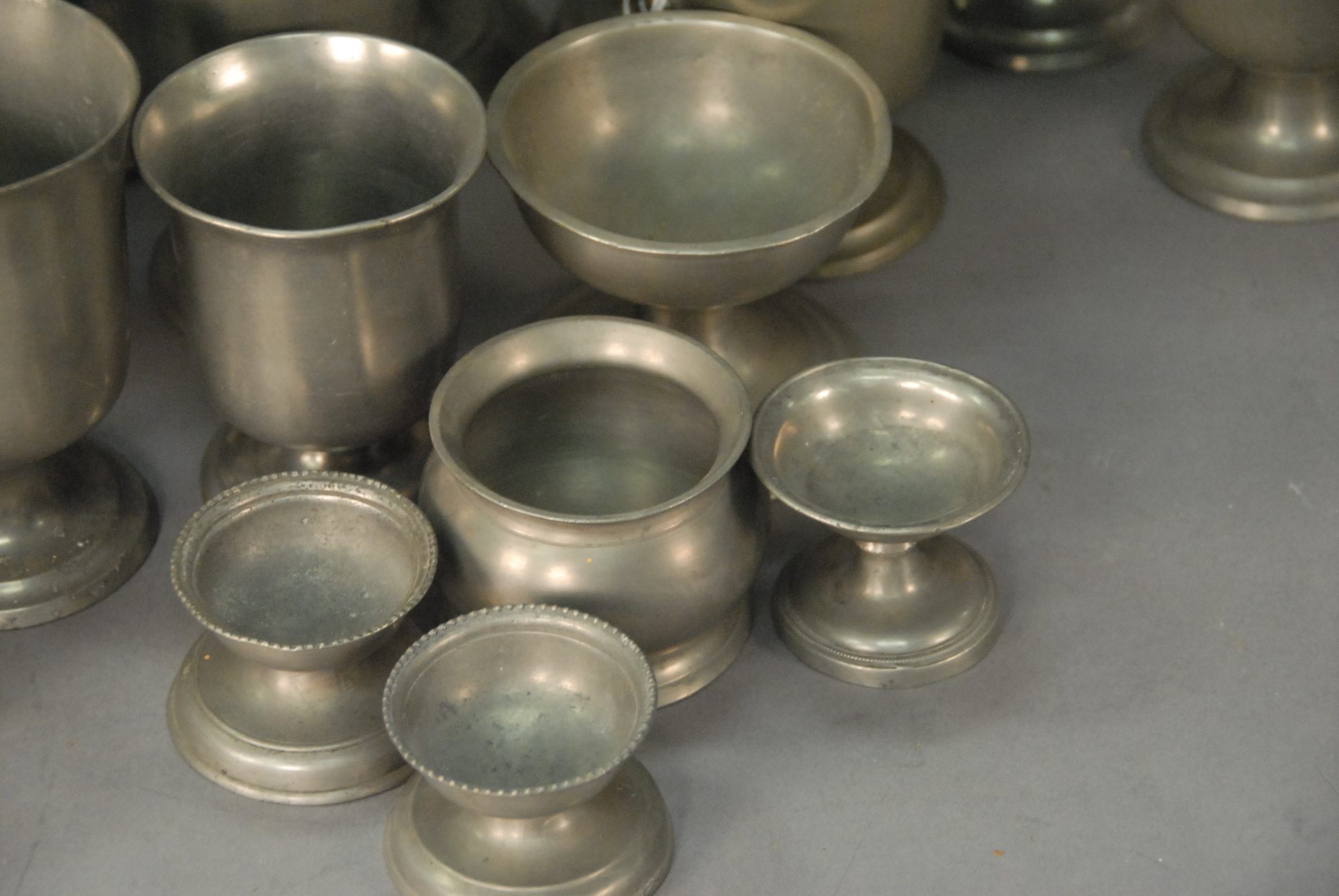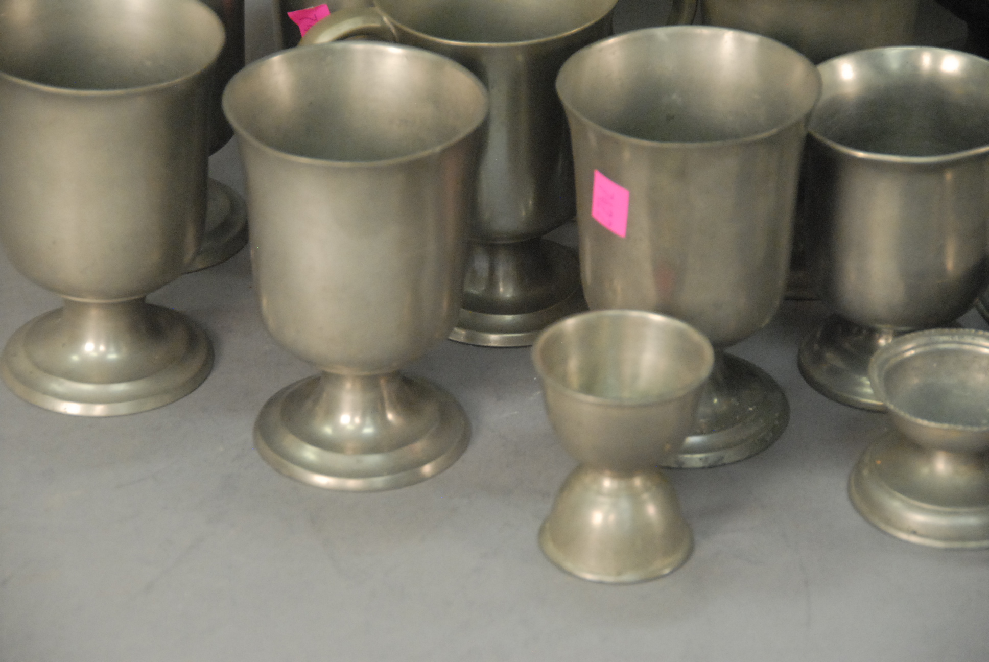 Pewter twenty piece lot to include chalices, stem cups, salts, etc. Provenance: Property from the Estate of Elizabeth and Edward Wallace of The Tracy House in Meriden, Connecticut.