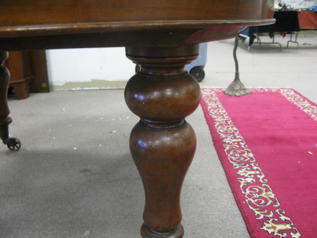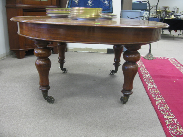 Round Victorian mahogany dining table plus two large leaves, on four round turned legs ending in brass wheels