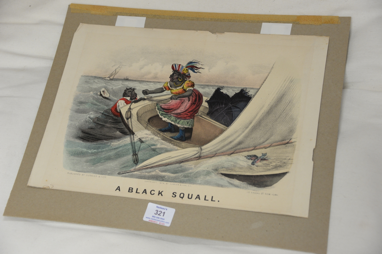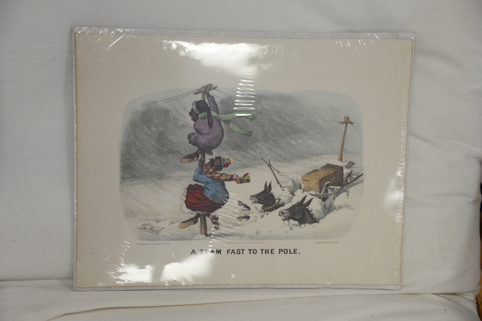 Lot 321: Set of five rare comical cartoon Currier & Ives colored lithographs including A Team Fast on the Snow, A Black Squall, A Team F…