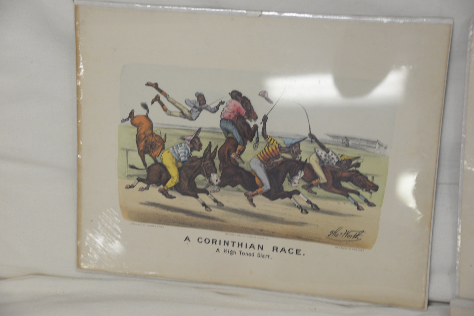 Set of five rare comical cartoon Currier & Ives colored lithographs including A Team Fast on the Snow, A Black Squall, A Team Fast to the Pole, A Corinthian Race, and A Corinthian Race. 10 3/4 x 14 3/4 to 13 1/4 x 17 1/2