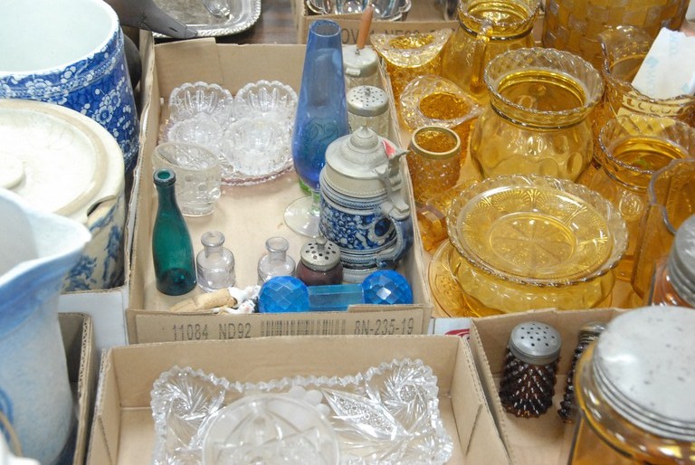 Lot 321: Six box lots amber glass pitchers and jars, flow blue plate, stoneware pitcher and crock, pressed glass, and misc.