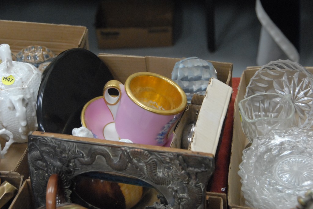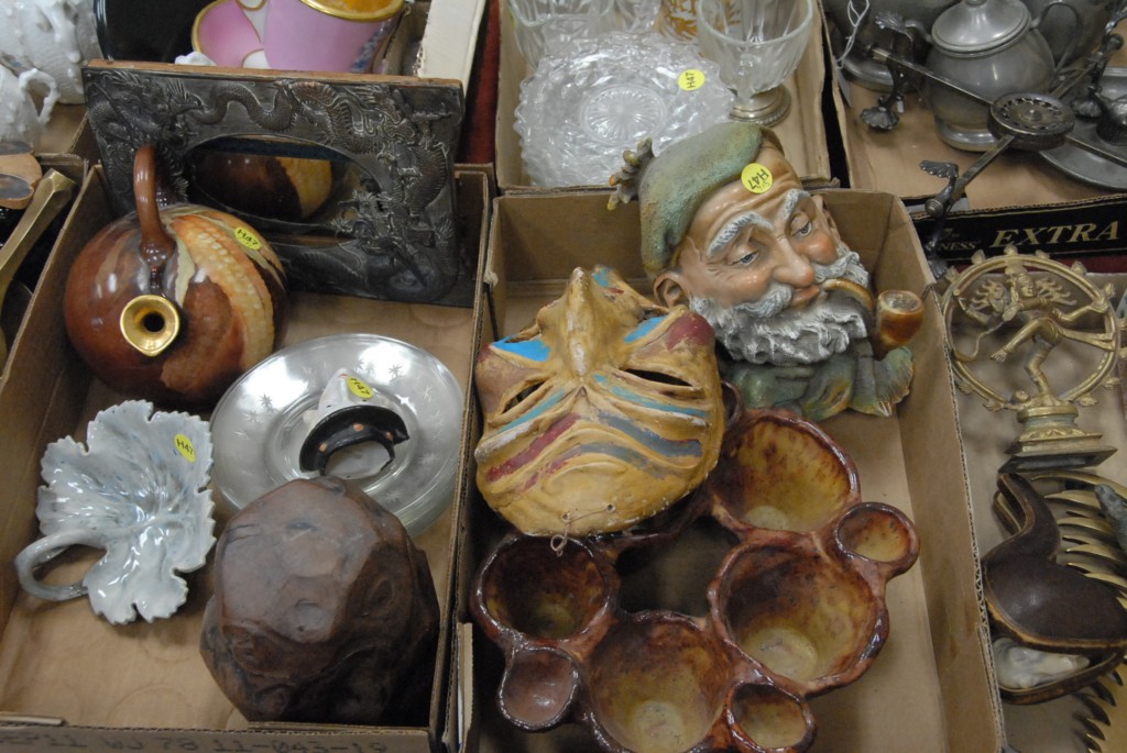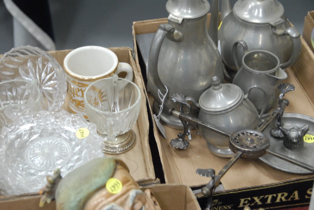 Six box lots to include pig figure, porcelain vase, pewter, glassware, two china nodders, ewer.