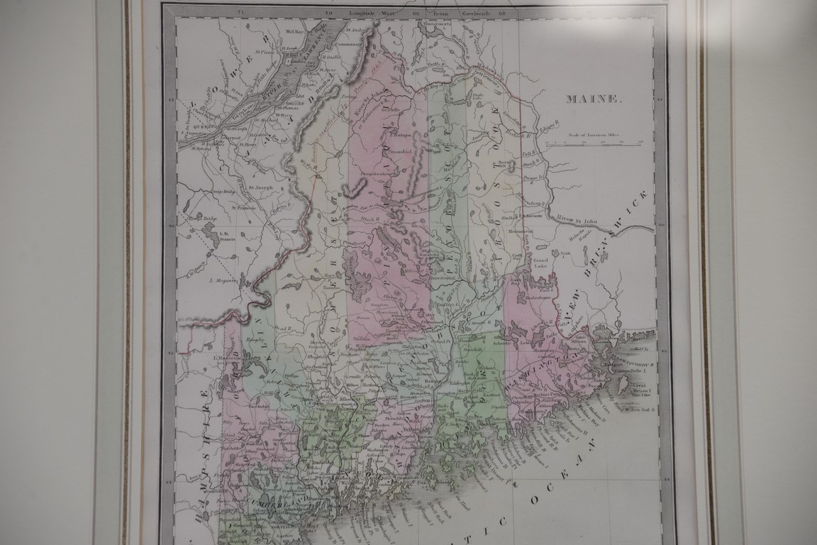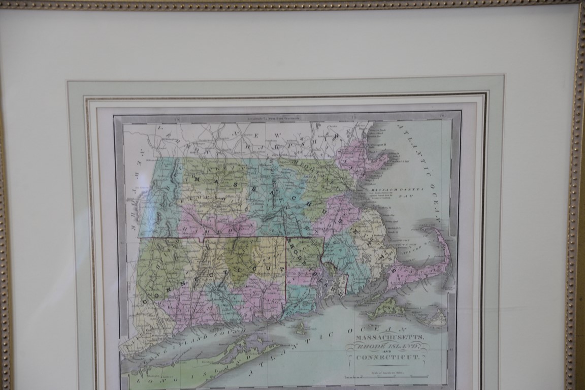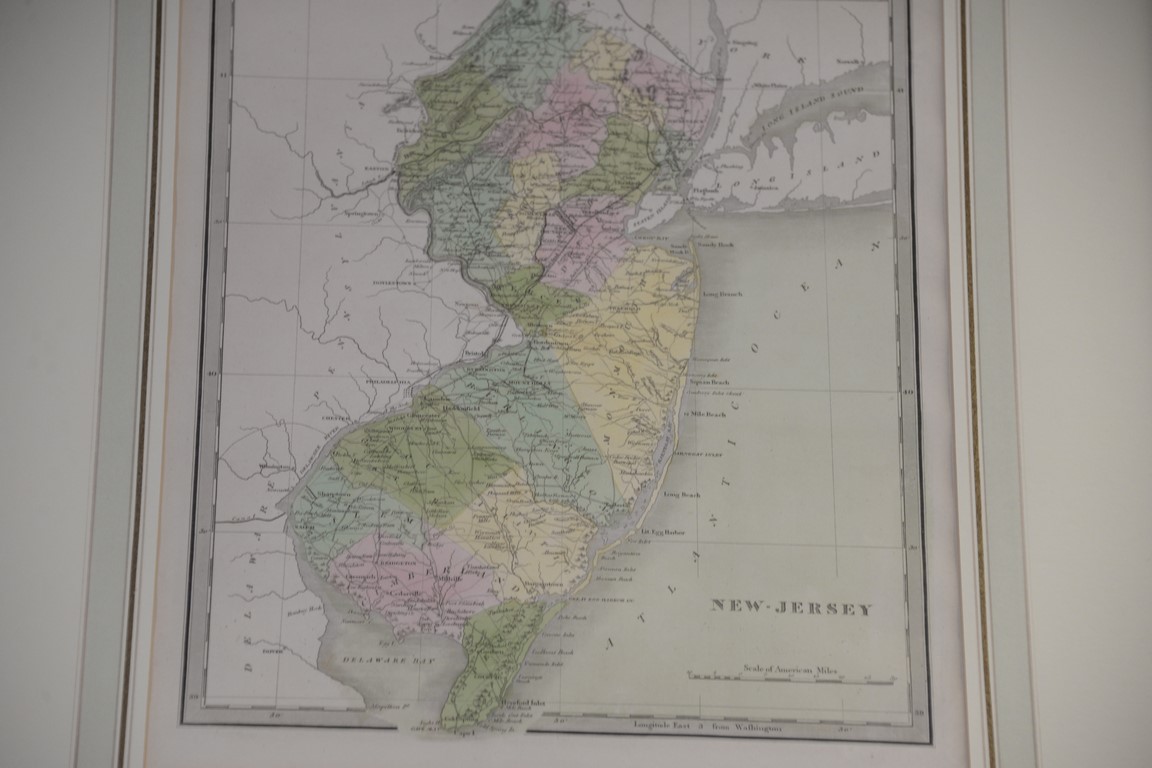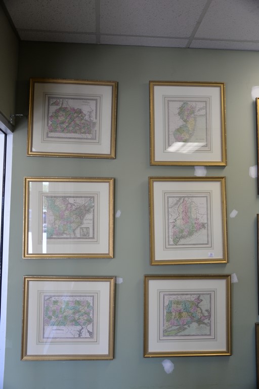 Six Jeremiah Greenleaf handcolored map engraving small folios A New Universal Atlas including New Jersey, United States, Virginia, Pennsylvania, Massachusetts/Rhode Island/Connecticut, and Maine, all framed and matted. ss 11 1/4 x 13 1/2 and 13 1/2 x 11 1/4 Provenance: Property from Credit Suisse’s Americana Collection