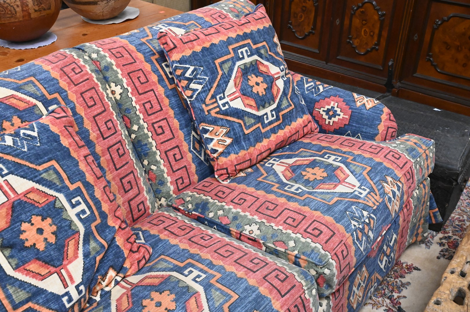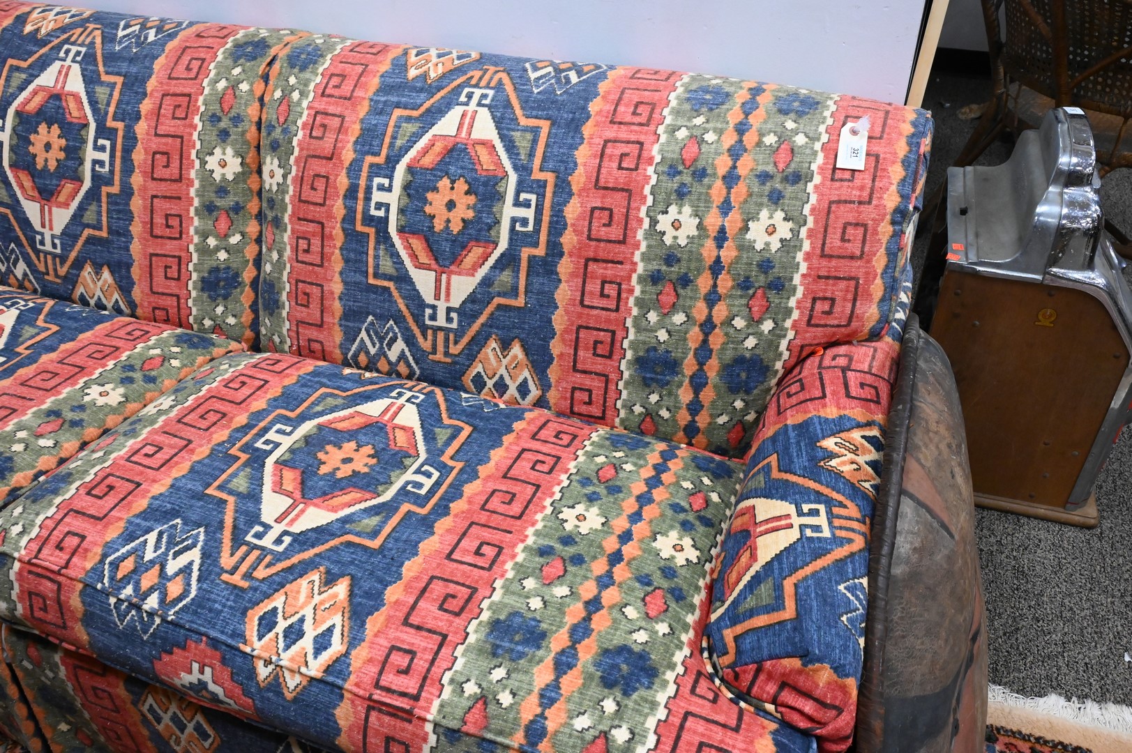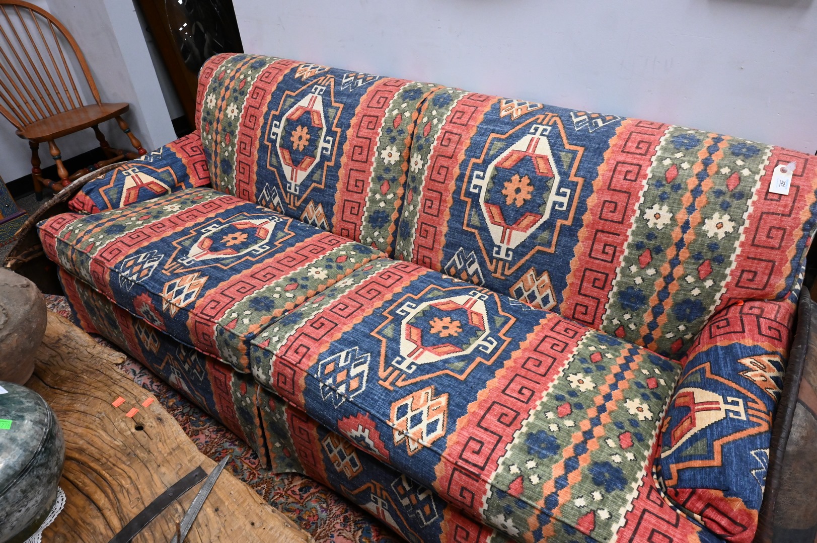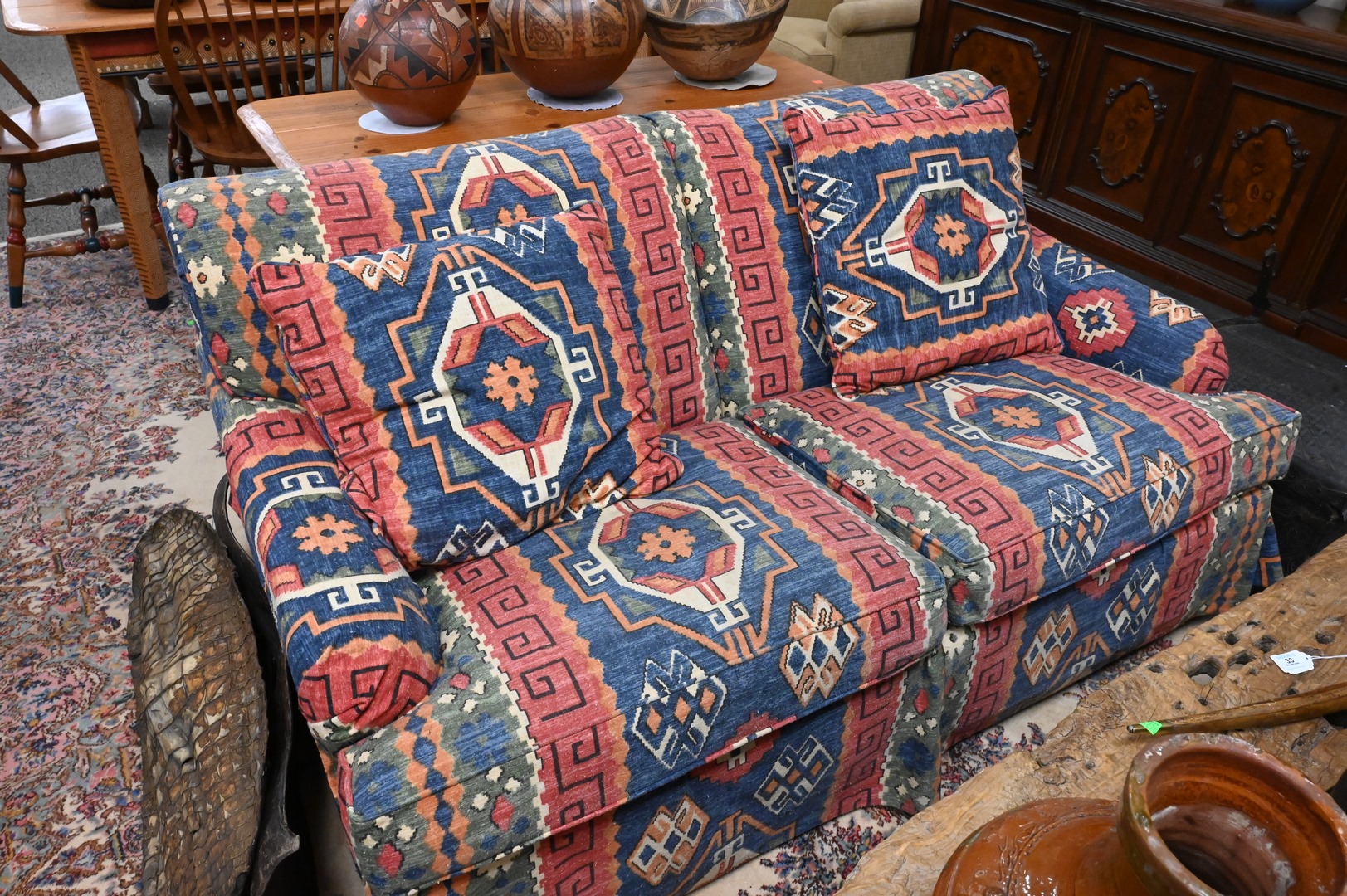 Sofa and Loveseat, in Southwest US style upholstery, lengths 65 and 82 inches. Provenance: Estate of Peter Tillou, Litchfield, Connecticut.