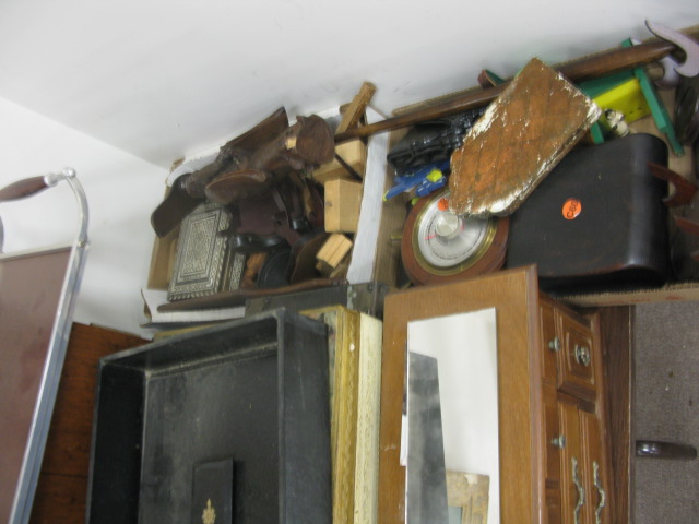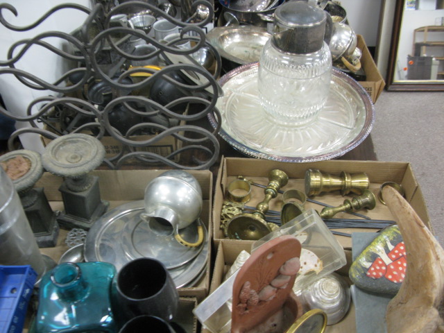 Table lot to include silverplated items, trays, spoons and misc, aluminum trimmed tray, painted Victorian clock, inlaid box, Oriental box, jewelry box, brass candlesticks, glassware, hanging light, shells, train set and misc items