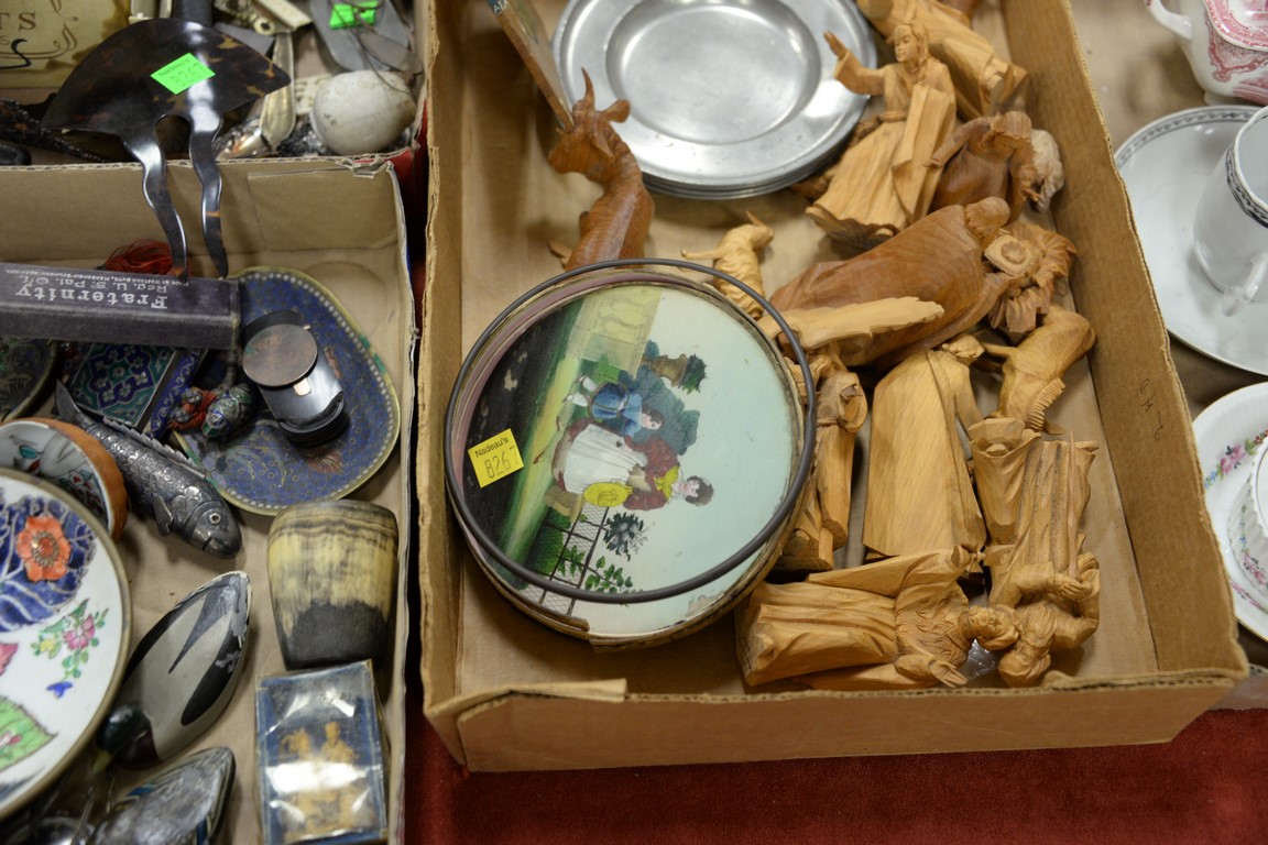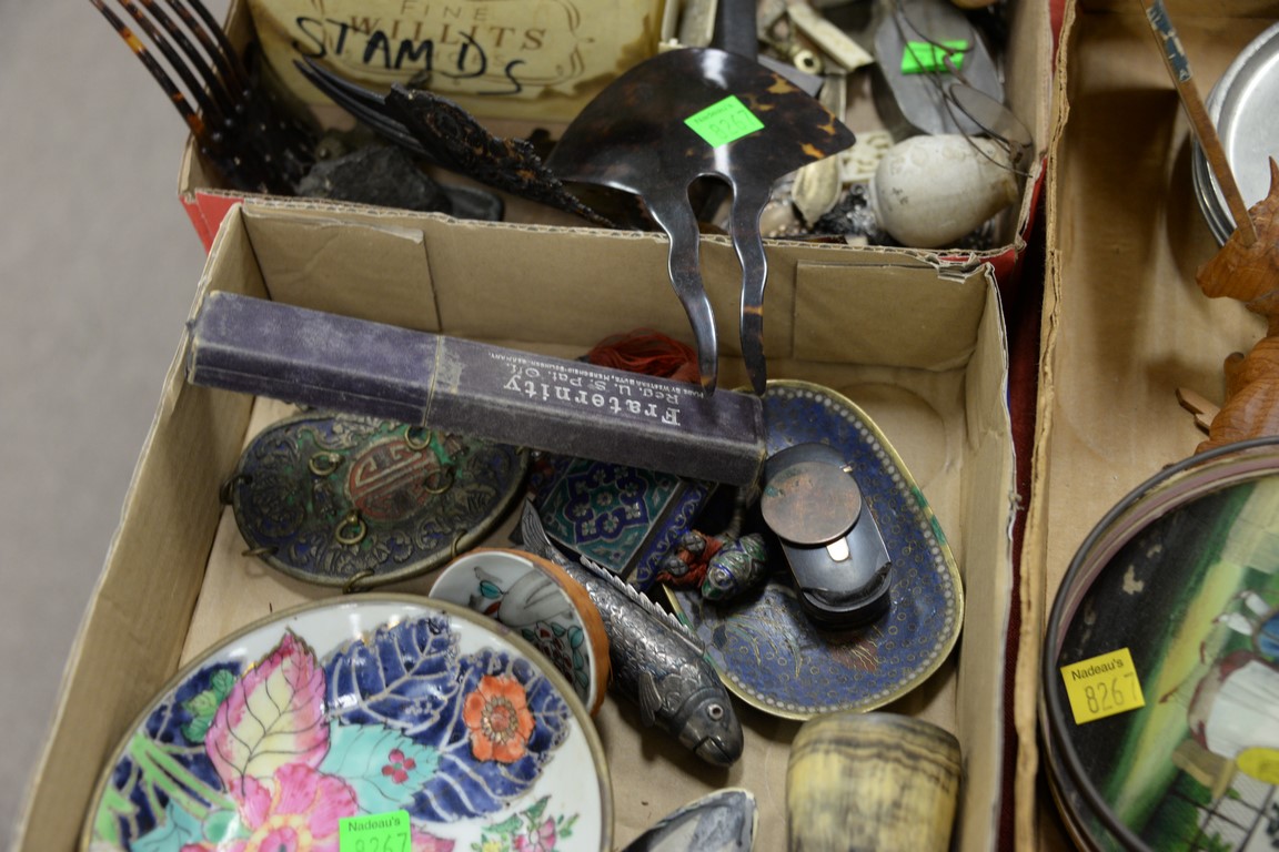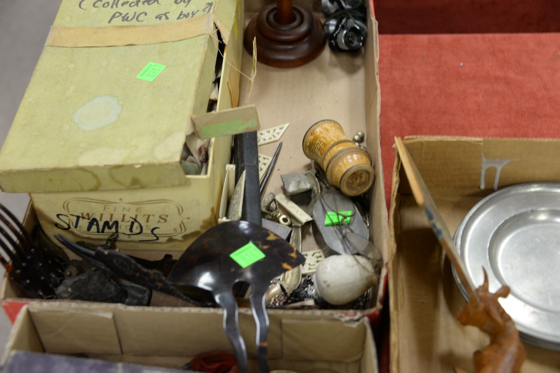 Lot 321: Three box lots to include carved wood figures, razors, Chinese porcelain plate, silver fish, spectacles, stamps, lead ducks, etc.