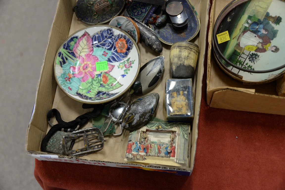 Three box lots to include carved wood figures, razors, Chinese porcelain plate, silver fish, spectacles, stamps, lead ducks, etc.