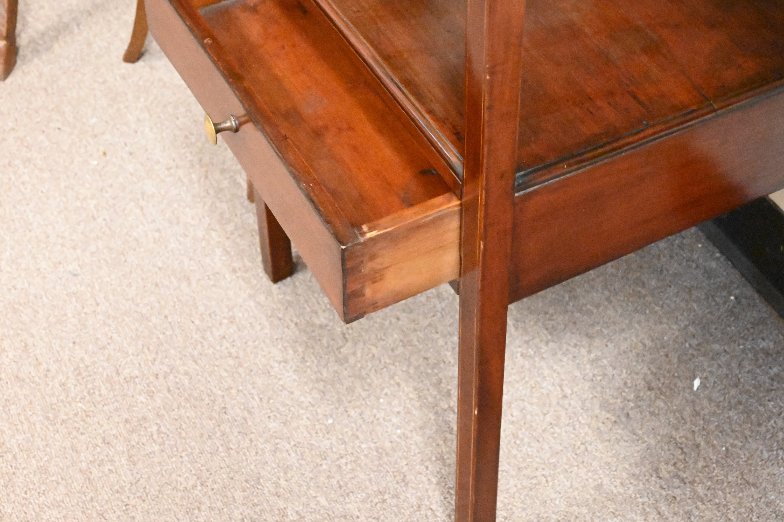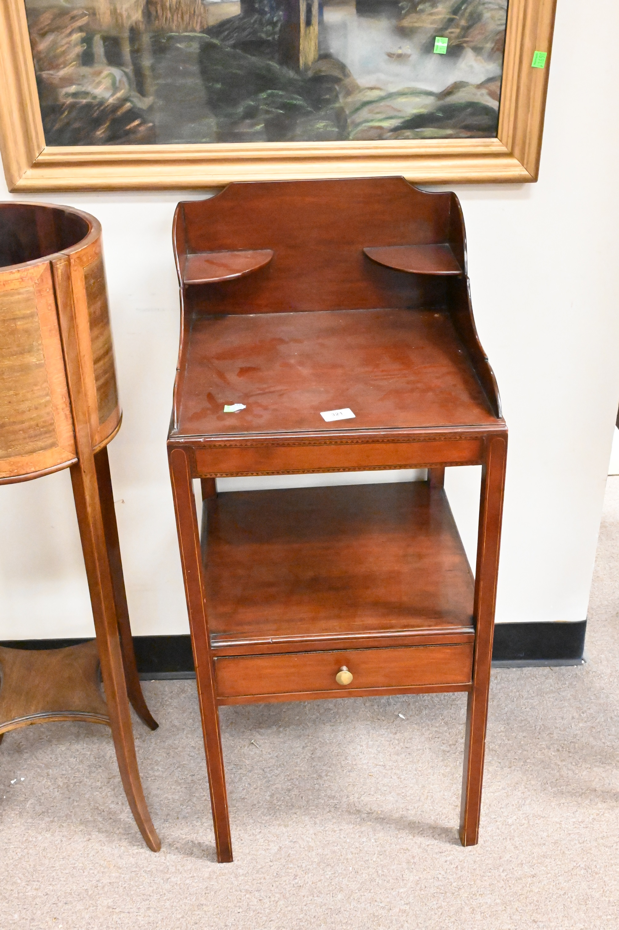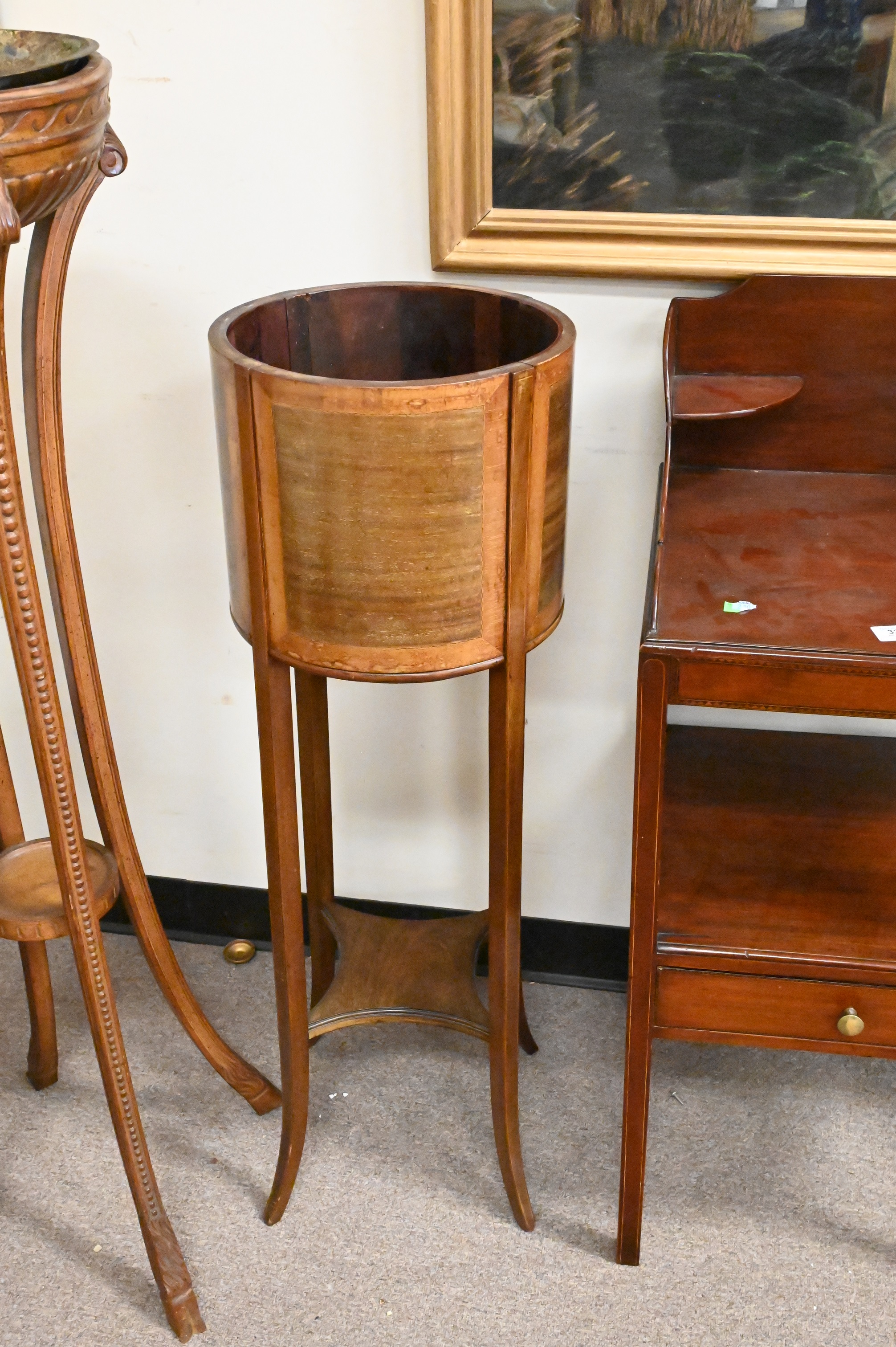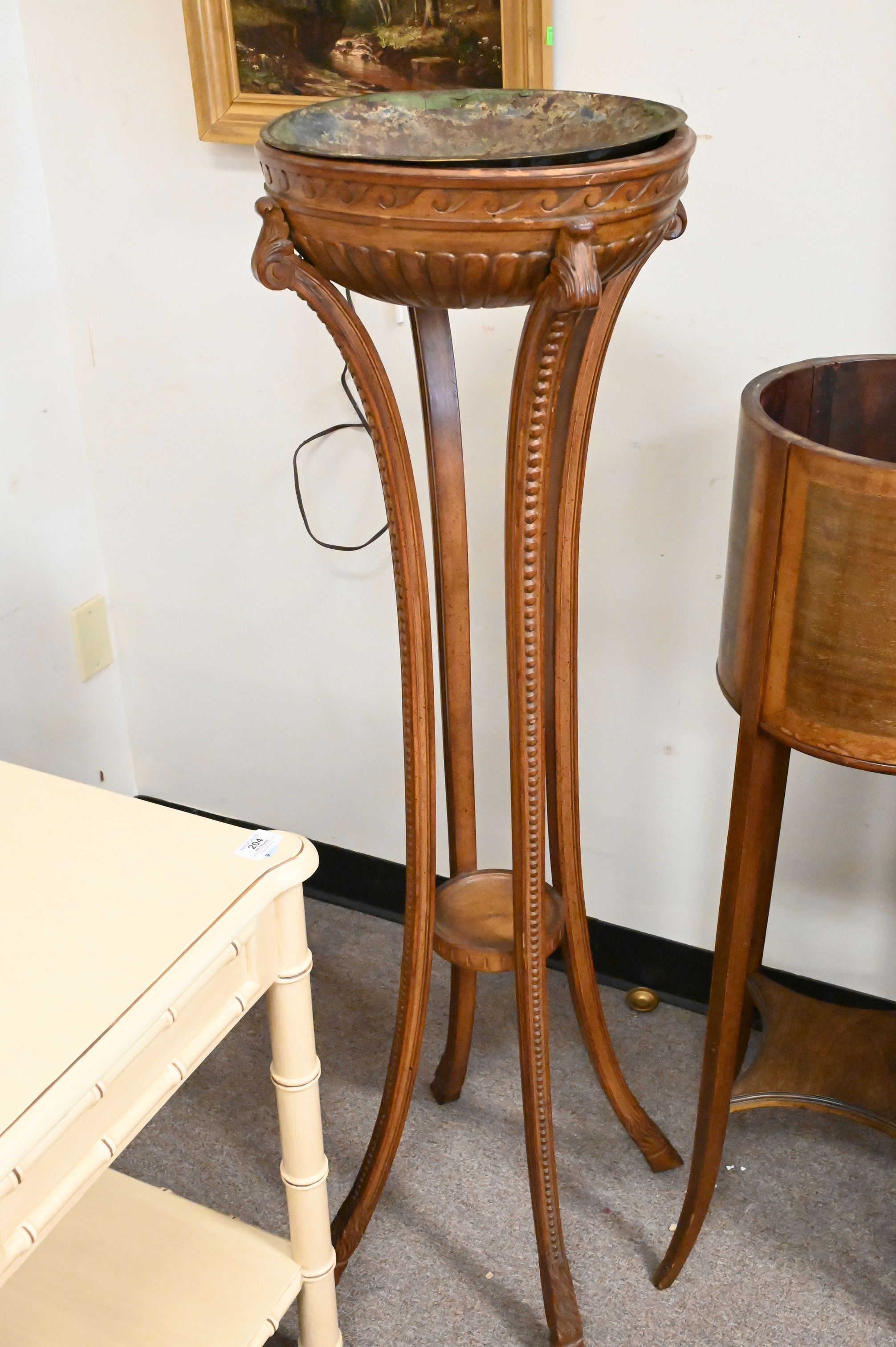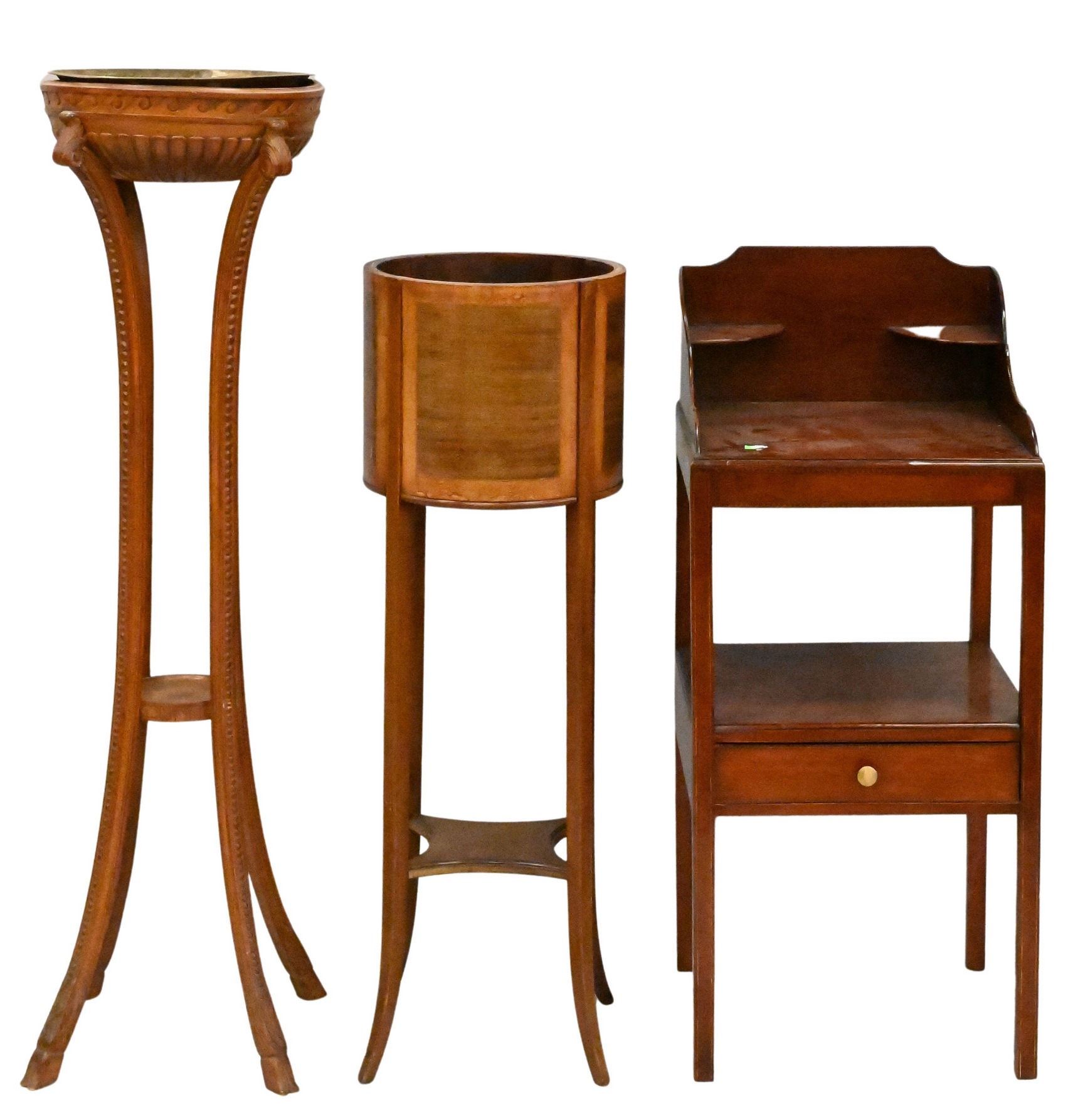 Three Piece Lot, to include inlaid mahogany wash stand, a carved fern stand with copper liner, along with an additional mahogany inlaid planter, tallest fern stand height 47 inches