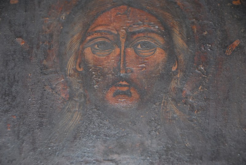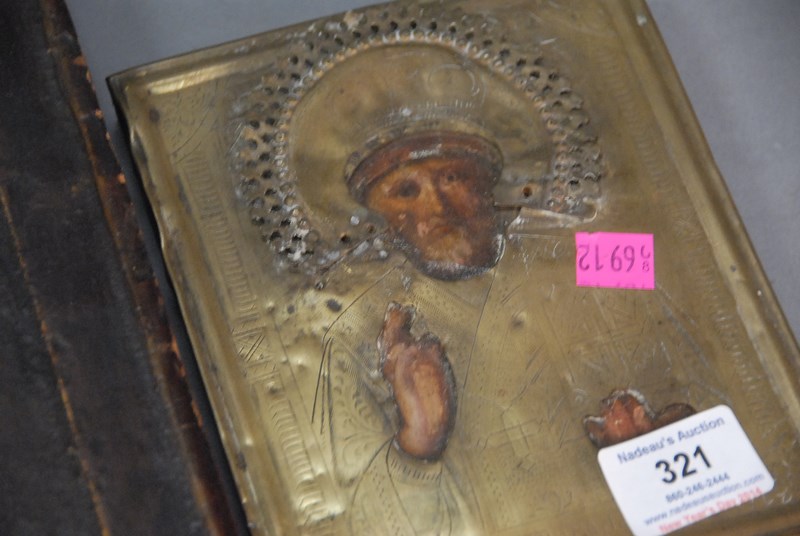 Two Russian Icons on wood panels, one brass trimmed. 12 3/4 x 11 and 7 1/4 x 6