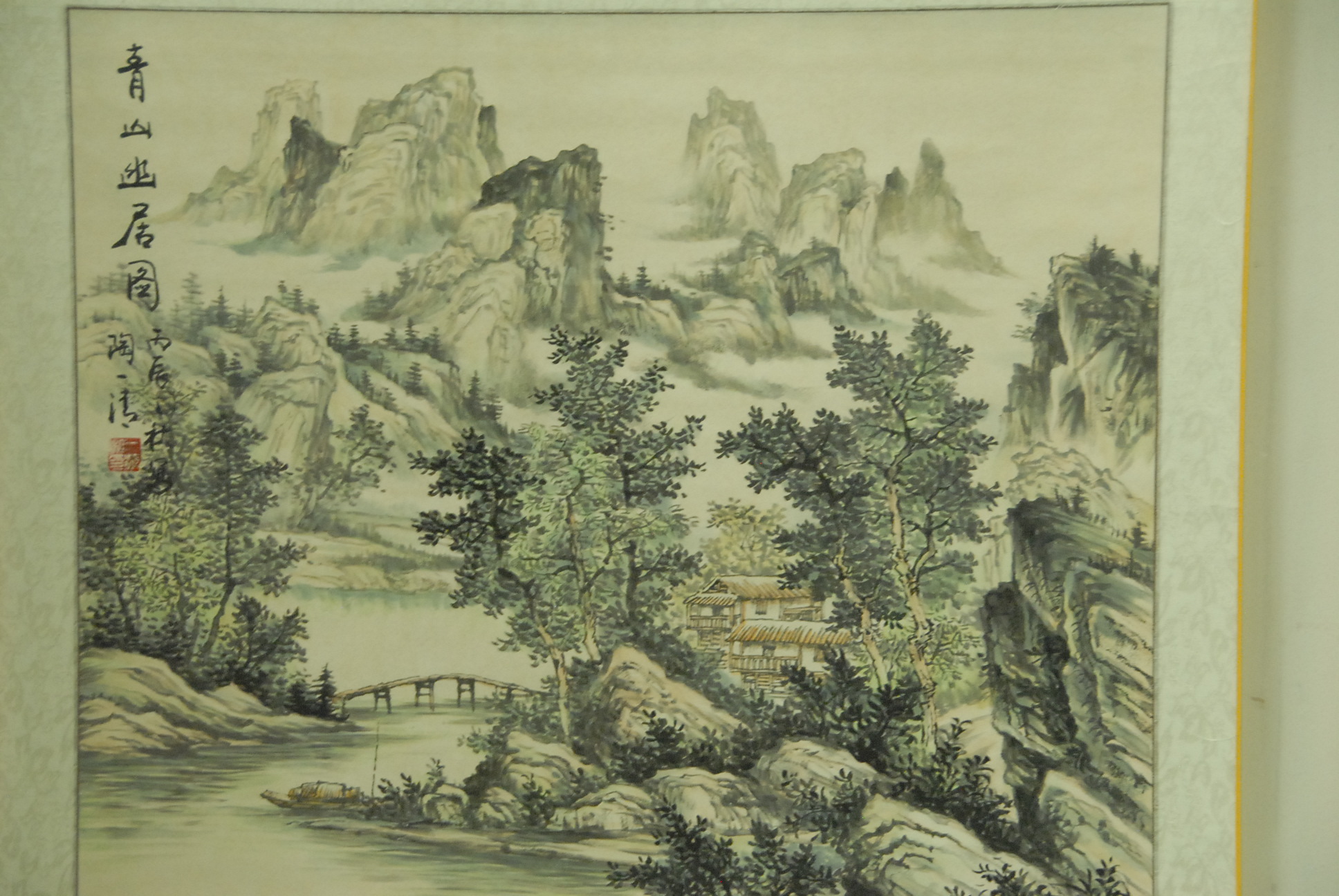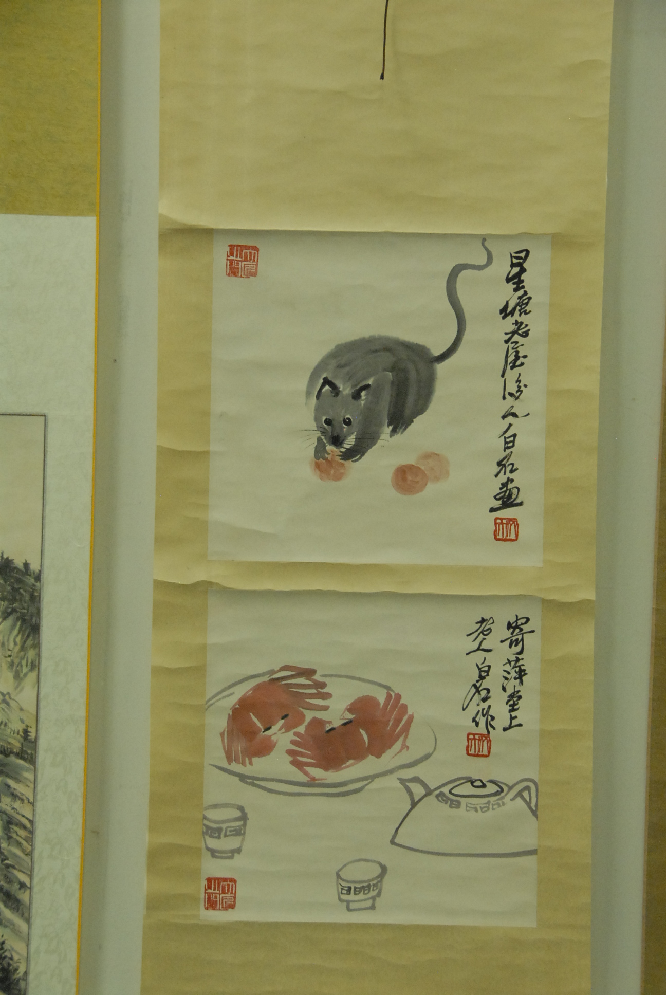 Two scrolls, watercolor landscape and one with watercolor of mouse and crabs.
