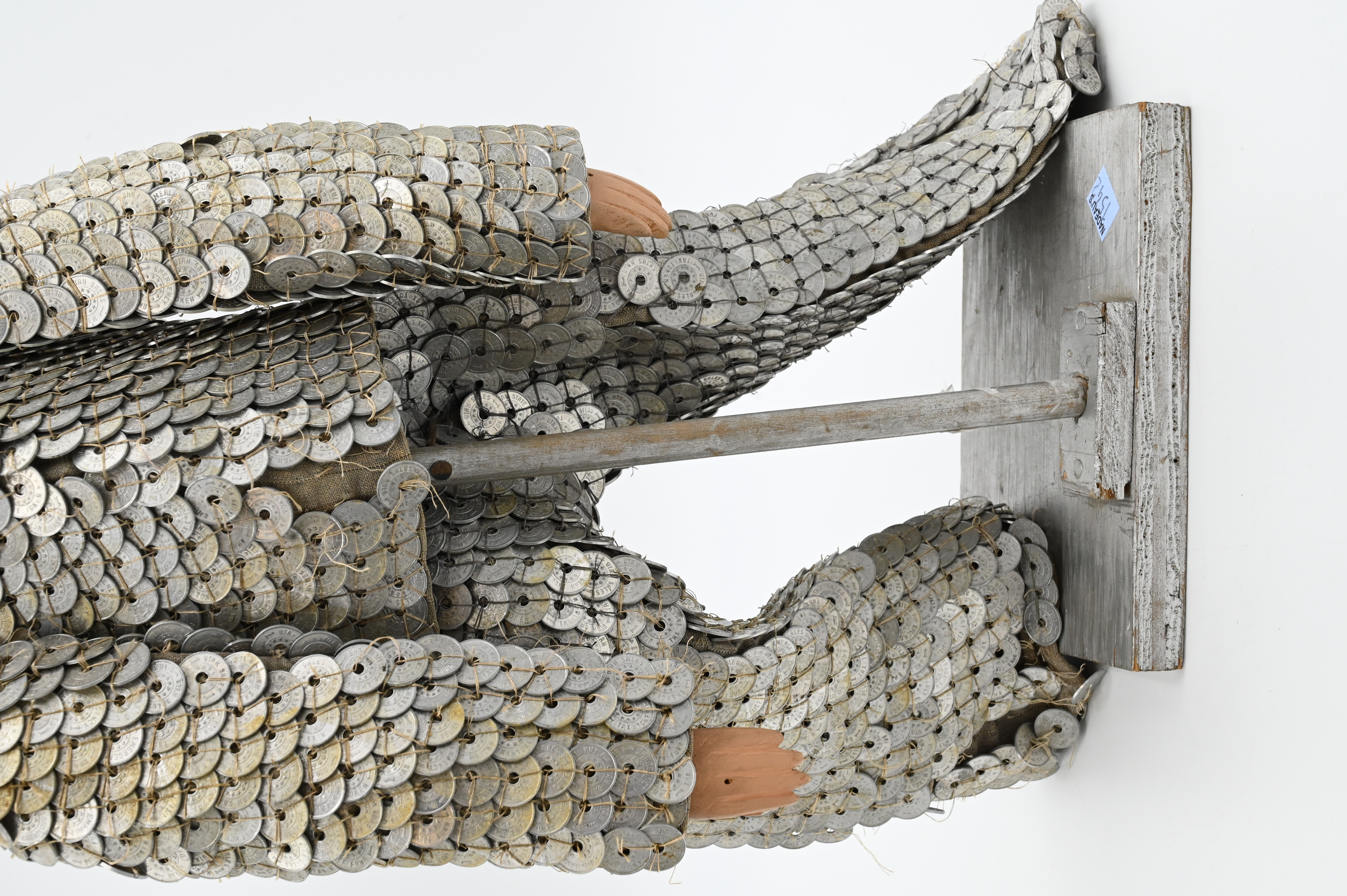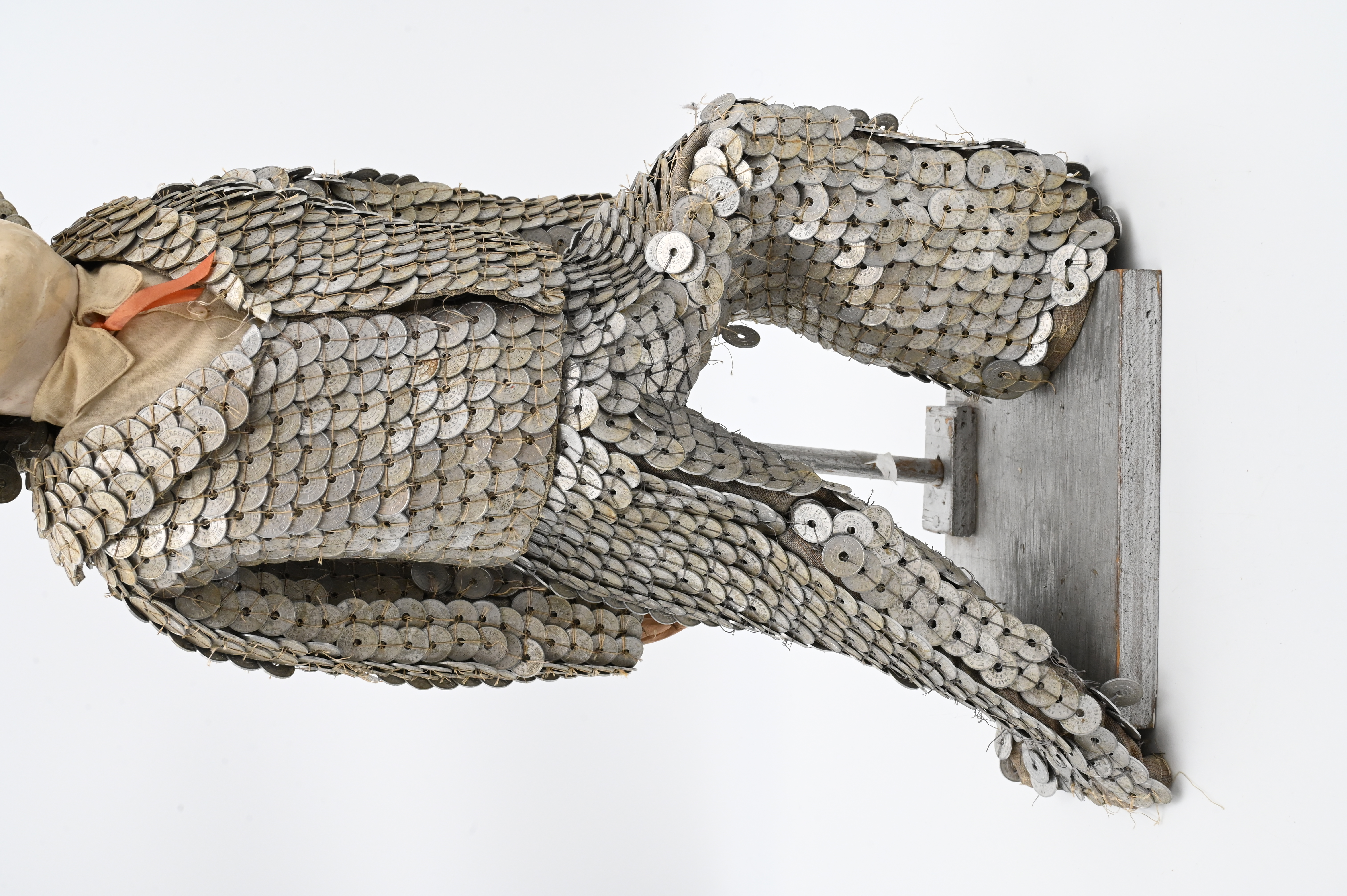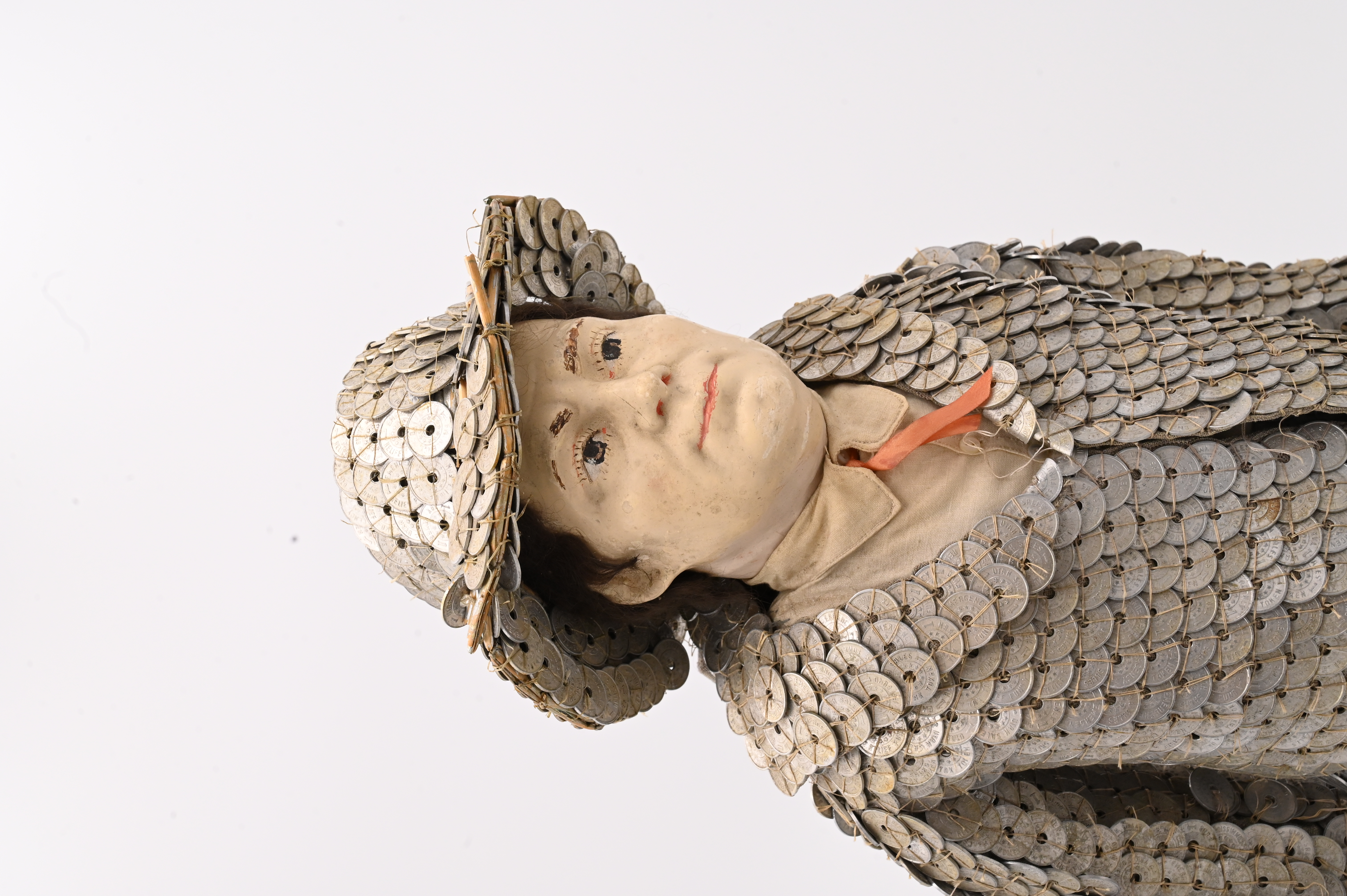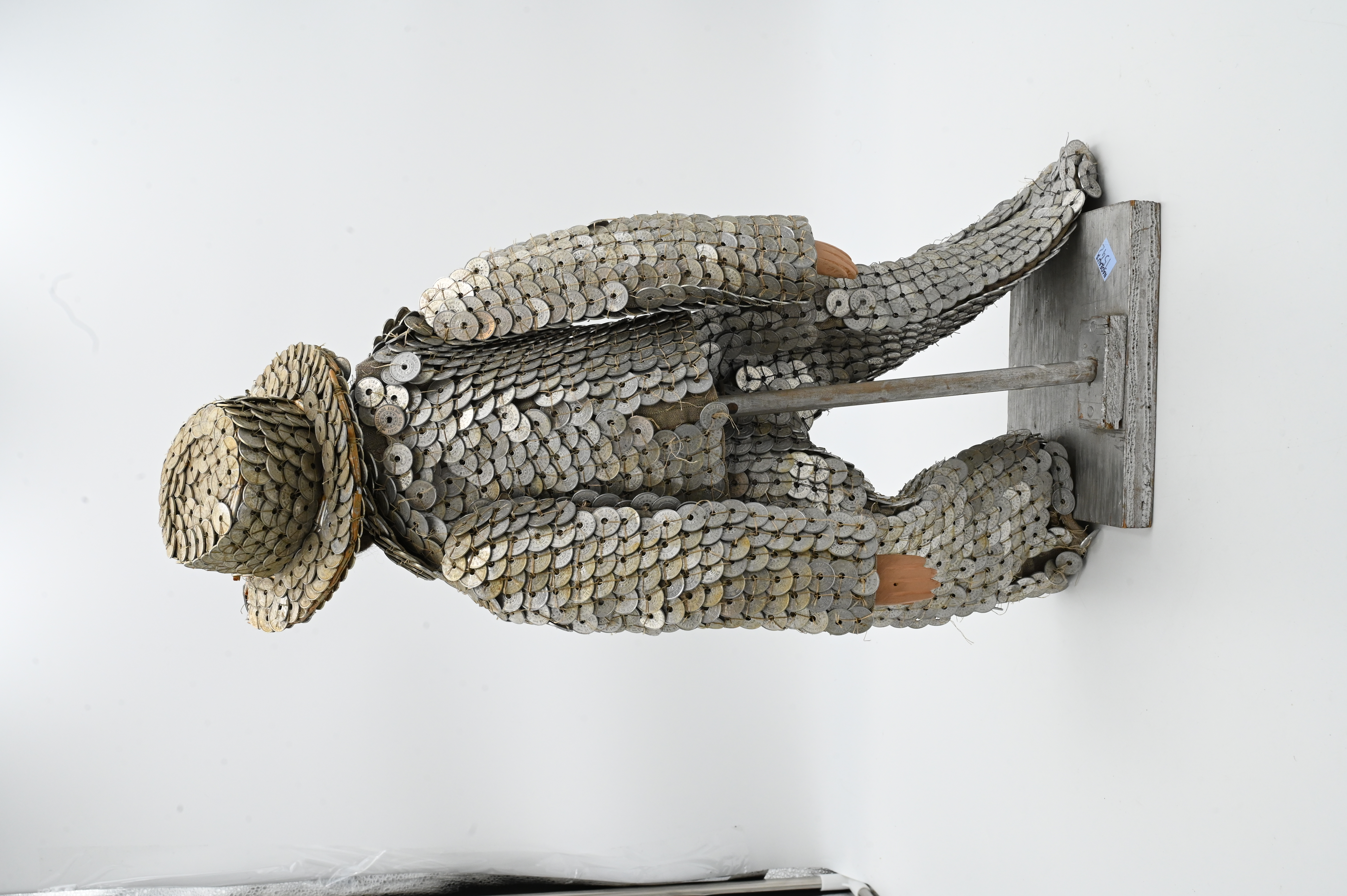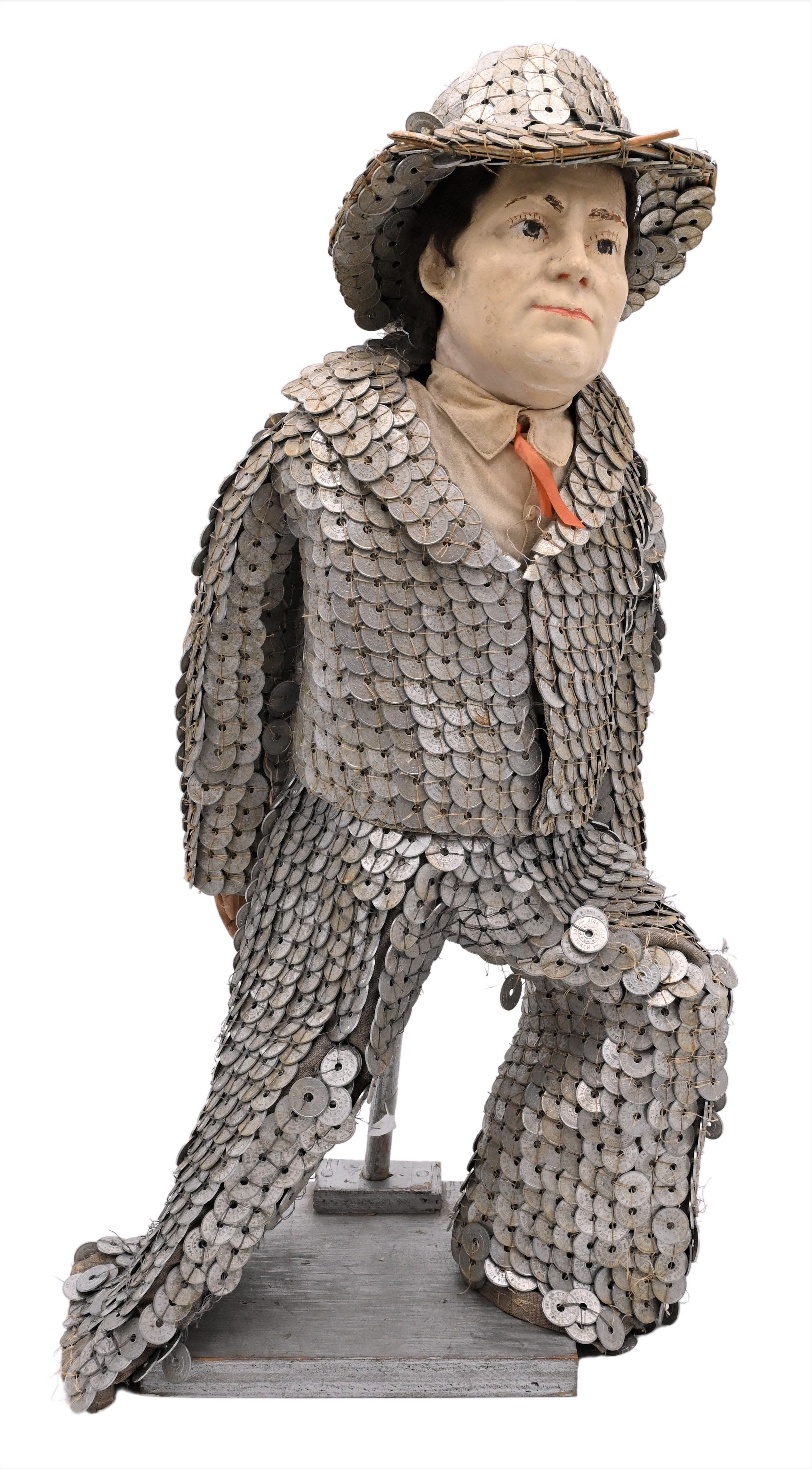 American Cloth Utah Folk Depression Figure, having suit made from Utah sales tax tokens, carved and painted face, hands and feet, height 23 1/4 inches.