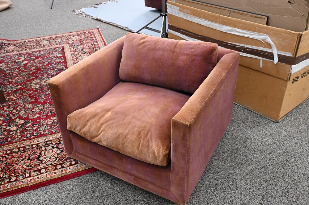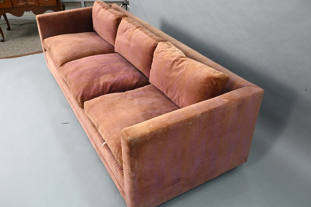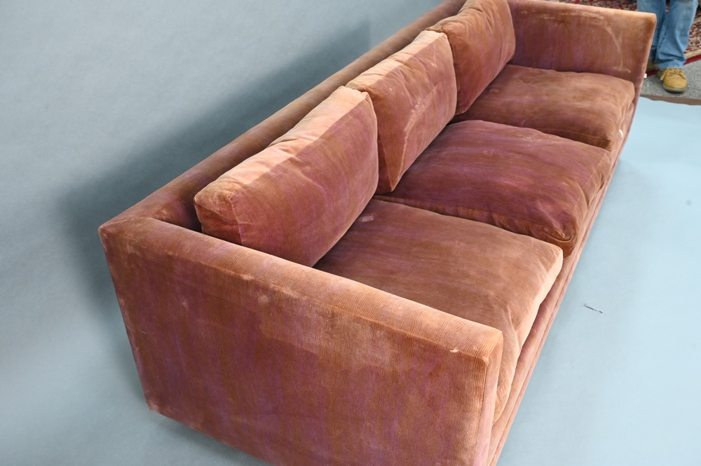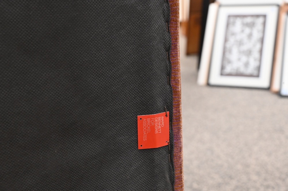 Lot 321A: Two Piece Ward Bennett Designs for Brickel Associates, living room set to include a three cushion upholstered sofa along with a matching arm chair, sofa length 84 inches.