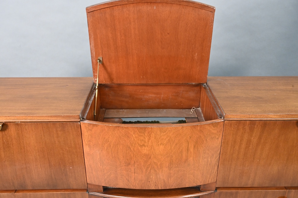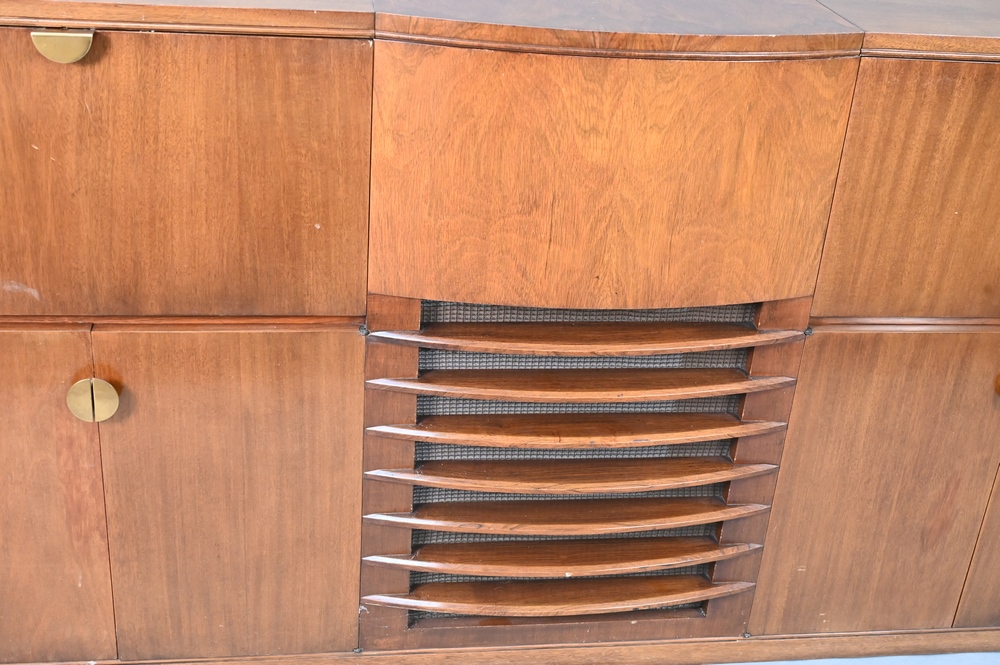 Lot 321B: Art Deco Stereo Cabinet, having lift top center and brass hardware, height 36 inches, top 17 1/2″ x 78″.