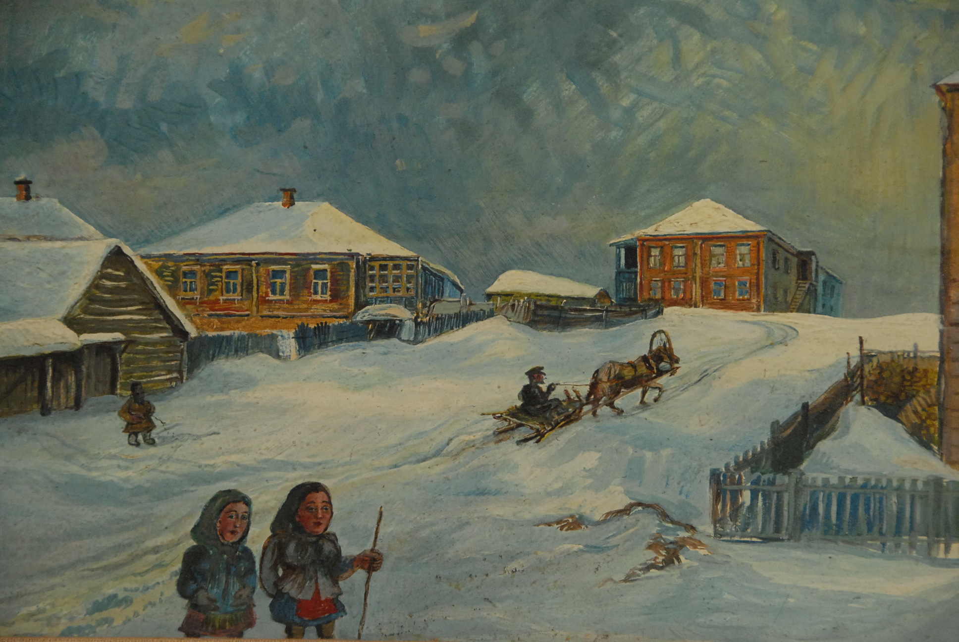 Lot 321B: David Davidovich Burliuk 1882-1967 WINTER MOUNTAIN TOWN, UREL oil on masonite signed and titled lower right Burliuk 10 5/8 x 16 3/8