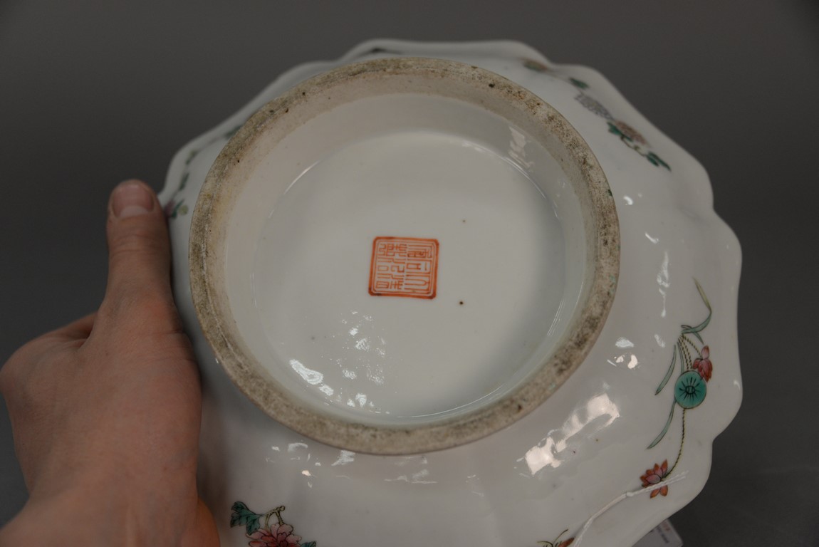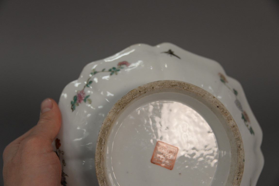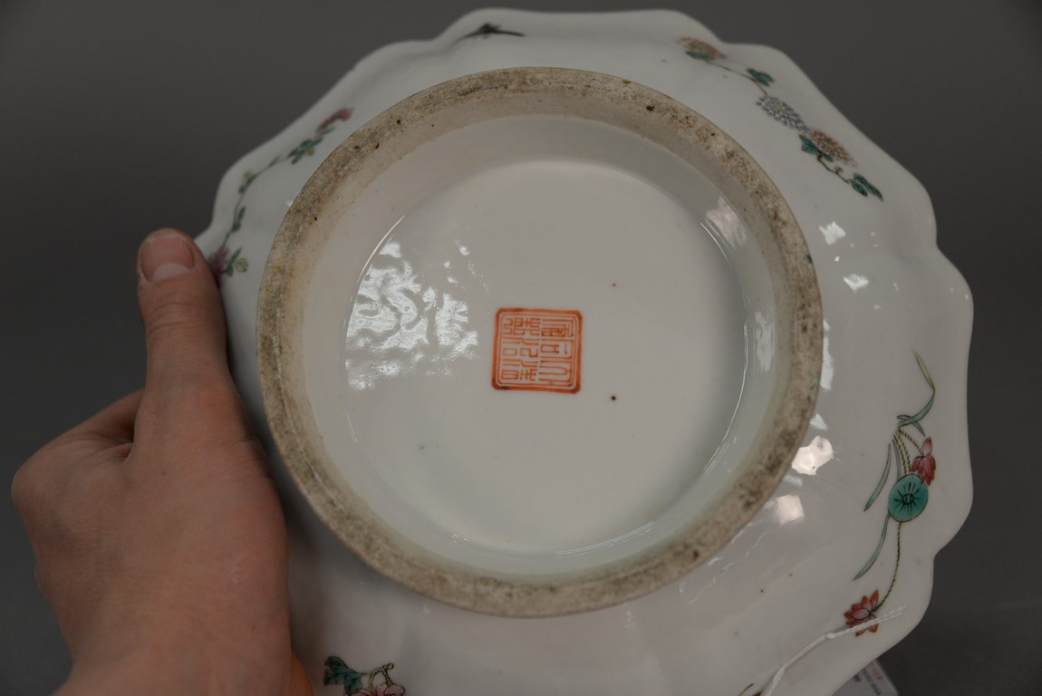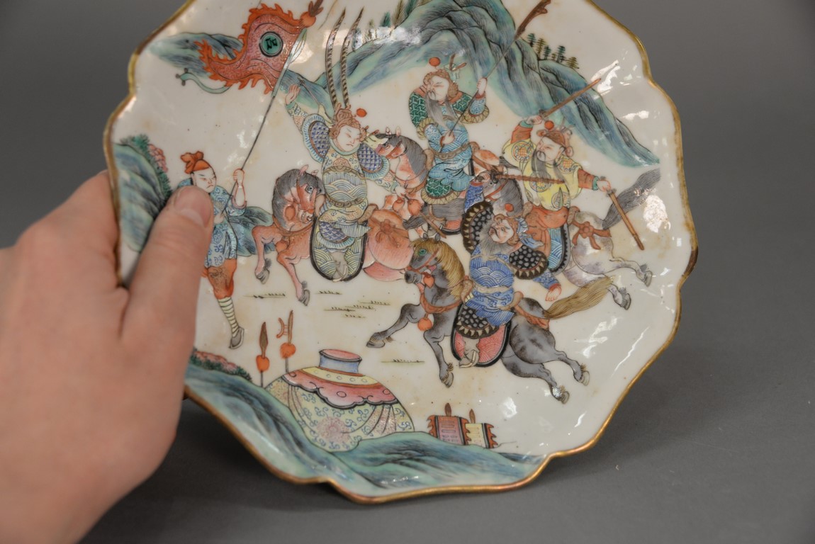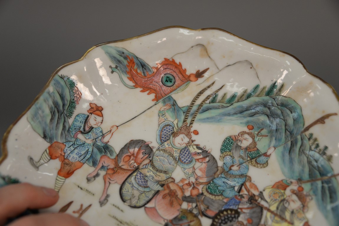Lot 322: 19th Century Chinese porcelain footed scallop edge dish having enameled scene with four warriors on horseback with landscape background, Tongzhi mark on bottom as is, with piece available. ht. 2 1/4 in. dia. 9 1/4 in.