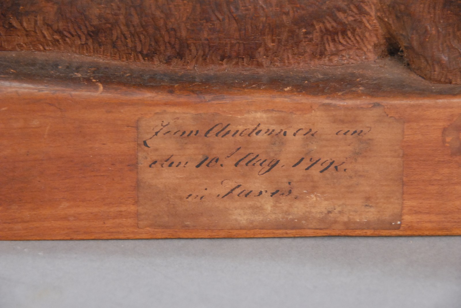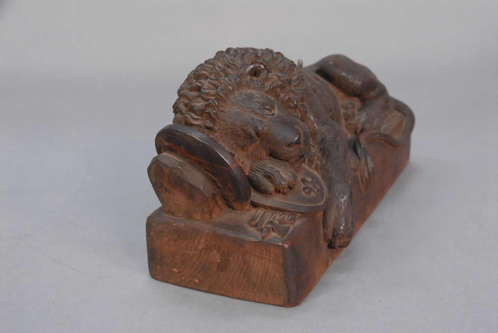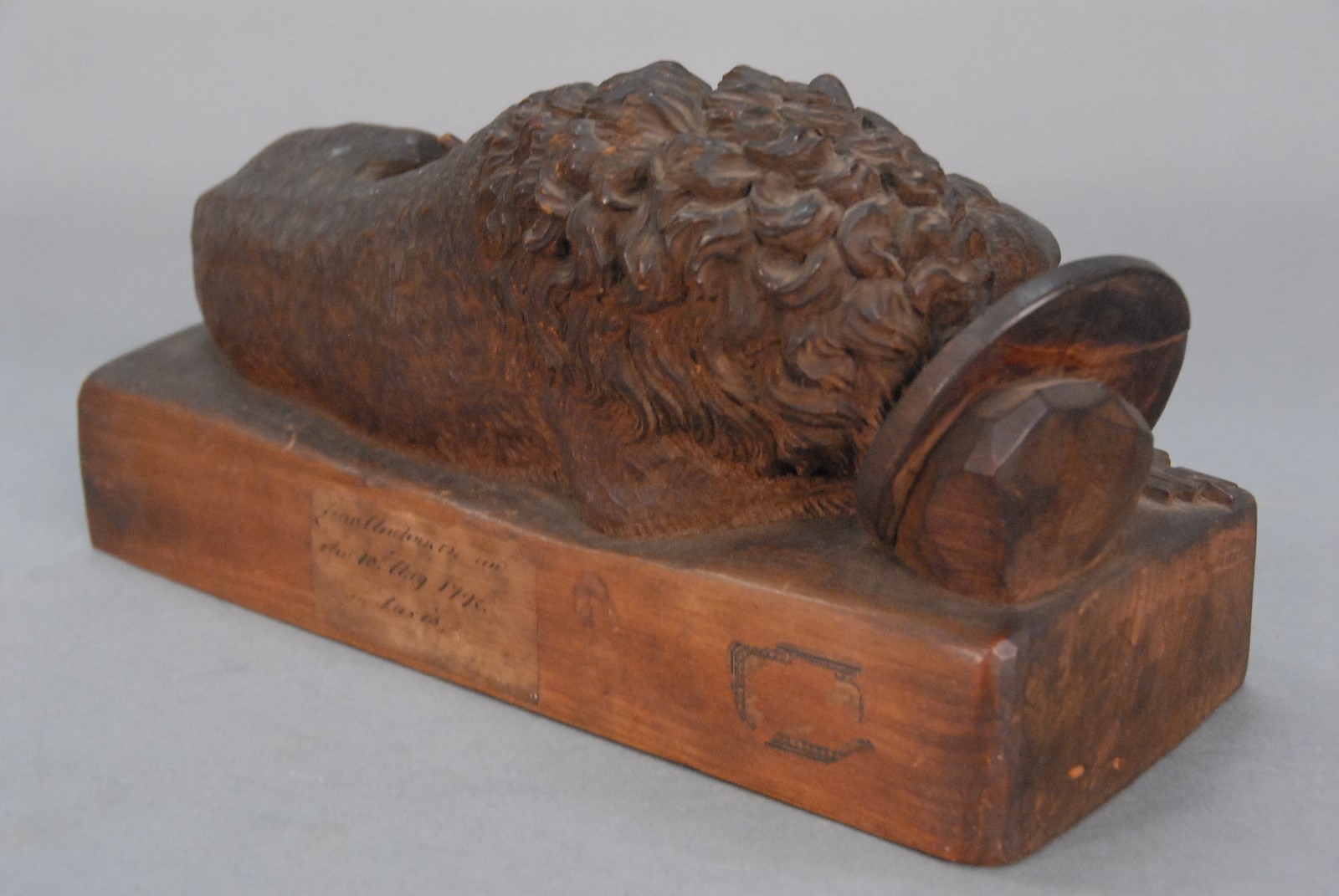 Continental carved lion with arrow piercing side, marked on paper label Jean Anderson, August 1796 Paris. ht. 5 in., lg. 10 1/2 in.