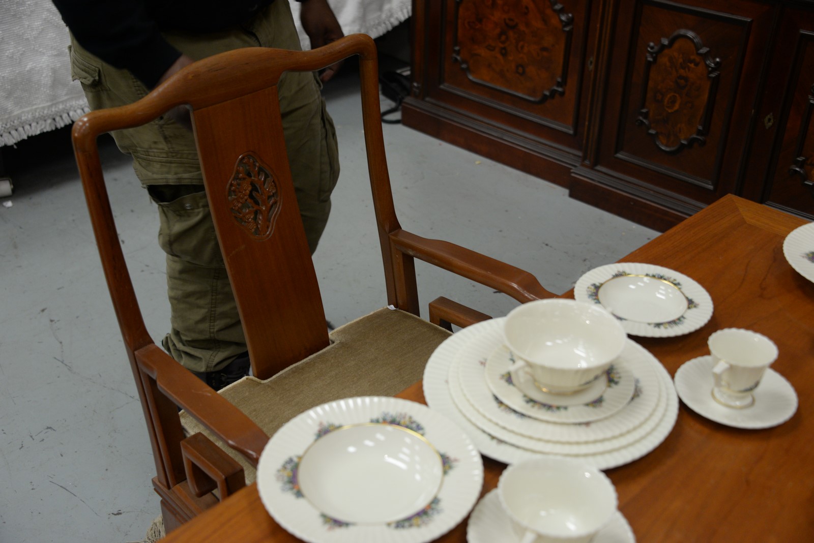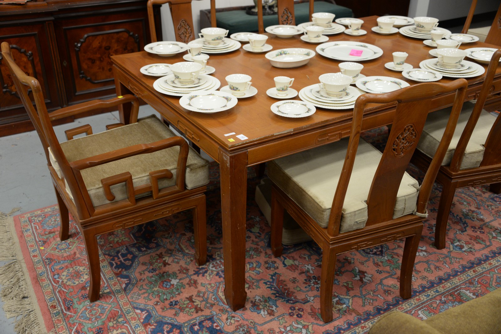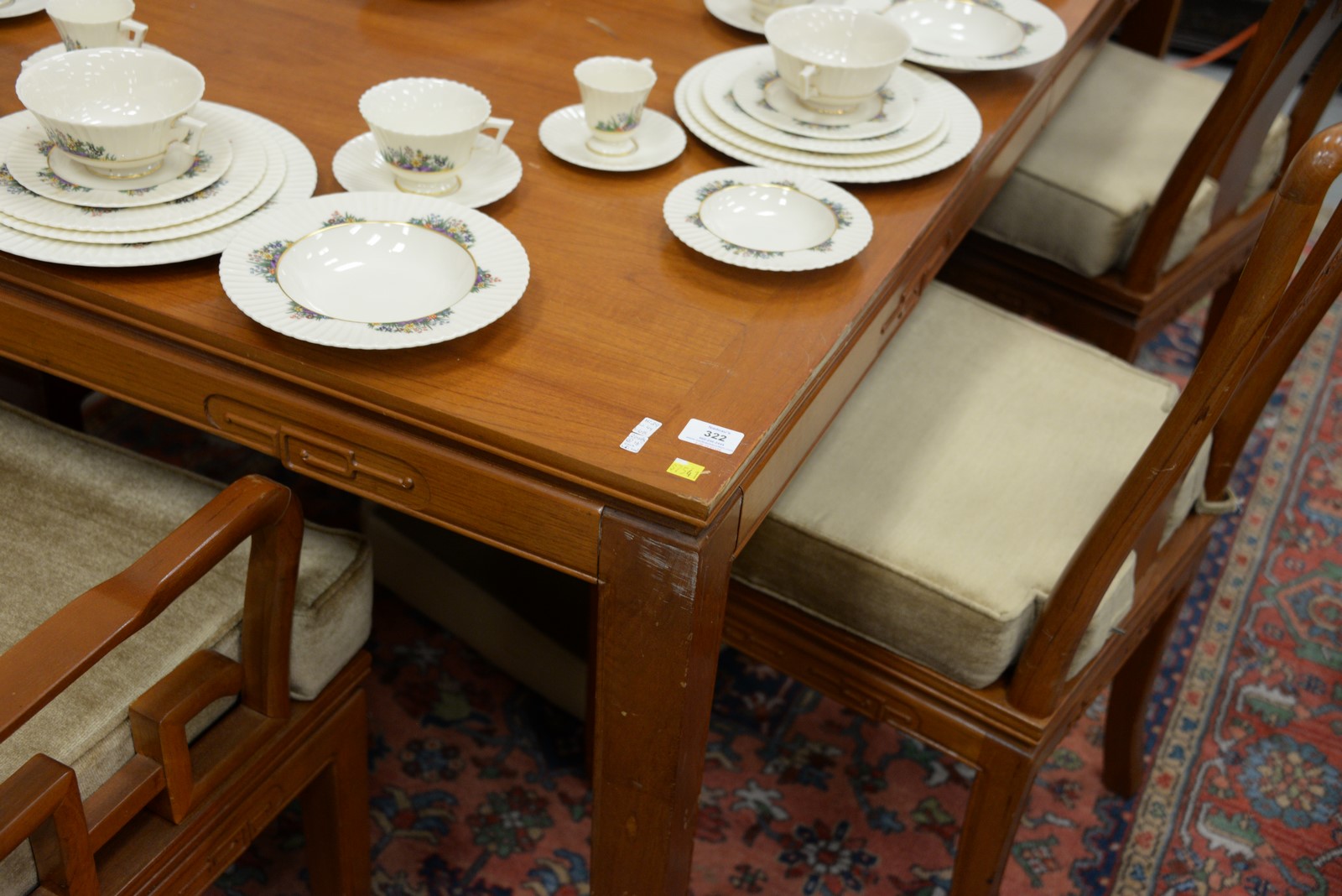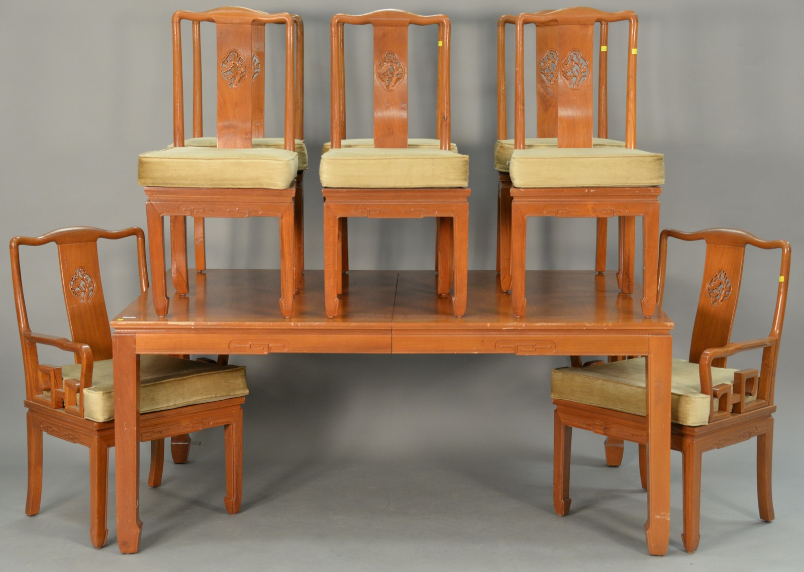 Lot 322: Dining table with two 18 inch leaves and eight Chinese style chairs.ht. 29 in. top: 44 x 68 opens to 104 in.