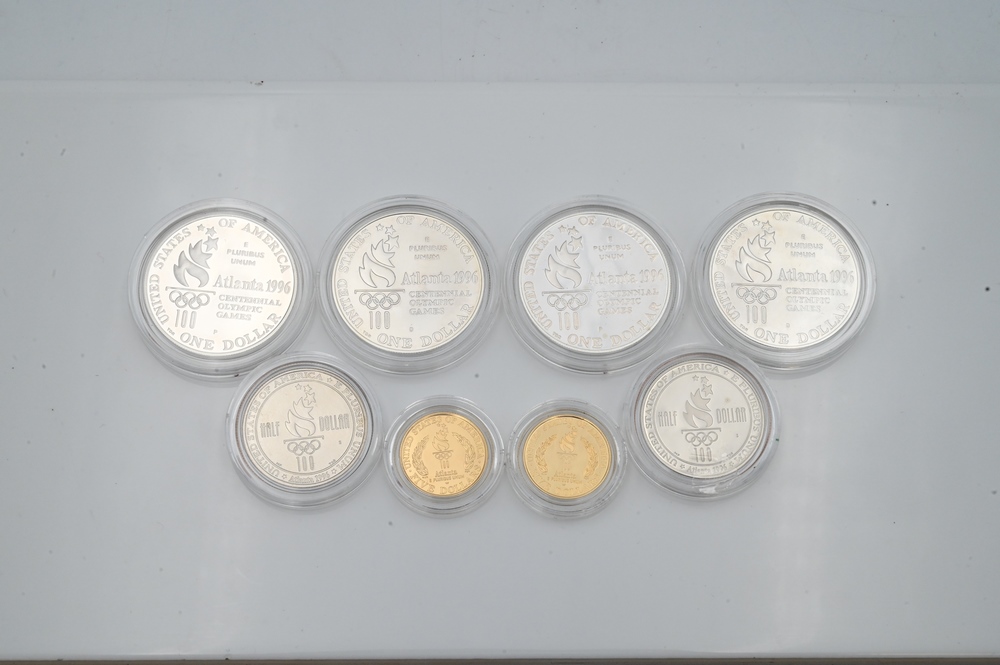Eight Piece Coin Lot, to include two 5 dollar gold, one uncirculated and one proof, along with four 1996 Atlanta Olympics coins, to include two copper/nickel half-dollars (one uncirculated and one proof).