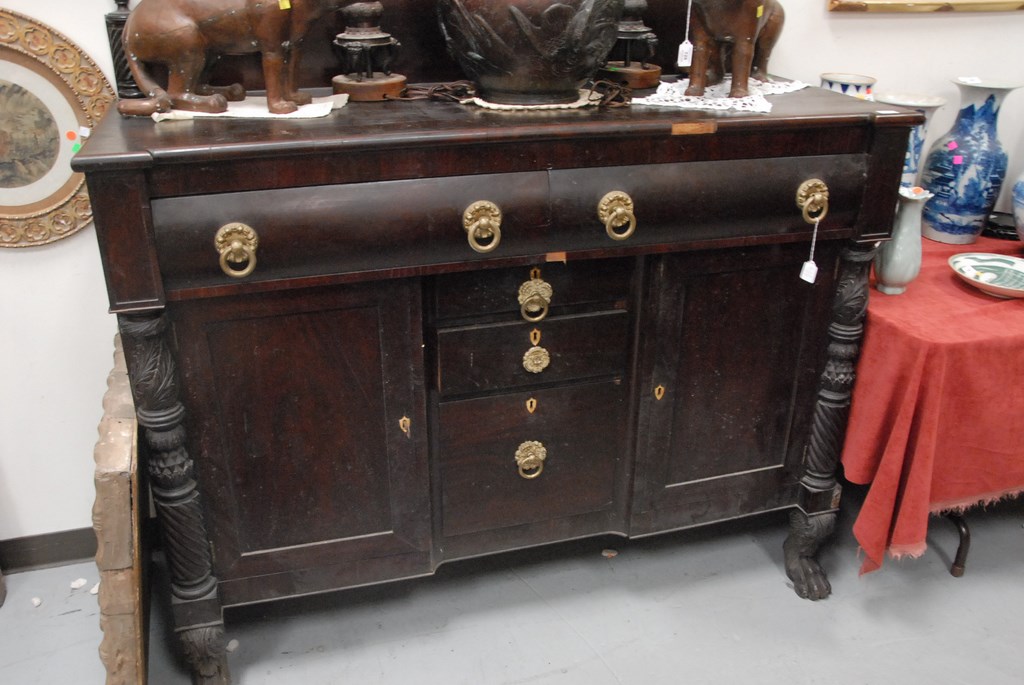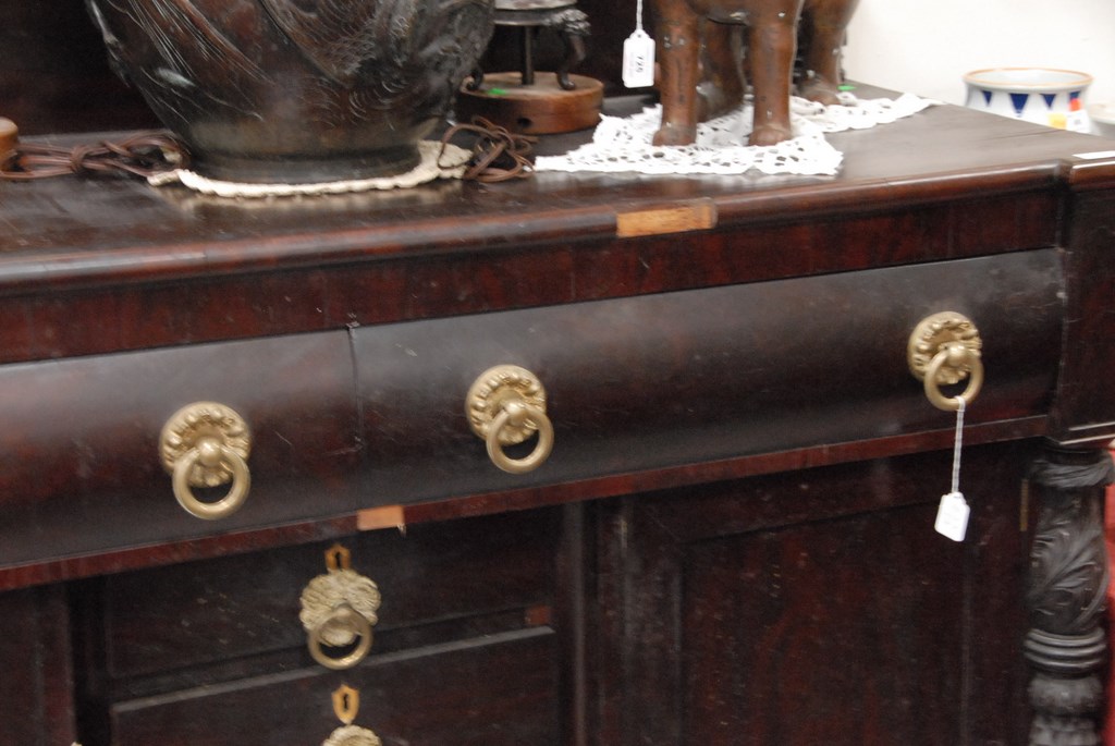 Lot 322: Federal mahogany sideboard, two drawers over three short drawers flanked by two doors with acanthus carved columns, paw feet, and la…