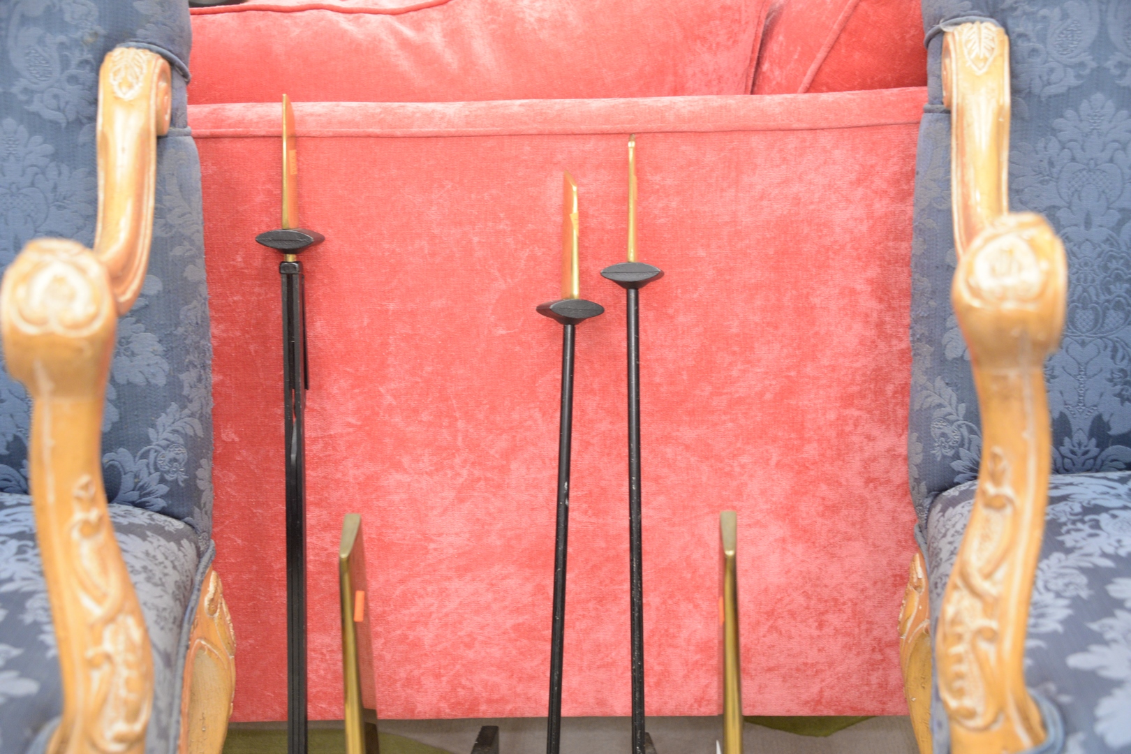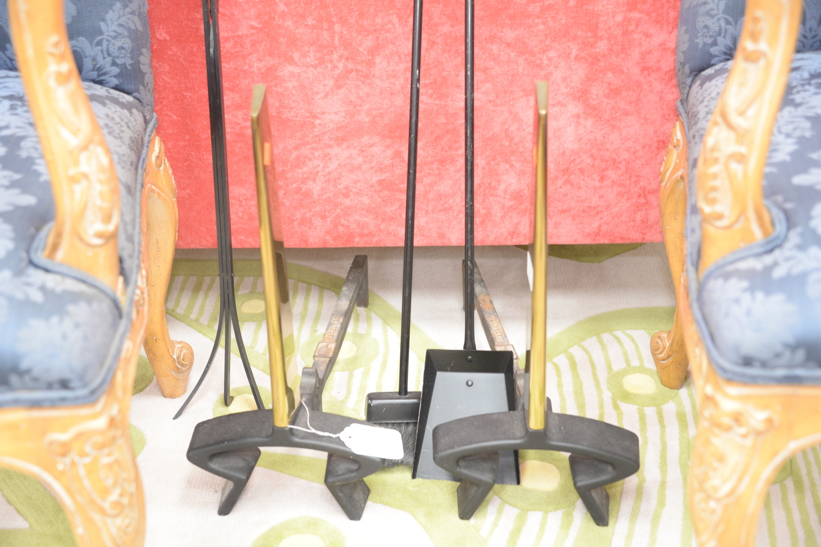 Lot 322: Five Piece Fireplace Set, Donald Deskey Bennett, cast iron and brass, having pair of andirons, brush, shovel along with a poker, height 19-1/2 inches.
