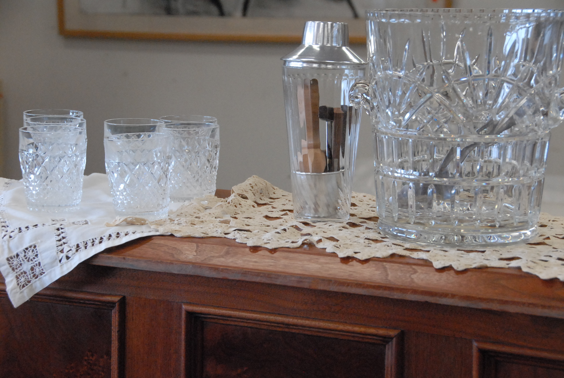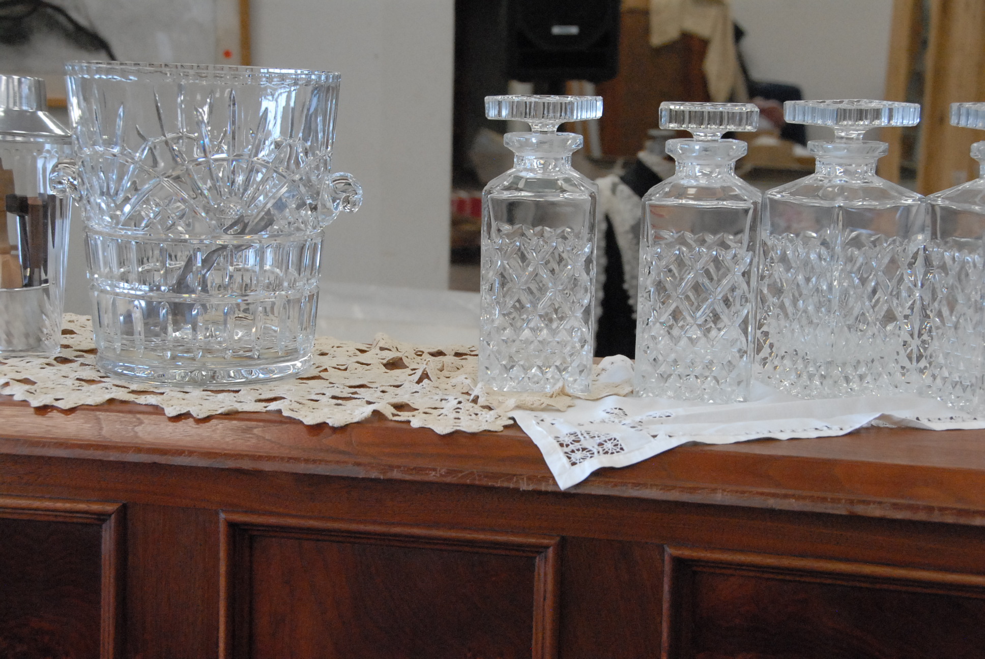 Globe/bar along with four decanters, crystal ice bucket, and some glasses.