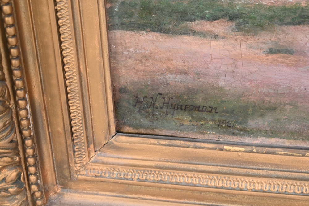 Lot 322: Herman N. Hyneman (1849 – 1907), Sunday Morning, oil on canvas, signed lower left H.N. Hyneman, in Victorian frame, 36″ x 24″. Prove…